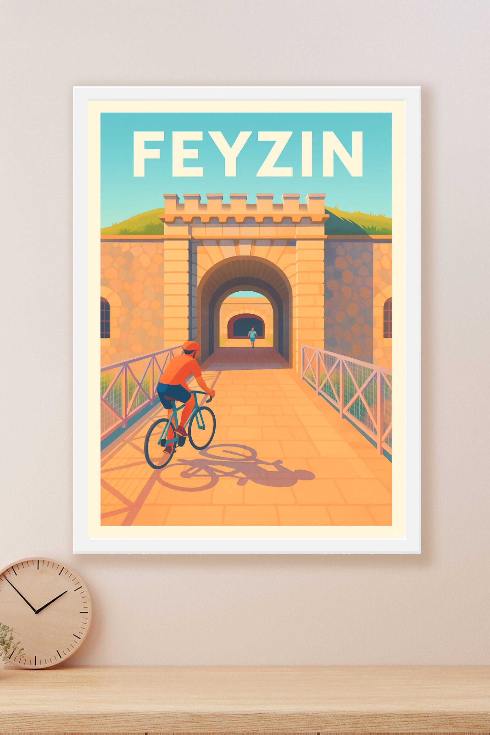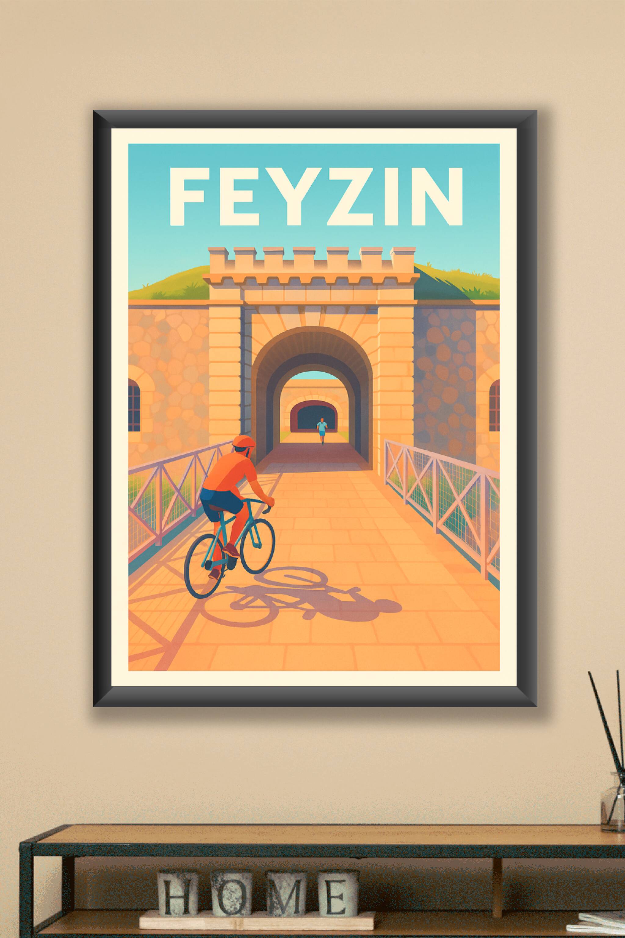 Découvrez l'élégance intemporelle de Feyzin avec cette affiche illustrée mettant en scène une promenade à vélo vers la citadelle historique de la v...