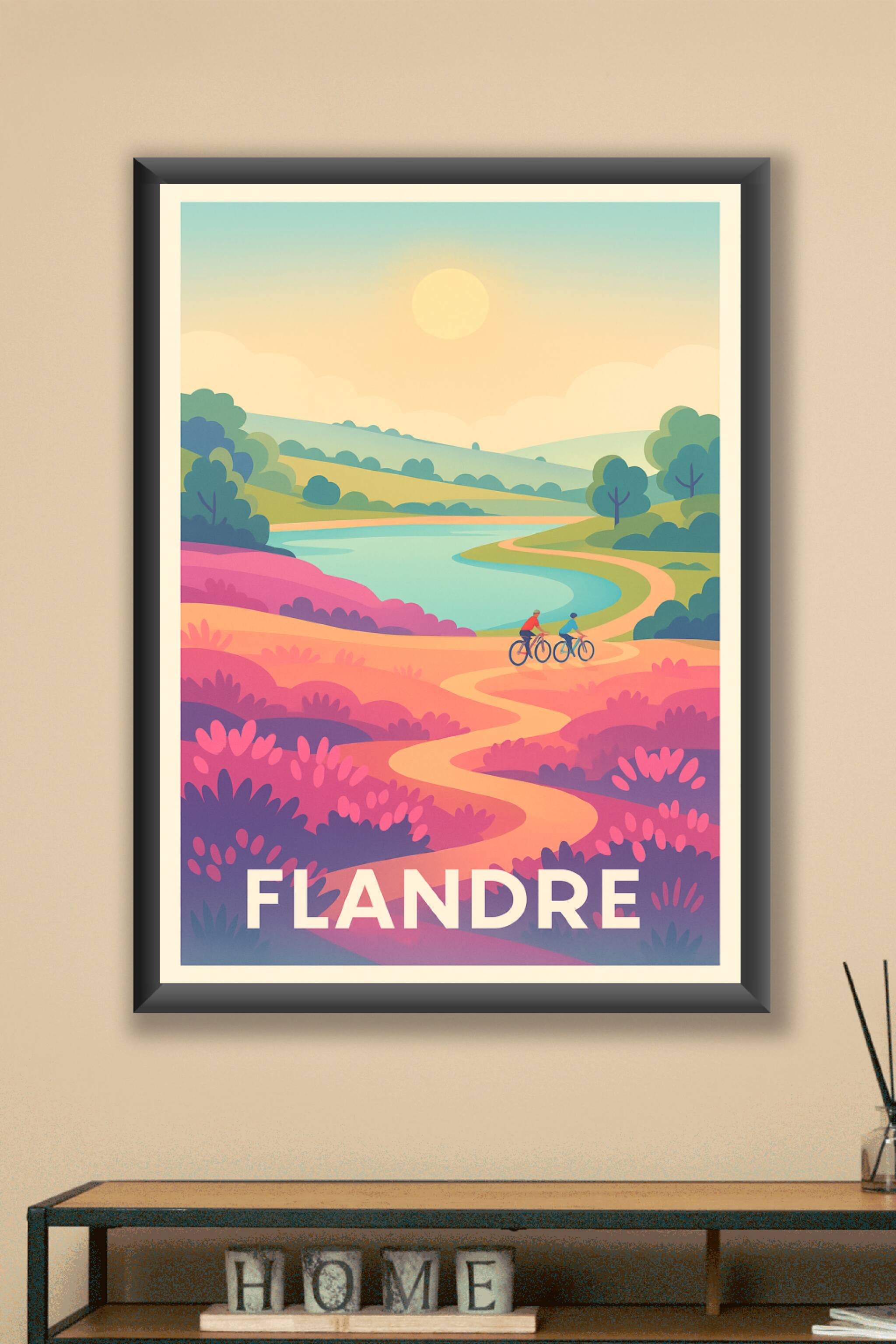 Découvrez la douceur et la sérénité des paysages flamands avec cette affiche illustrée aux tons pastel qui évoque une promenade à vélo au cœur de l...