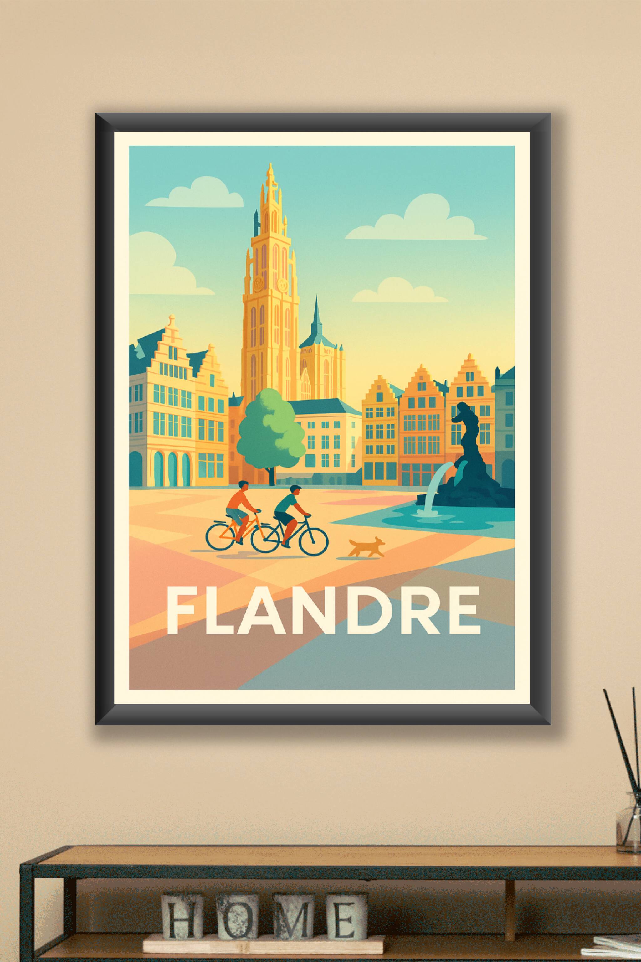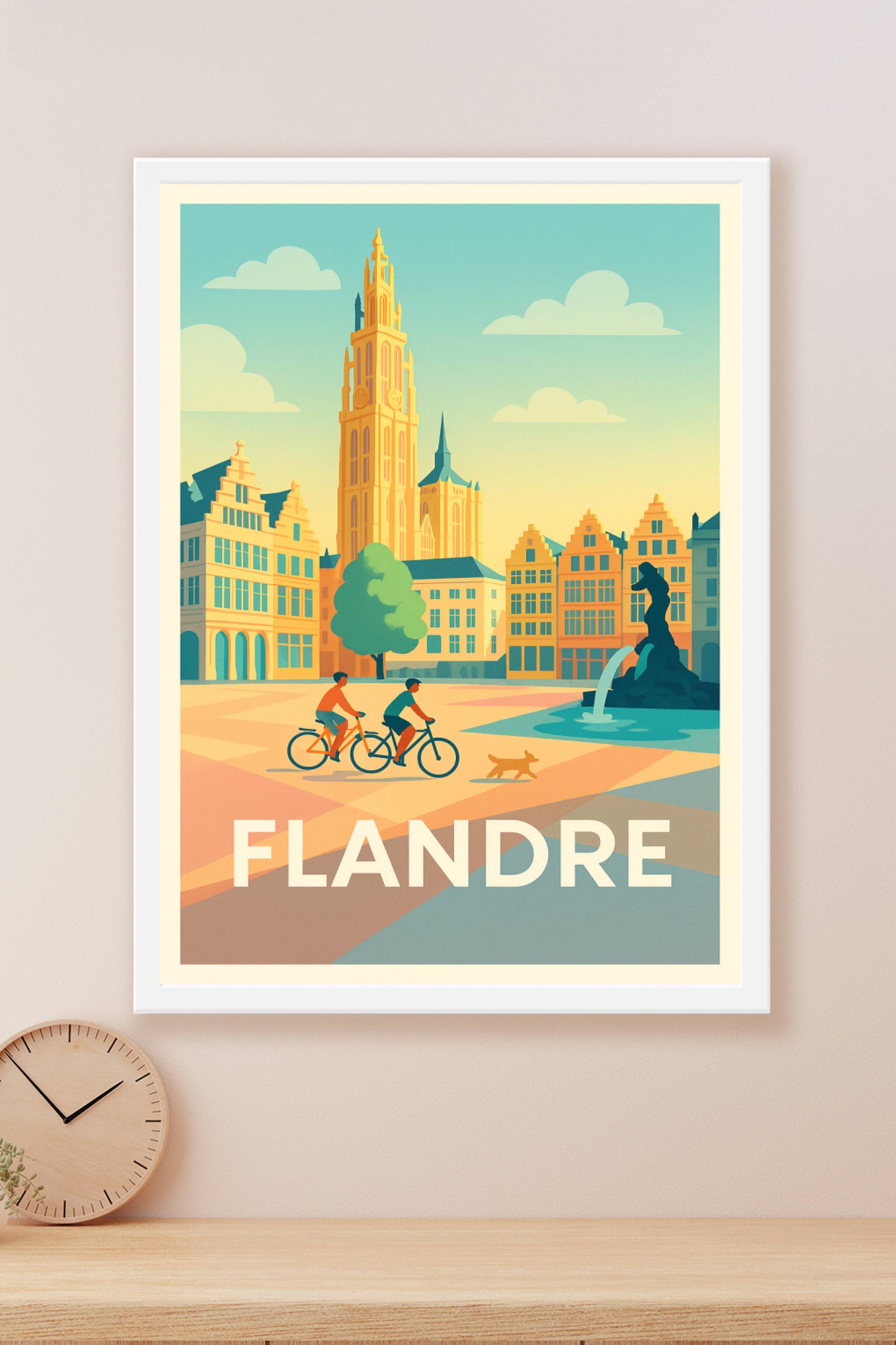 Découvrez le charme envoûtant de la Flandre avec cette affiche au style rétro illustrant une place emblématique baignée de lumière dorée. Ce poster...