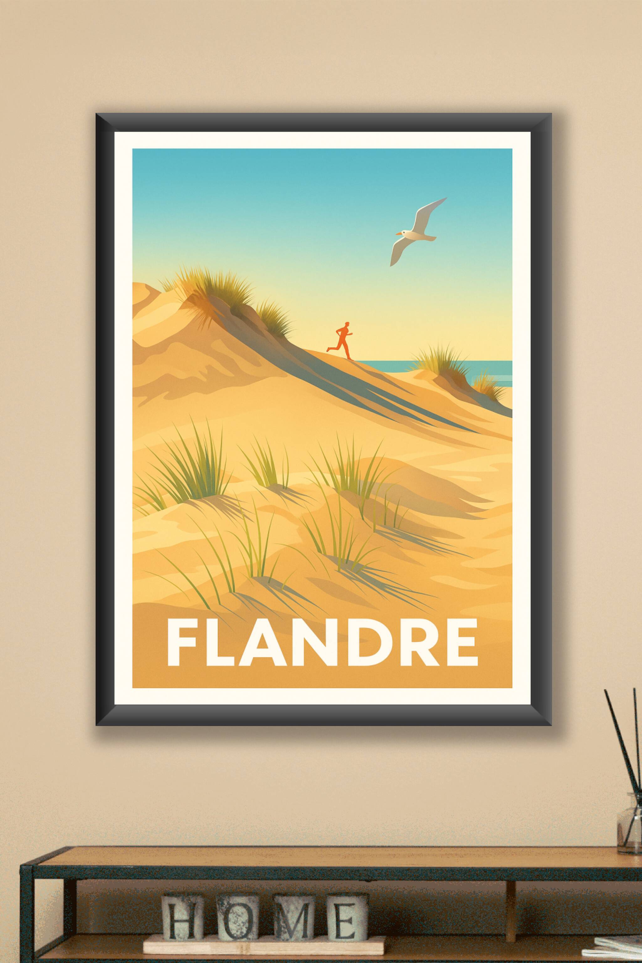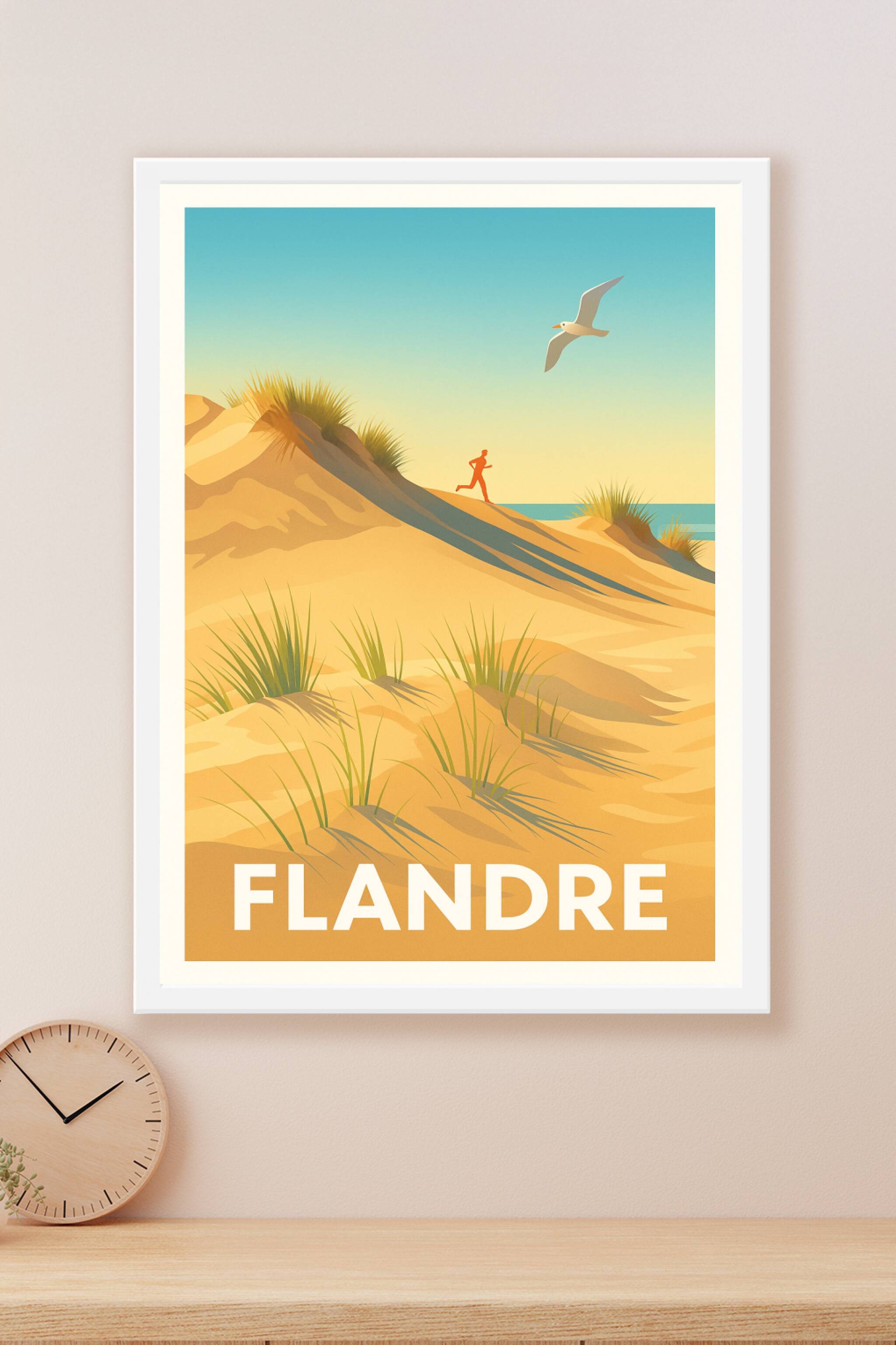 Évadez-vous sur les dunes ensoleillées de la Flandre avec cette affiche au style vintage et épuré. L'illustration met en scène une silhouette coura...