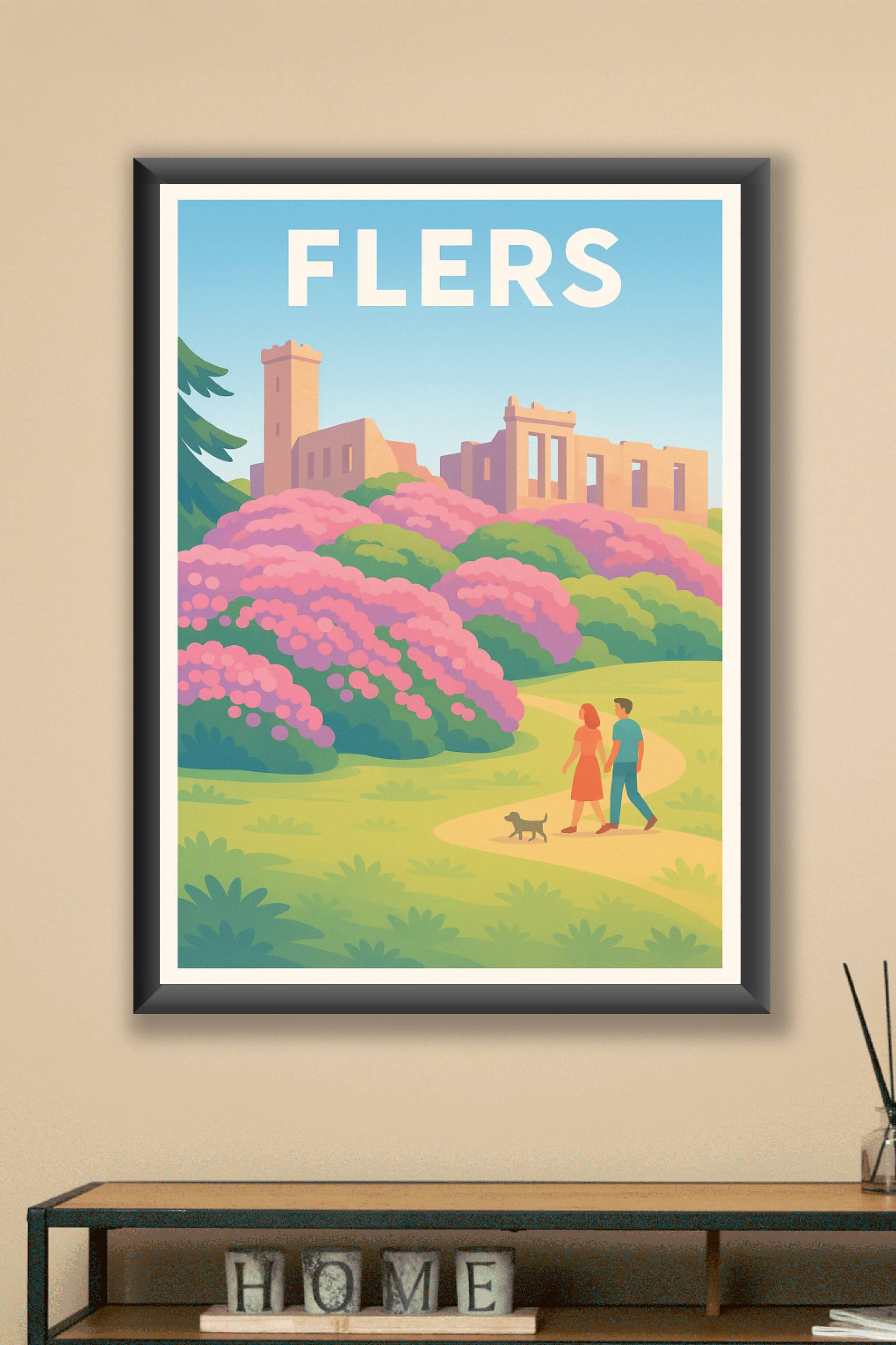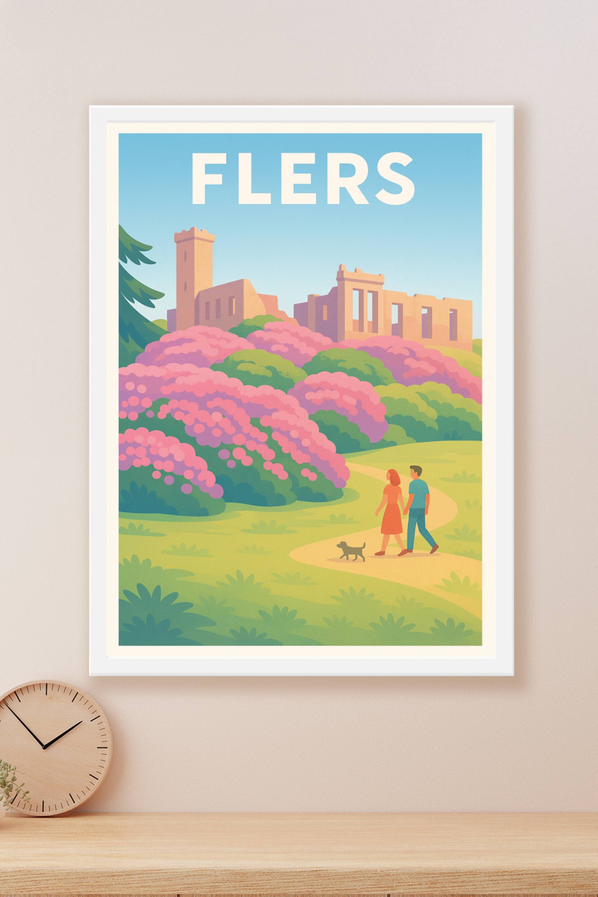 Découvrez le charme bucolique de Flers à travers cette affiche illustrée aux teintes douces et apaisantes. Le poster met en scène une balade paisib...