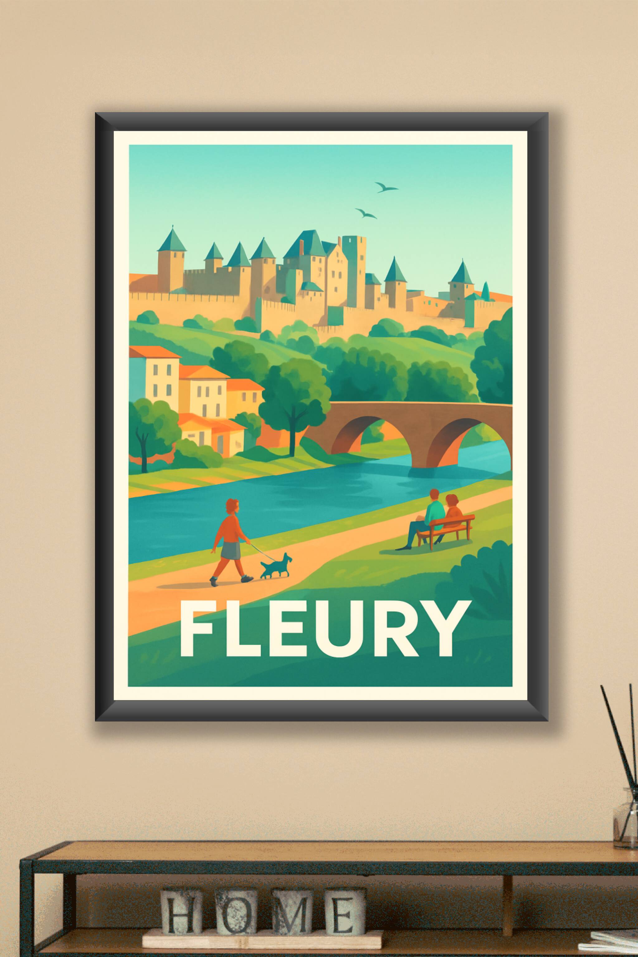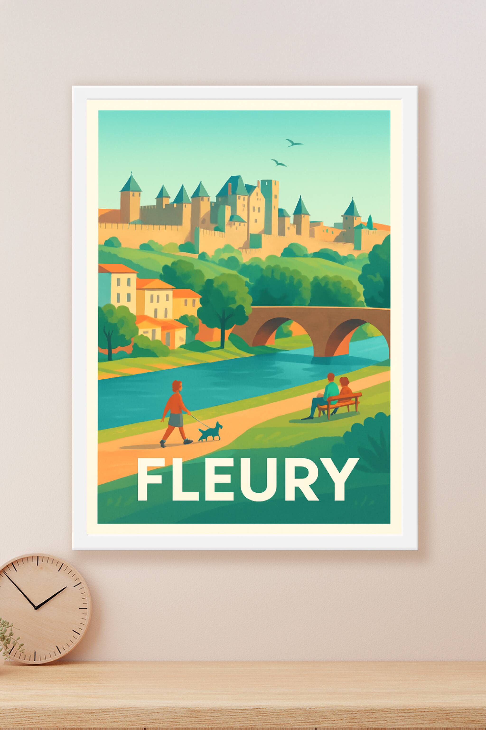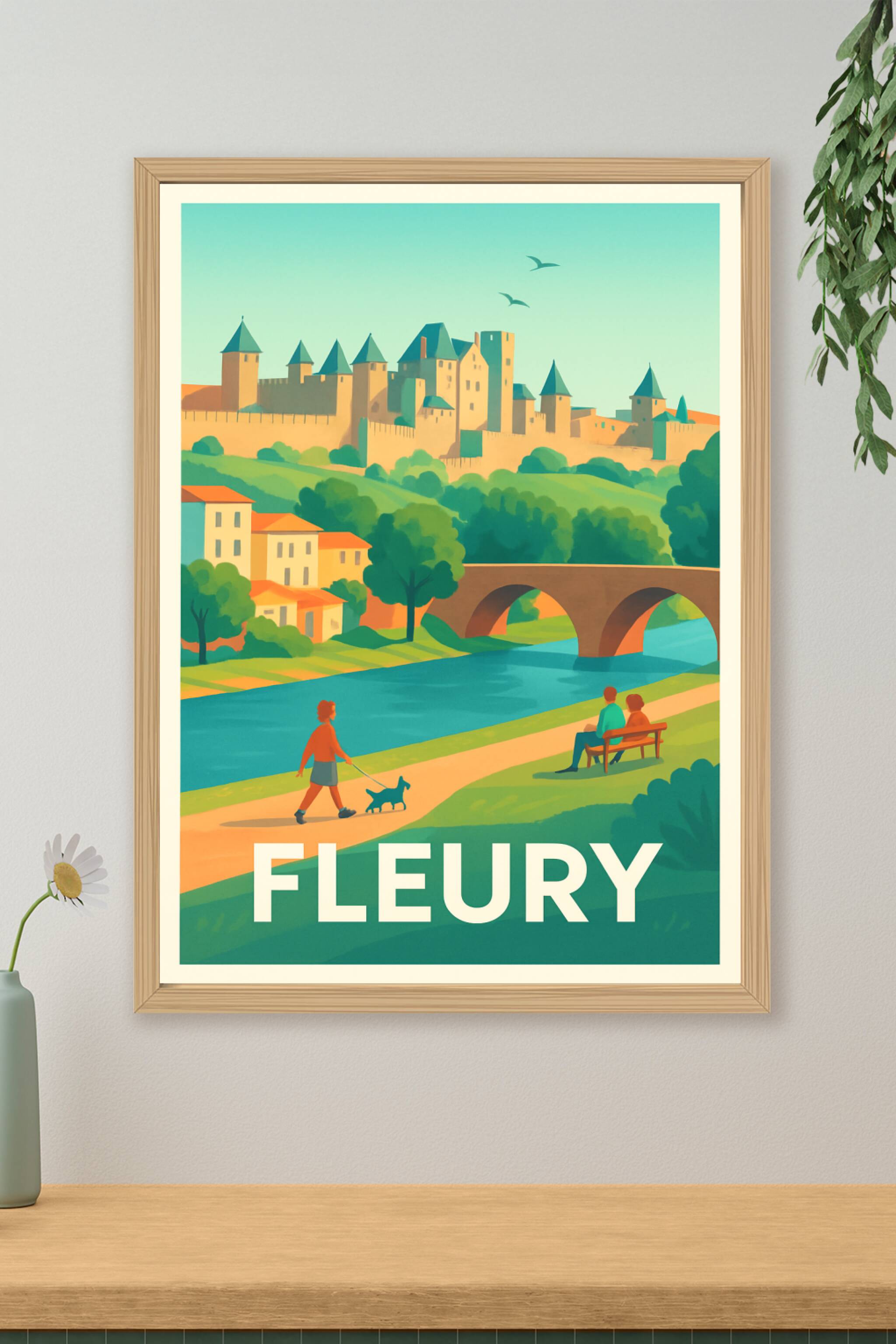 Découvrez l'élégance paisible de Fleury avec cette affiche illustrée mettant en scène son château majestueux surplombant la rivière, un pont en arc...