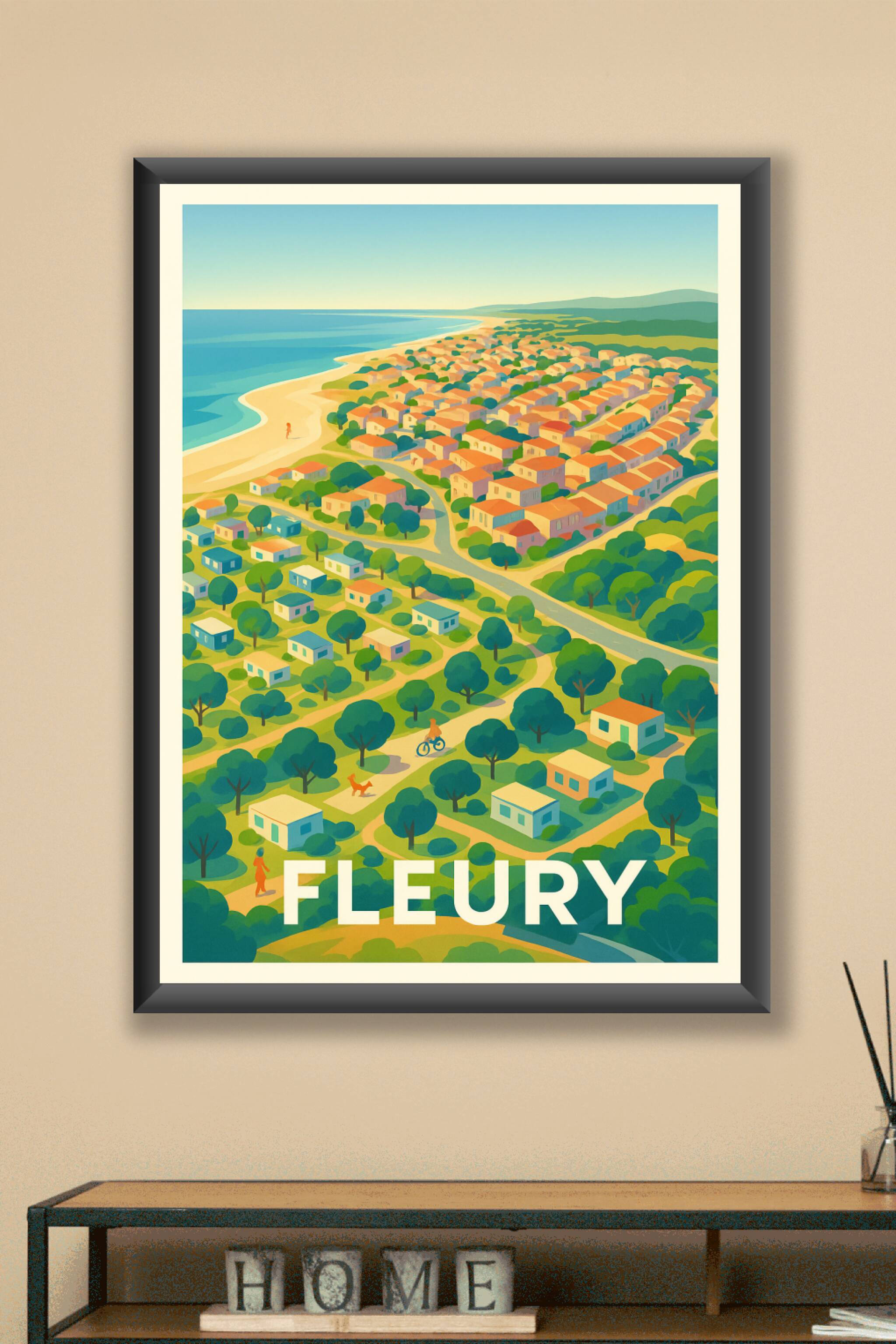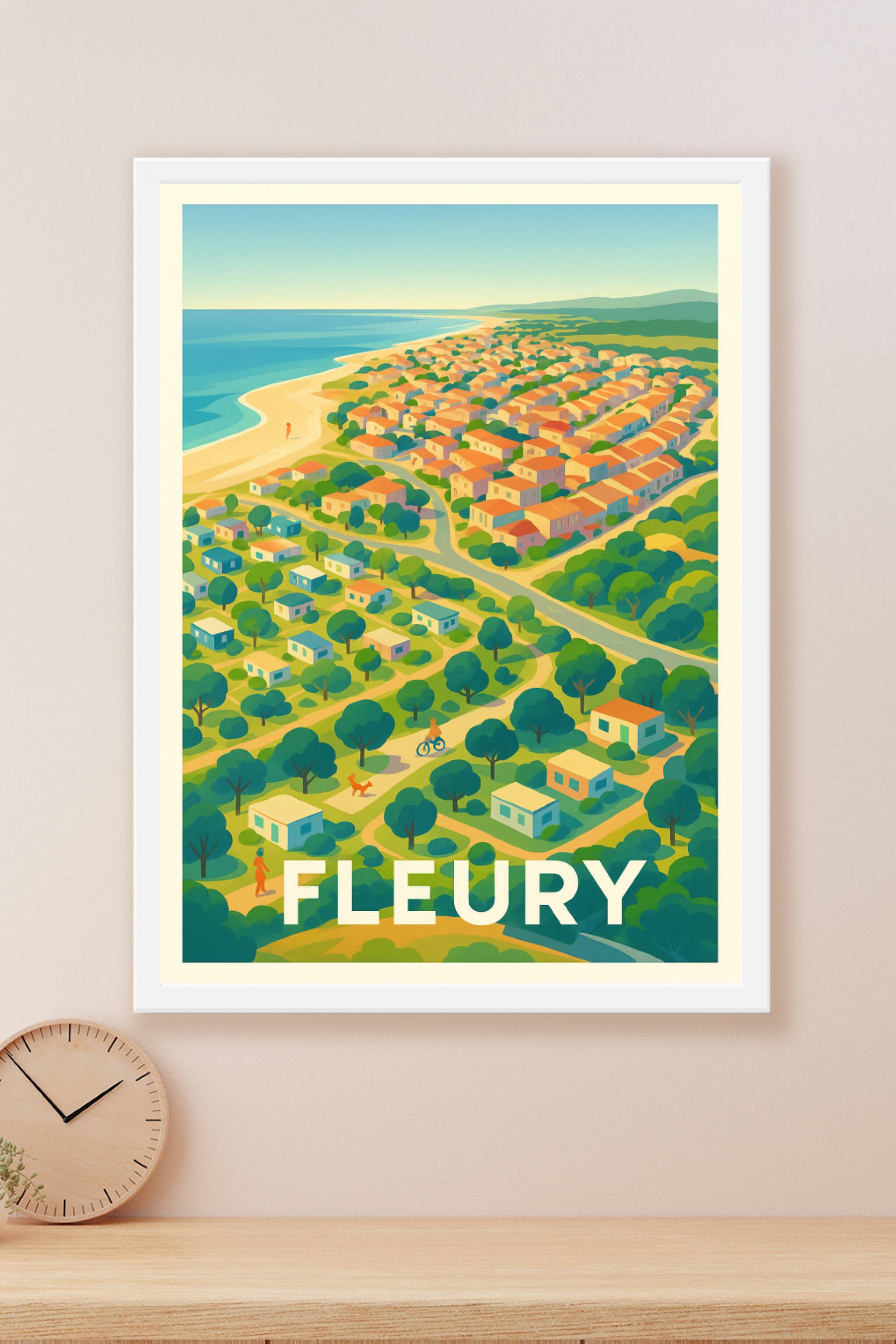 Découvrez l'affiche inspirante de Fleury, où la douceur des maisons colorées se mêle aux vastes étendues de verdure et à la plage bordée par une me...