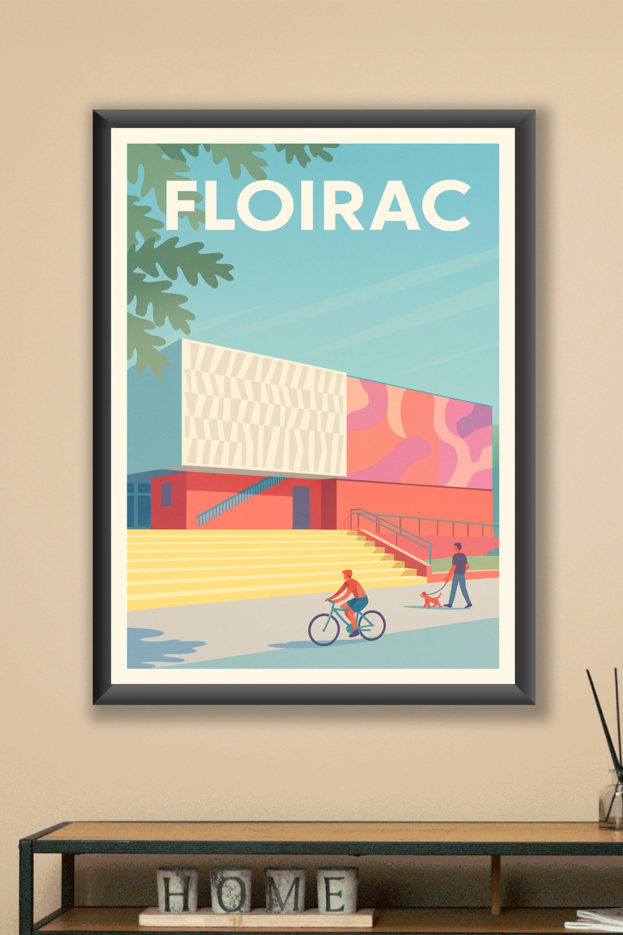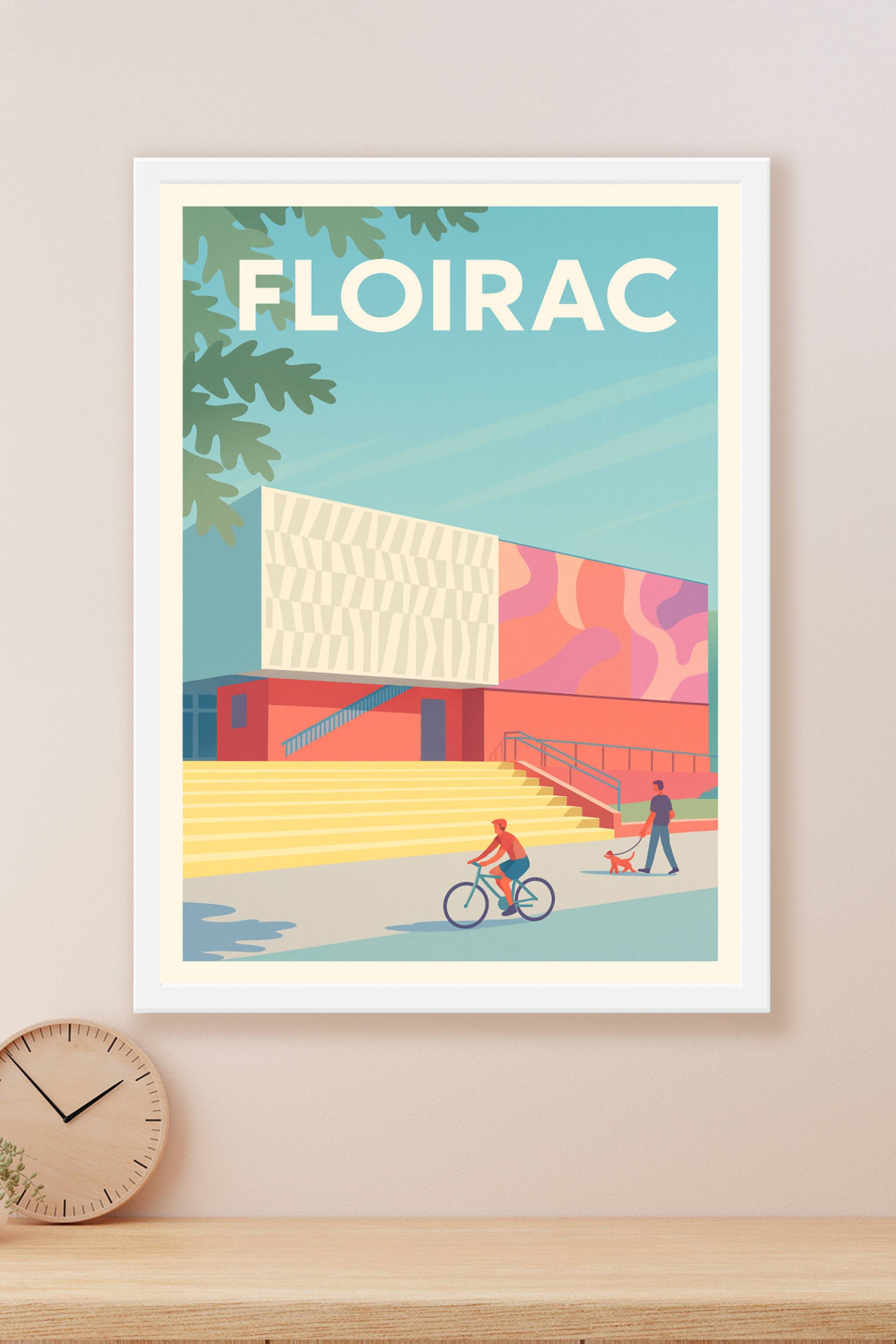 Découvrez la ville de Floirac à travers cette affiche au design moderne et lumineux qui met en avant un bâtiment iconique aux formes géométriques e...