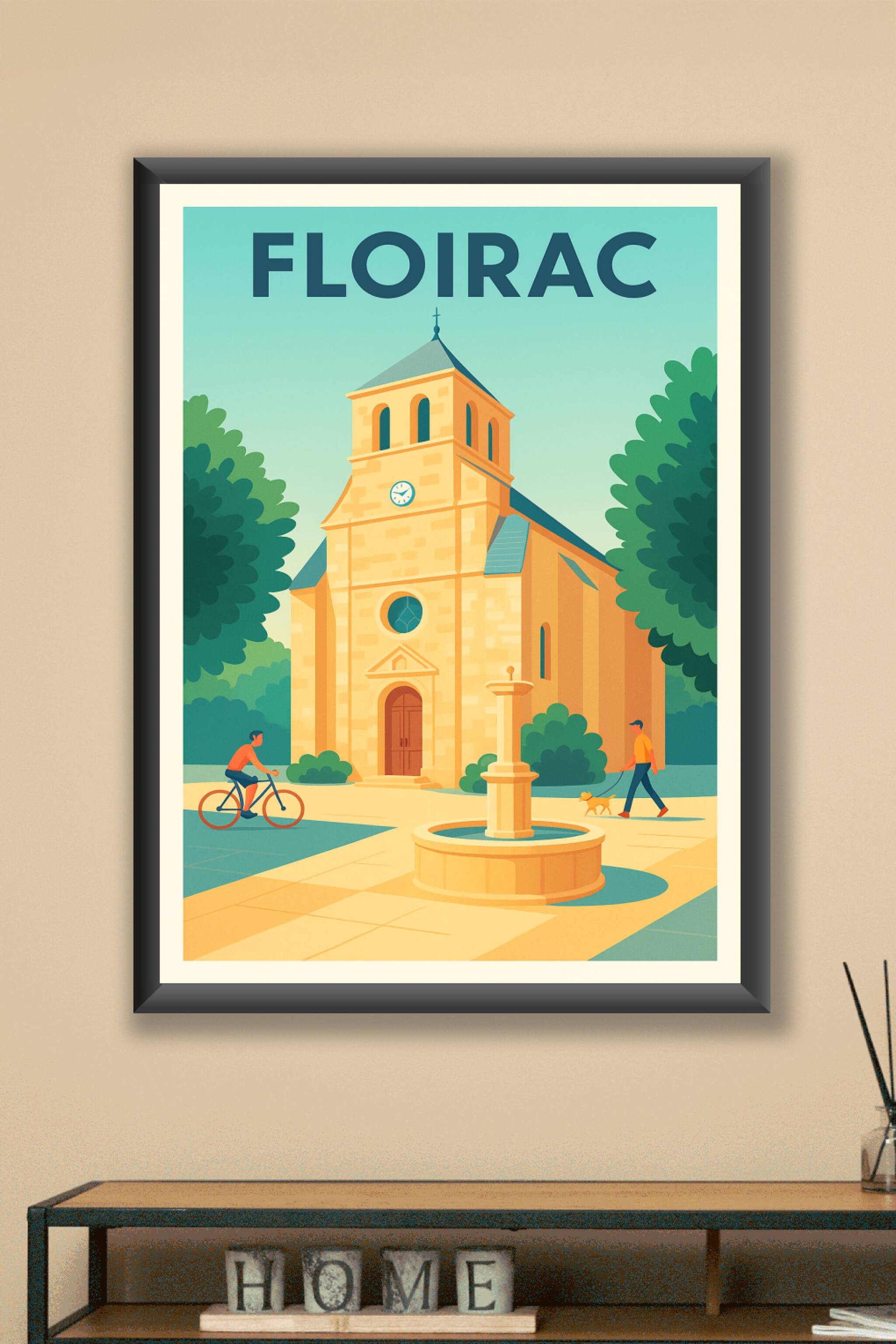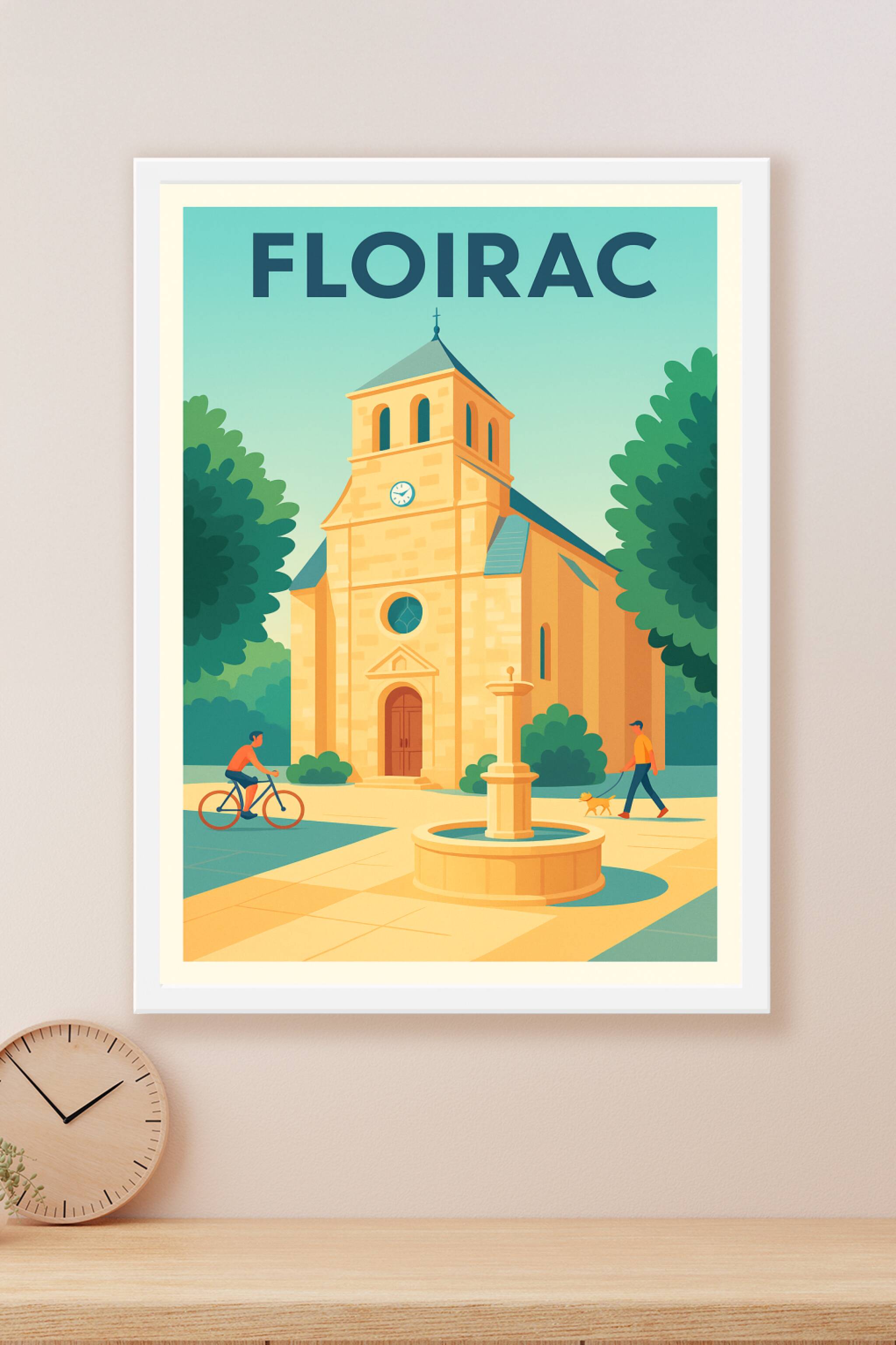 Découvrez l'élégance tranquille de Floirac à travers cette affiche illustrée mettant en scène une église historique baignée par une lumière douce et apaisante. Le poster capture l'essence d'un moment de vie simple, avec un cycliste et un passant promeneur de chien, entourés de verdure et d'une fontaine centrale. Imprimé en tirage "Fine Art" sur un papier coton 305g de haute qualité, ce poster garantit des détails précis et des couleurs vibrantes. Disponible en formats allant du A1 au A4, avec ou sans cadre, cette affiche sera parfaite pour apporter une touche authentique et chaleureuse à votre décoration intérieure. Profitez d’un tirage d’exception, 100% made in France, pour embellir votre espace ou offrir un souvenir unique de Floirac.