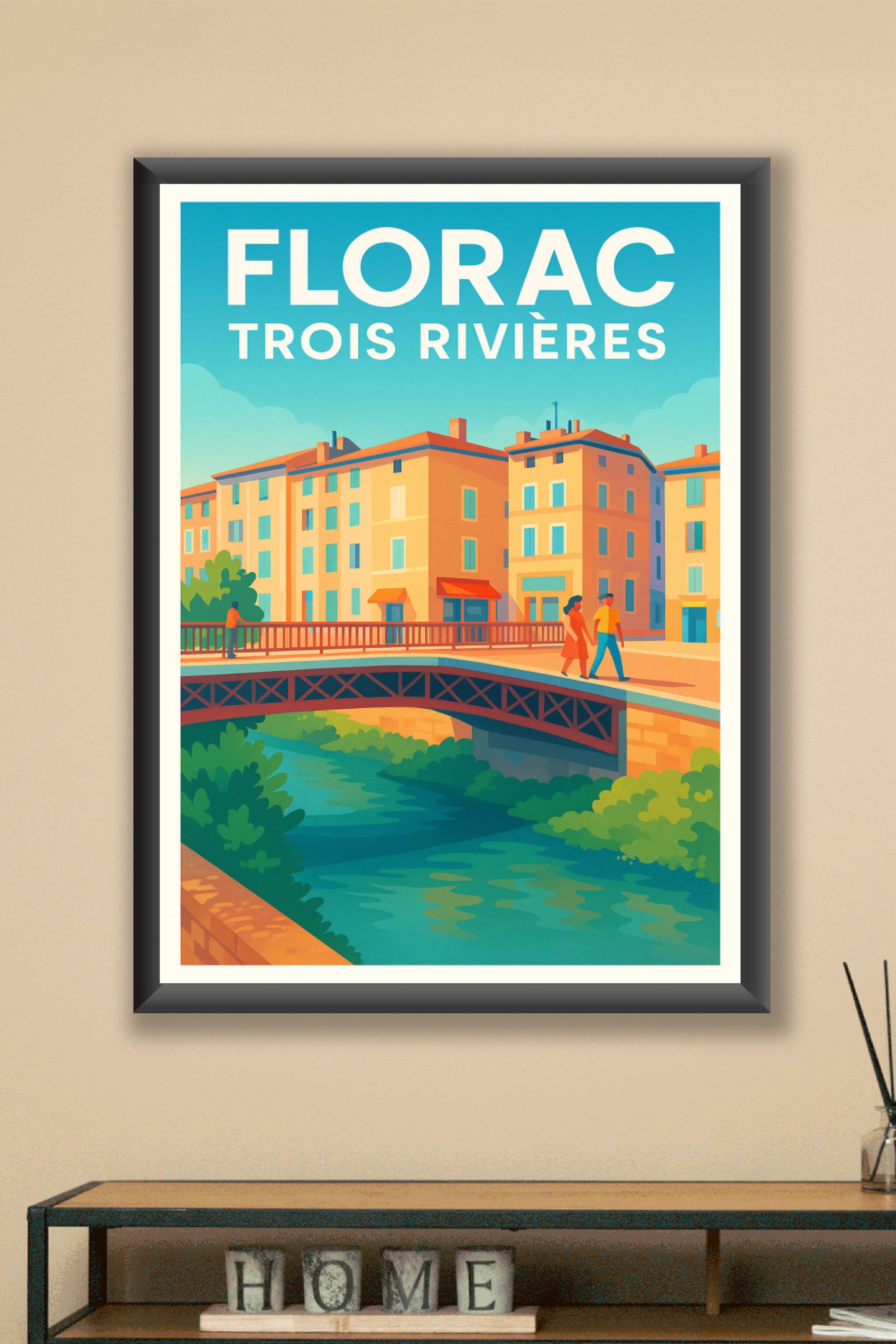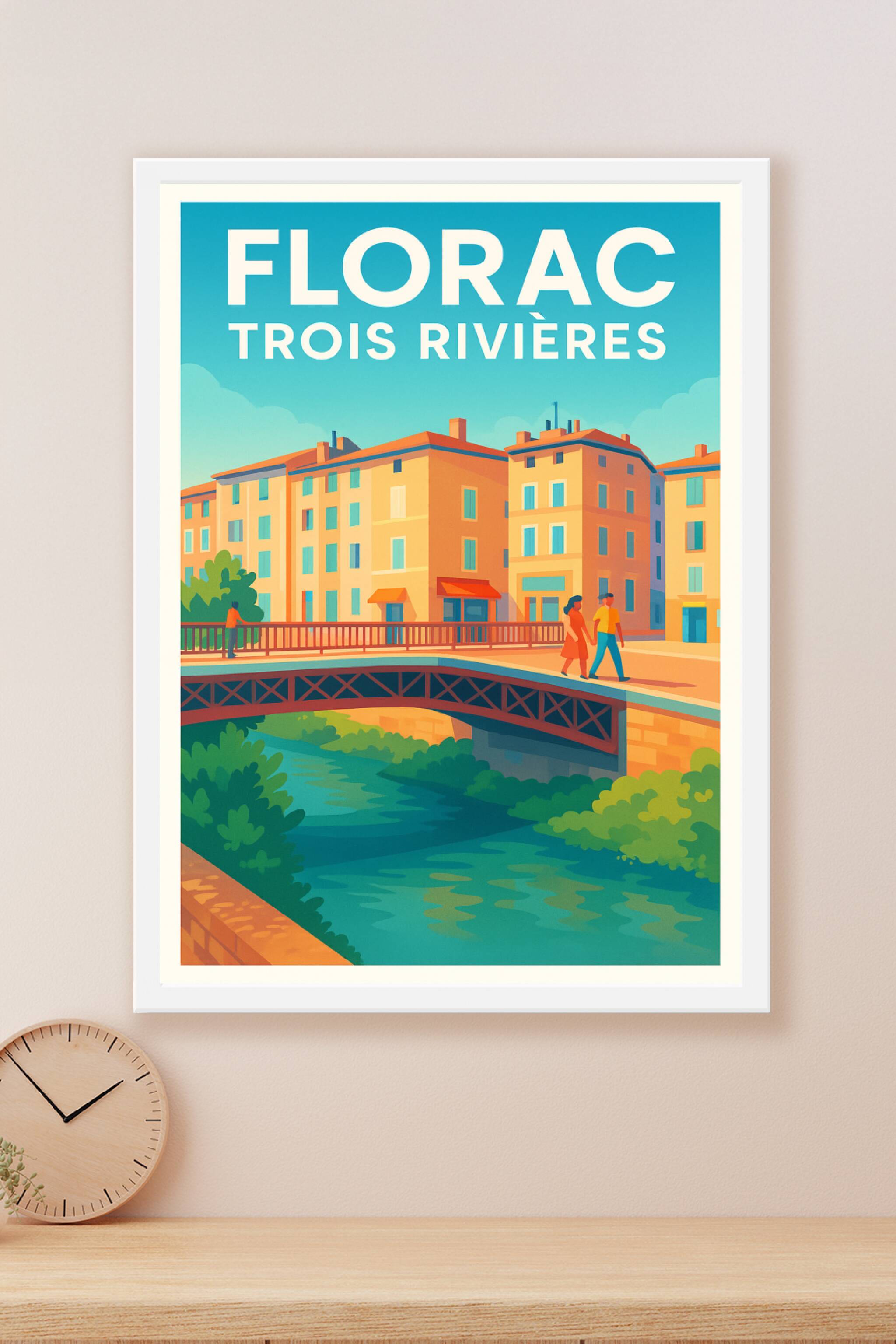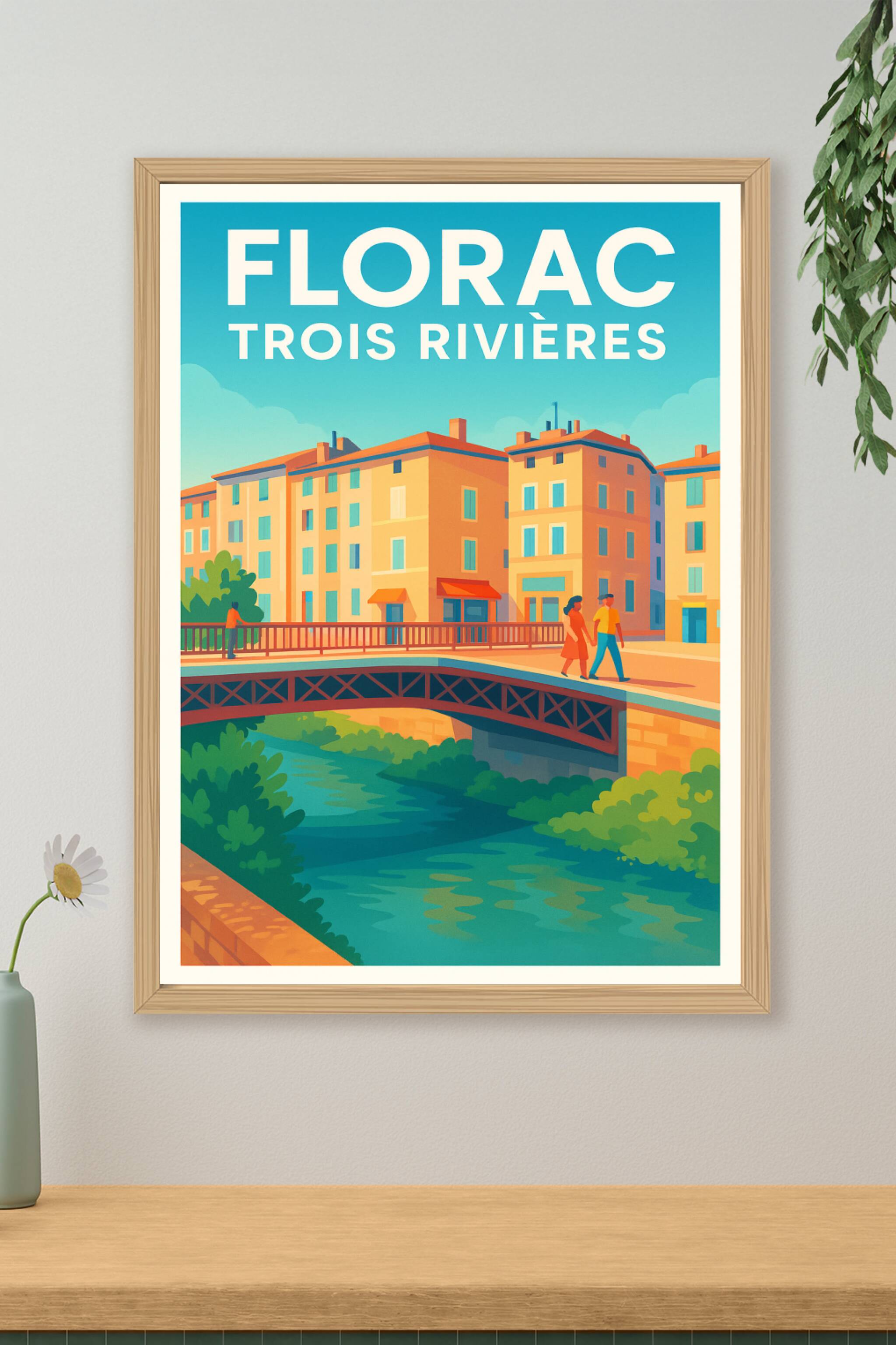 Découvrez la douceur de vivre à Florac avec cette affiche illustrée mettant en scène le joli pont qui traverse les Trois Rivières et les bâtiments ...