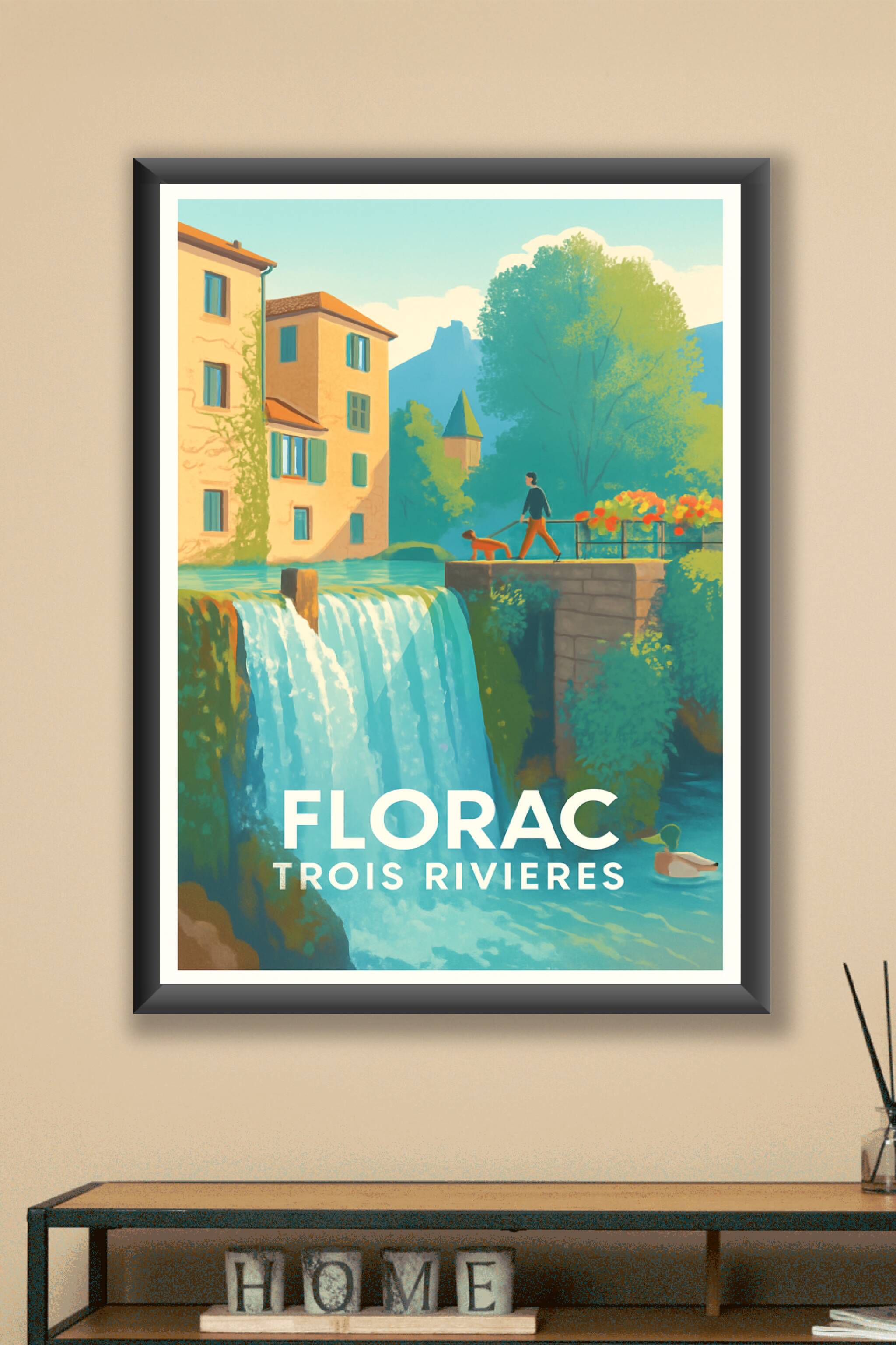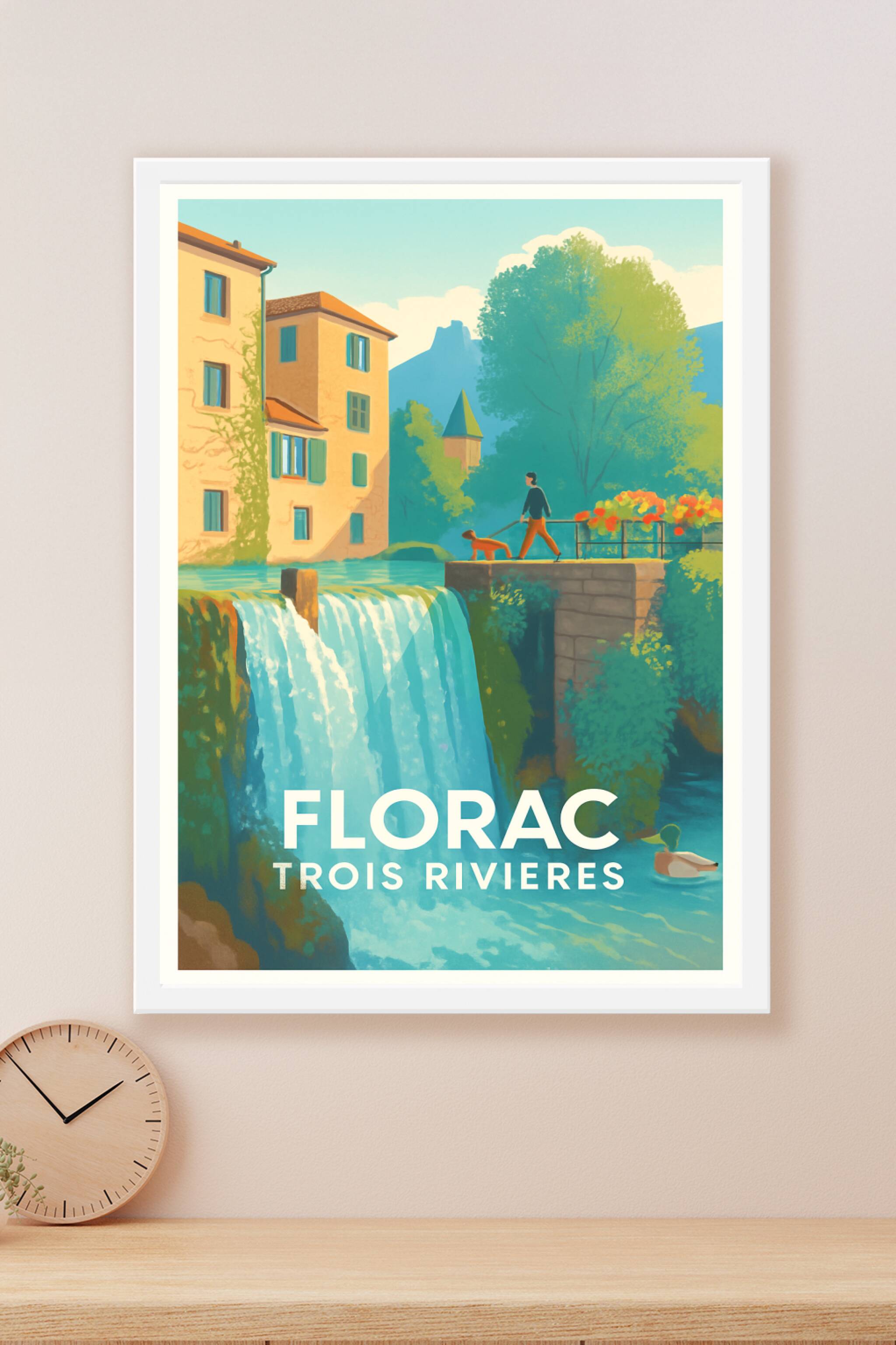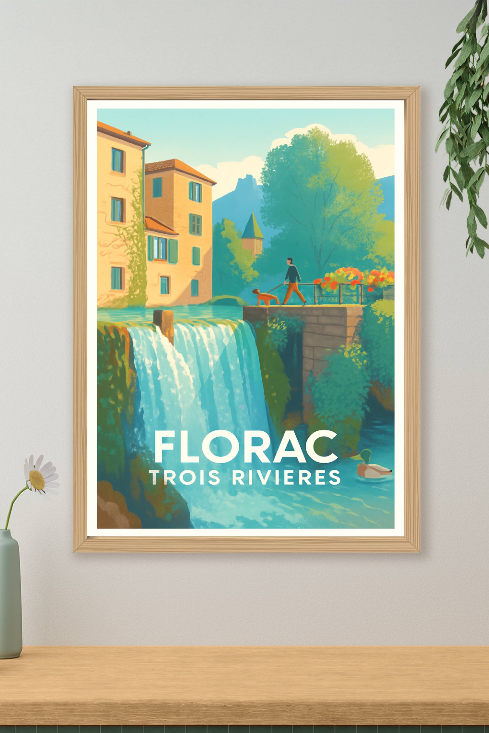 Découvrez la sérénité de Florac illustrée dans cette affiche au style doux et apaisant. L’eau claire des rivières, les bâtisses typiques et la natu...