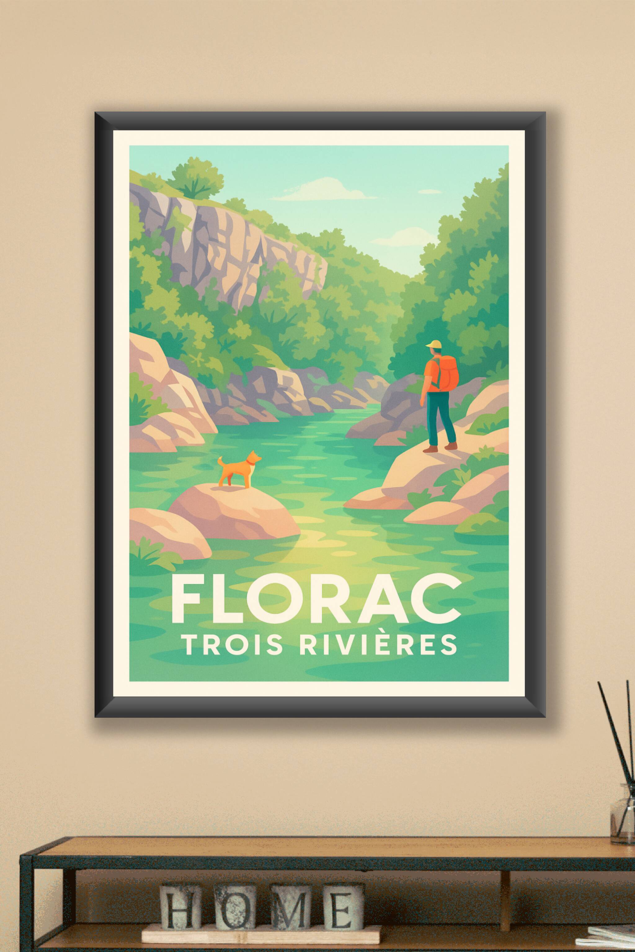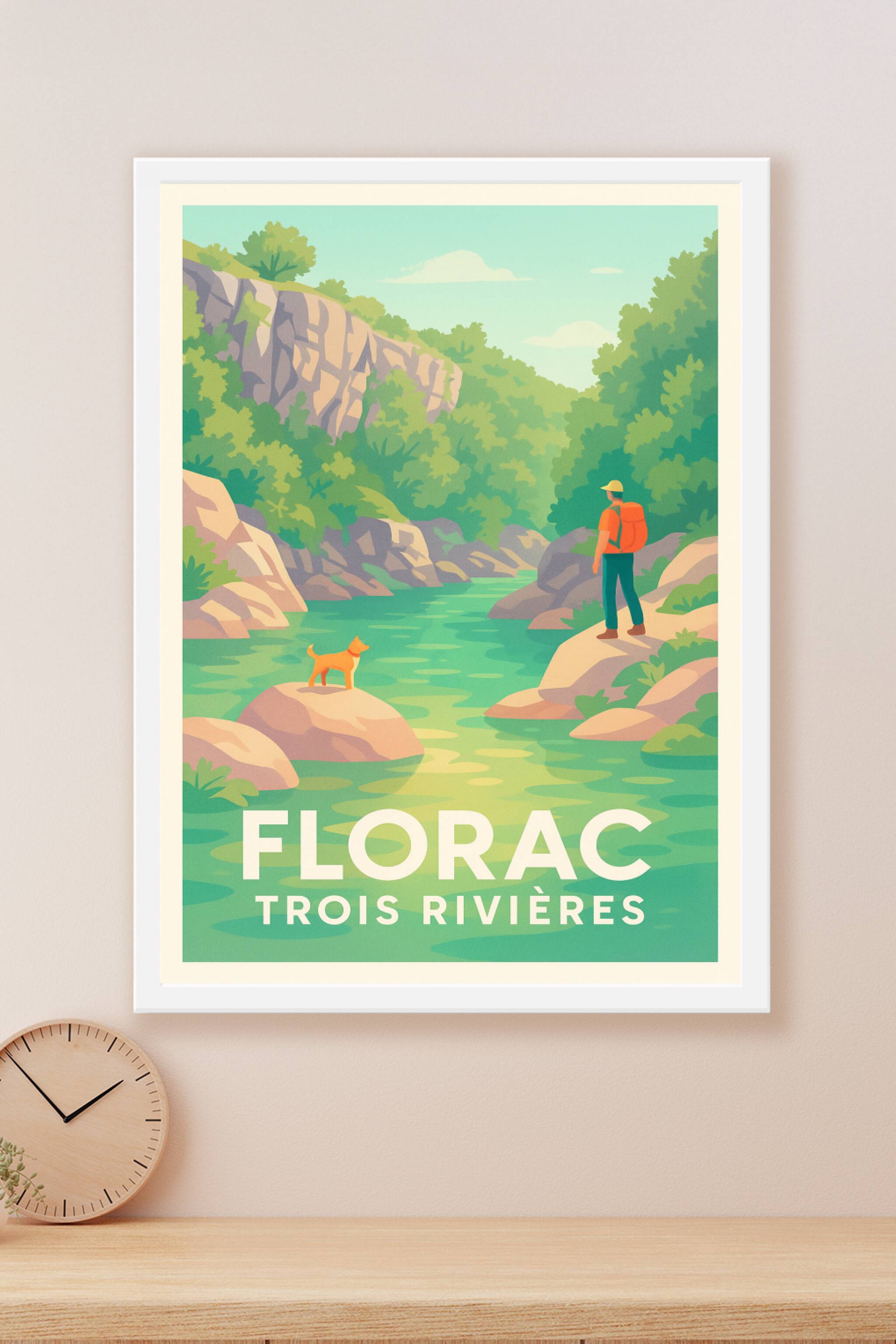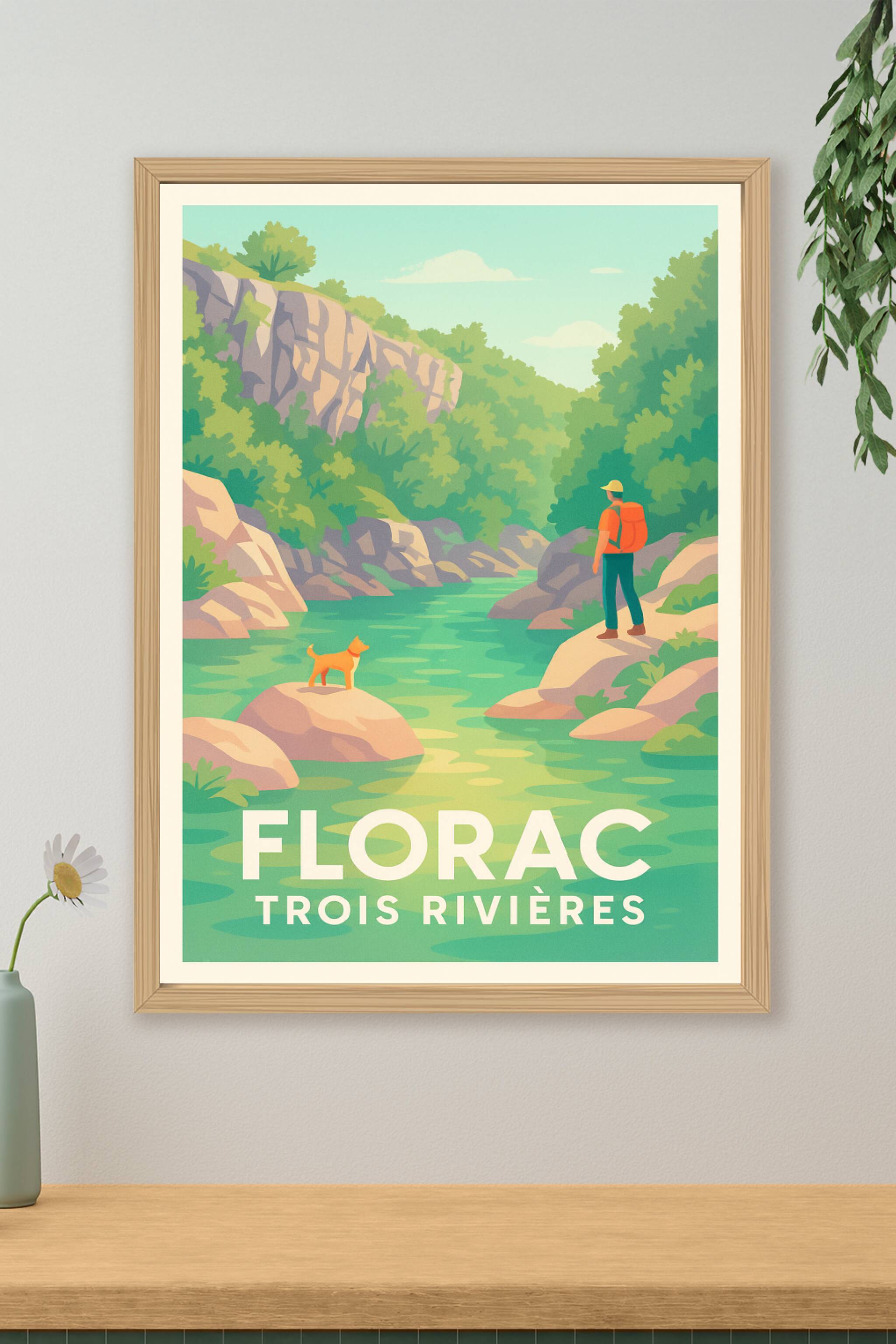 Découvrez la sérénité et la beauté naturelle de Florac avec cette affiche illustrée mettant en scène un instant paisible au bord des Trois Rivières...