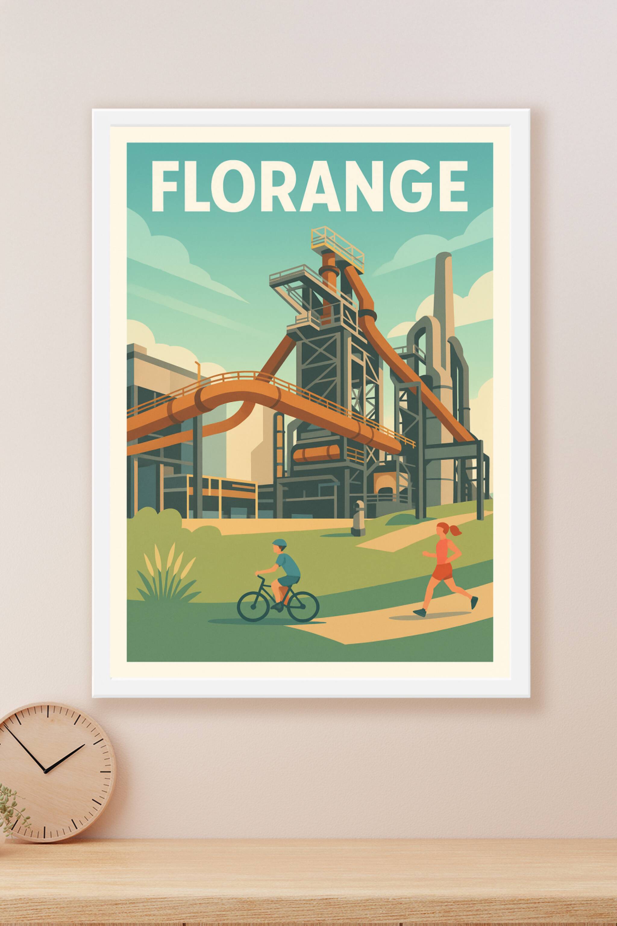 Découvrez l'affiche Florange, une représentation moderne de l'emblématique paysage industriel mêlé à la douceur d'un parc où cyclistes et joggeurs ...