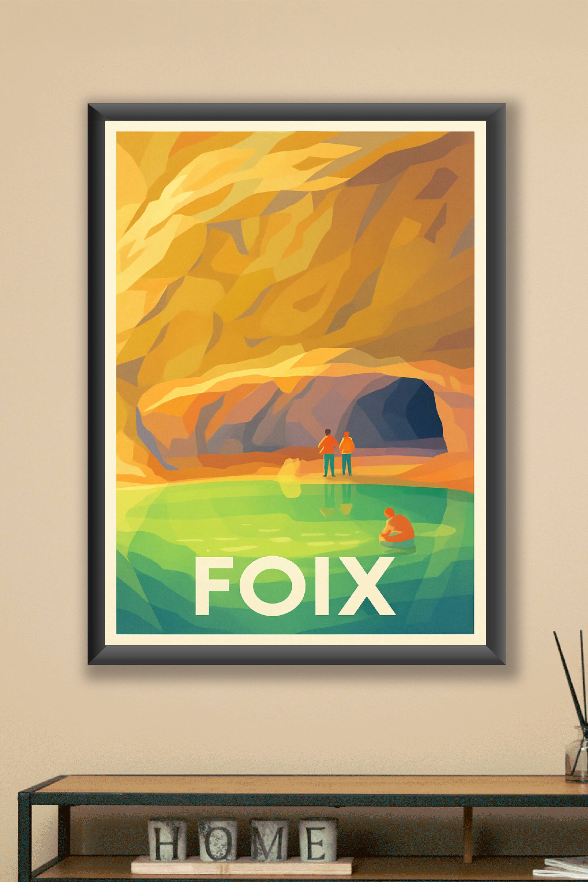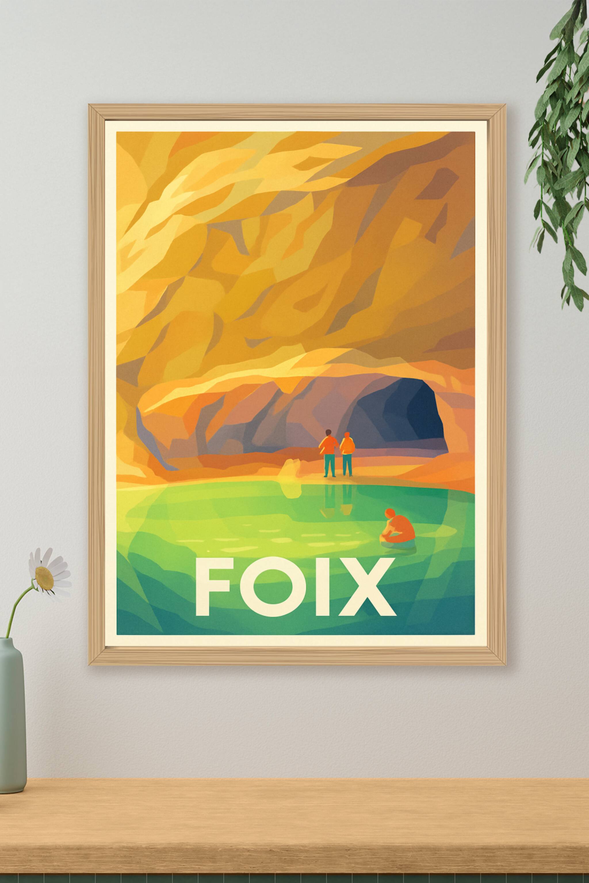 Découvrez la beauté mystérieuse de Foix à travers cette affiche illustrée mettant en scène les impressionnantes grottes aux parois dorées et le ref...