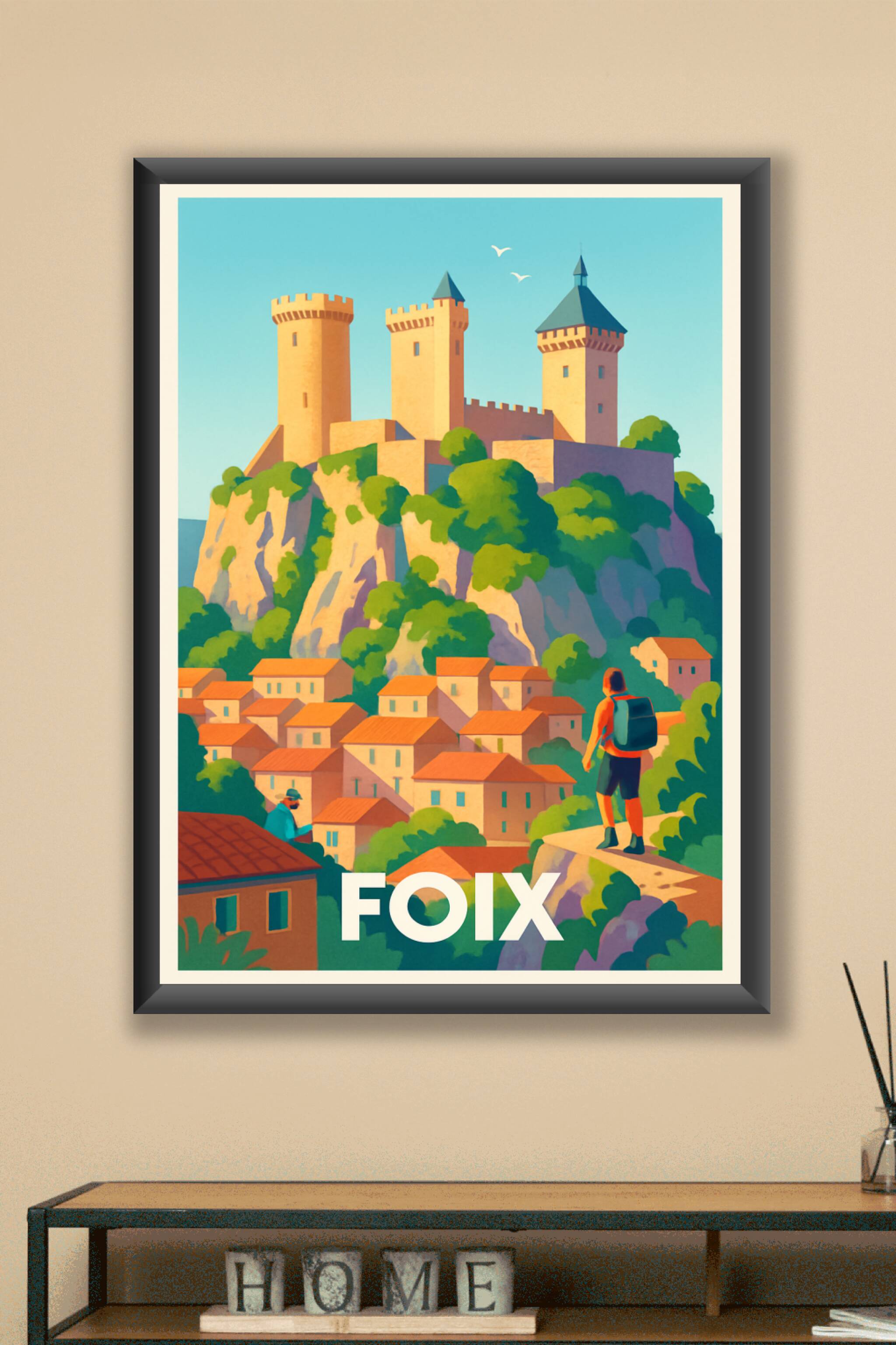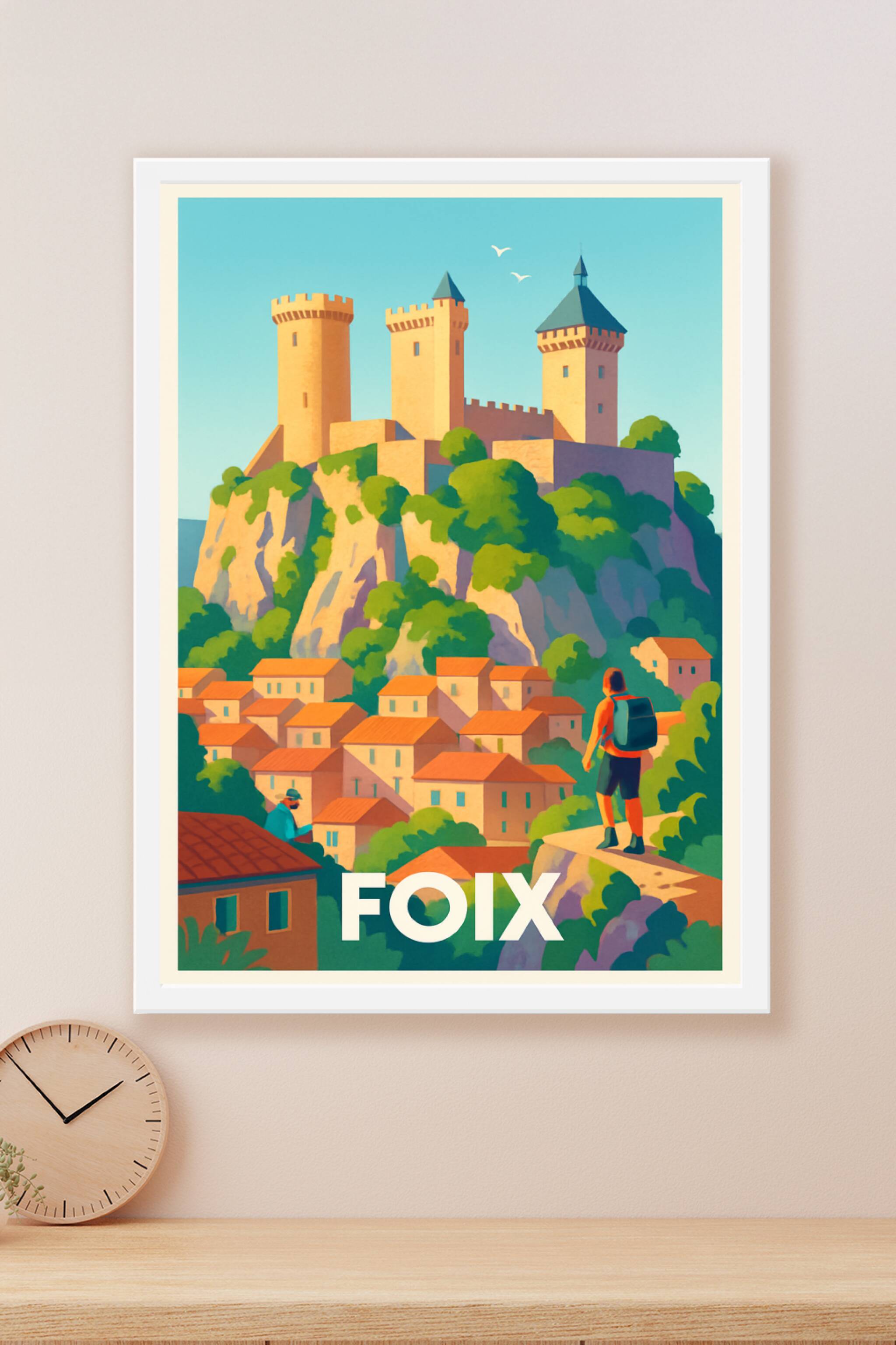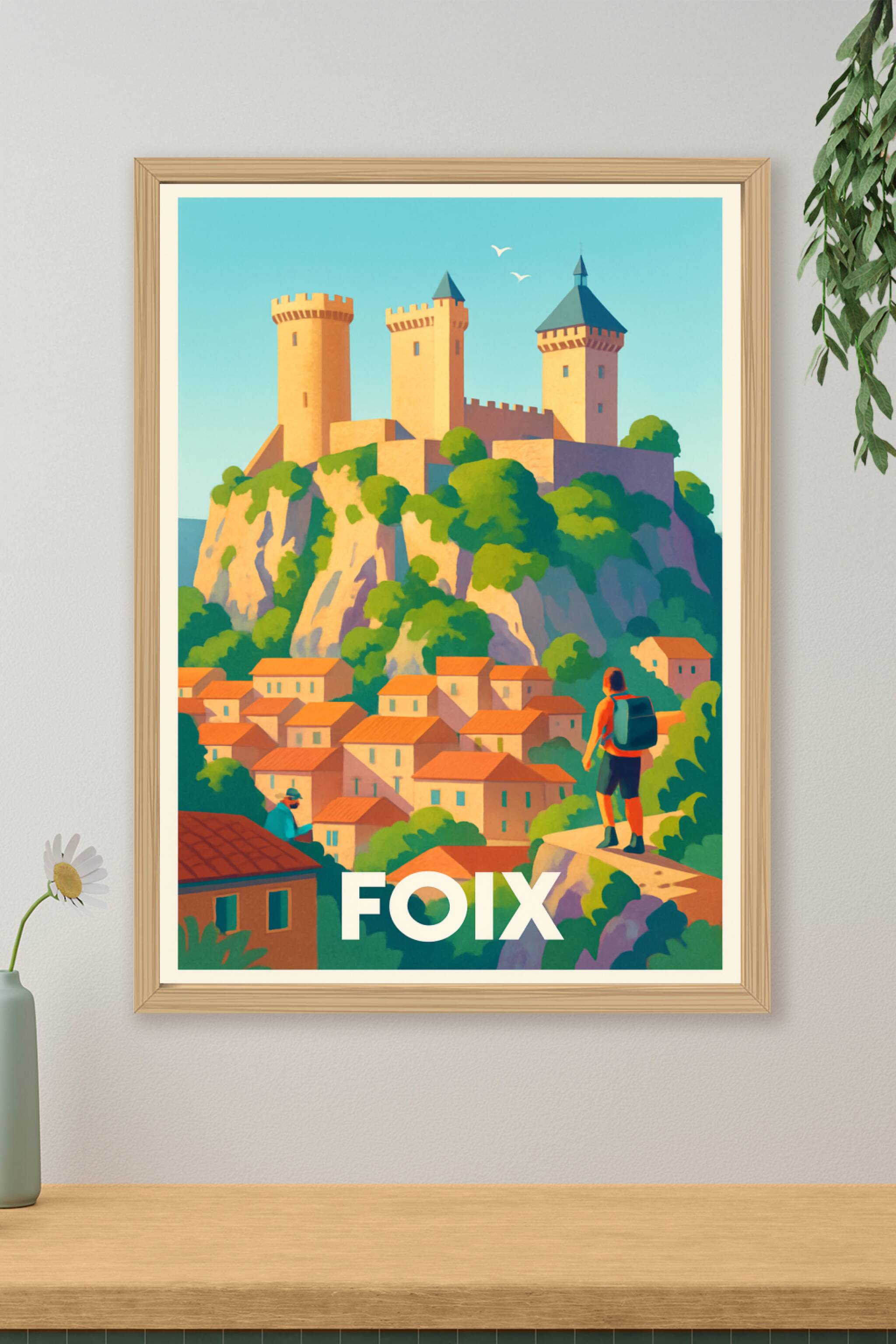 Découvrez le charme historique et la beauté pittoresque de Foix avec cette affiche au style illustratif vibrant. Le célèbre château médiéval qui do...