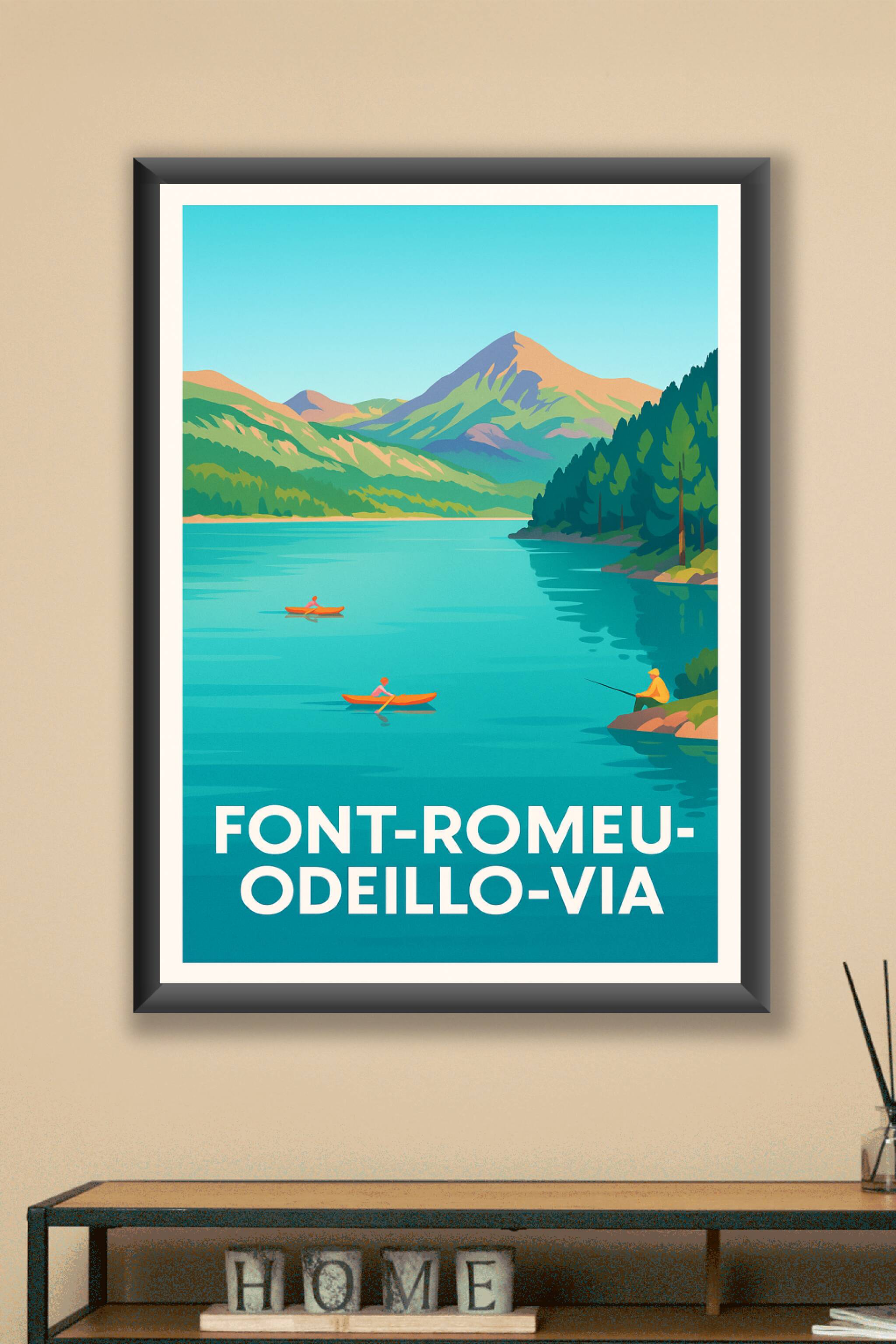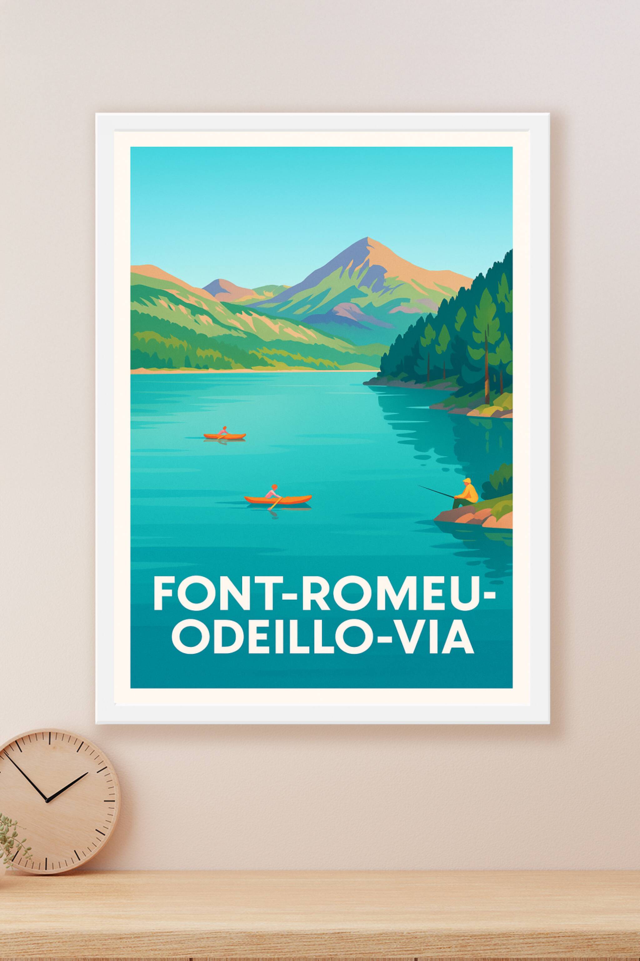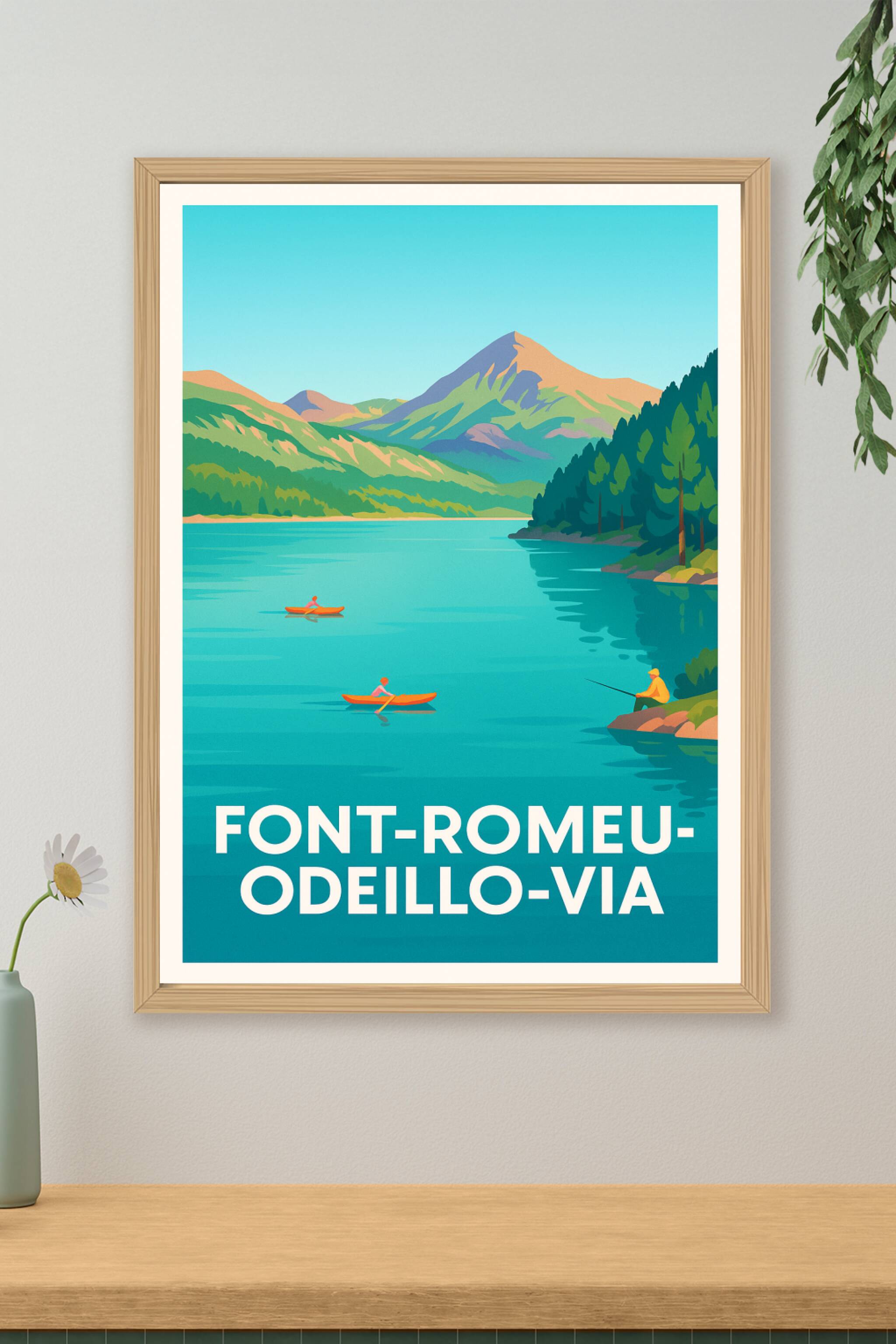 Découvrez toute la beauté paisible de Font-Romeu-Odeillo-Via avec cette affiche illustrée qui capture un paysage de montagne apaisant, où les canoë...