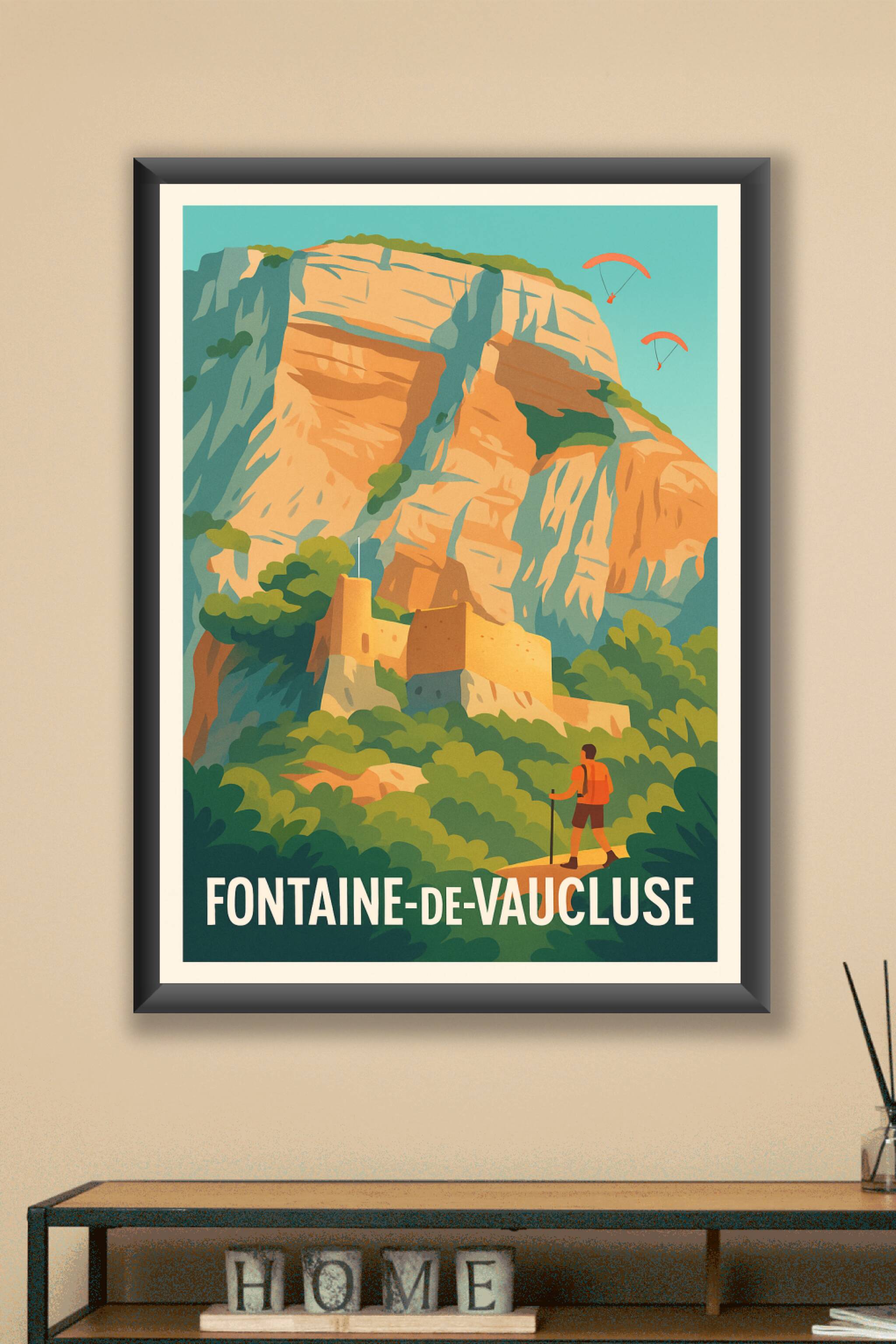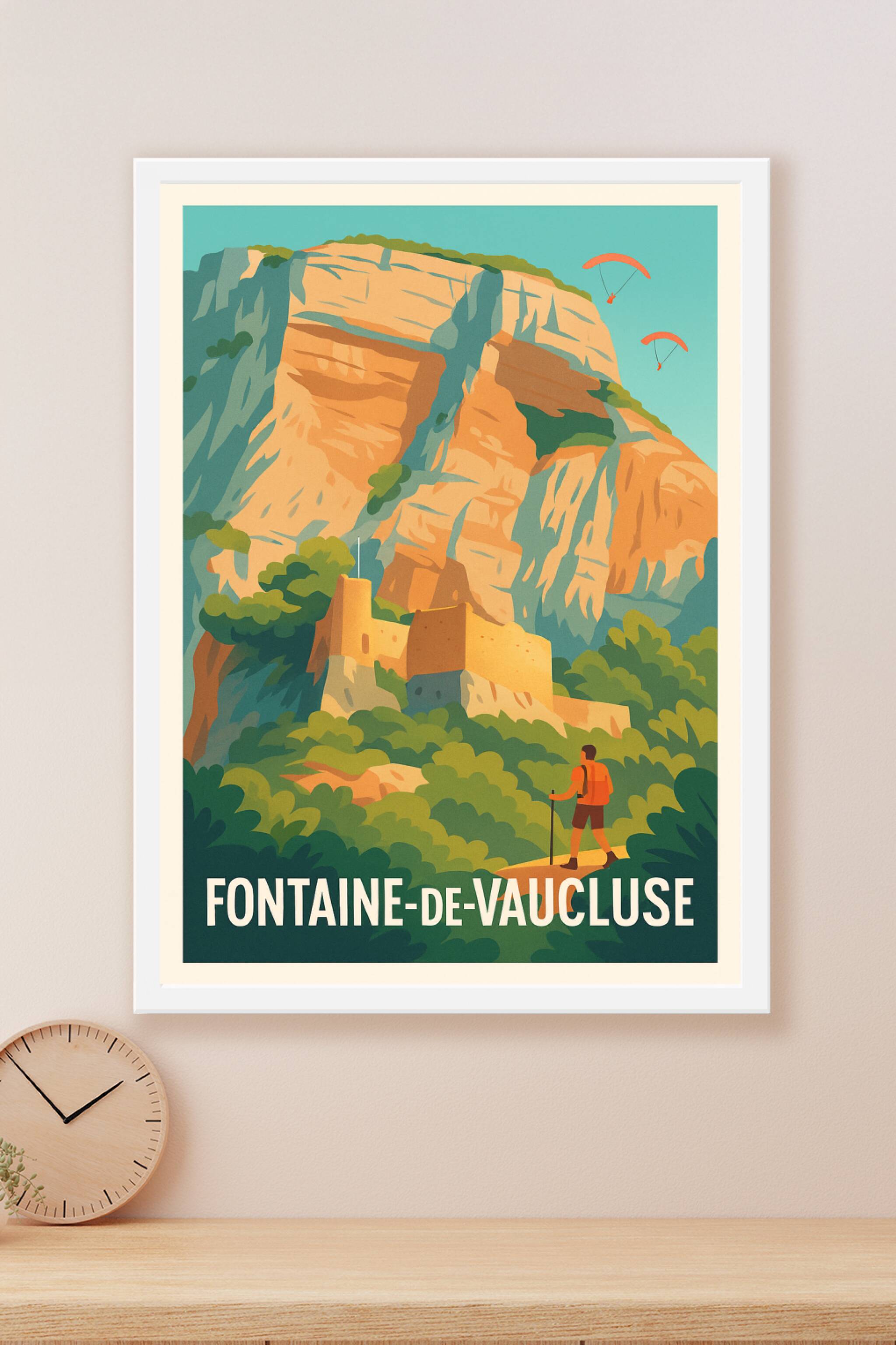 Découvrez la beauté naturelle et la richesse historique de Fontaine-de-Vaucluse avec cette affiche vintage inspirée des affiches de voyage classiques. Représentant un paysage majestueux dominé par une falaise impressionnante, une ancienne forteresse et un randonneur contemplant la scène, ce poster invite à l'évasion et à l'exploration. Imprimé en tirage « Fine Art » sur papier 305g coton de haute qualité, ce poster garantit des couleurs vives et une texture élégante. Disponible en formats allant de A1 à A4, avec ou sans cadre, cette affiche est parfaite pour apporter une touche provençale authentique à votre décoration intérieure. Offrez-vous, ou à vos proches, un souvenir unique de la nature et de l'aventure provençale avec ce tirage premium, intégralement fabriqué en France.