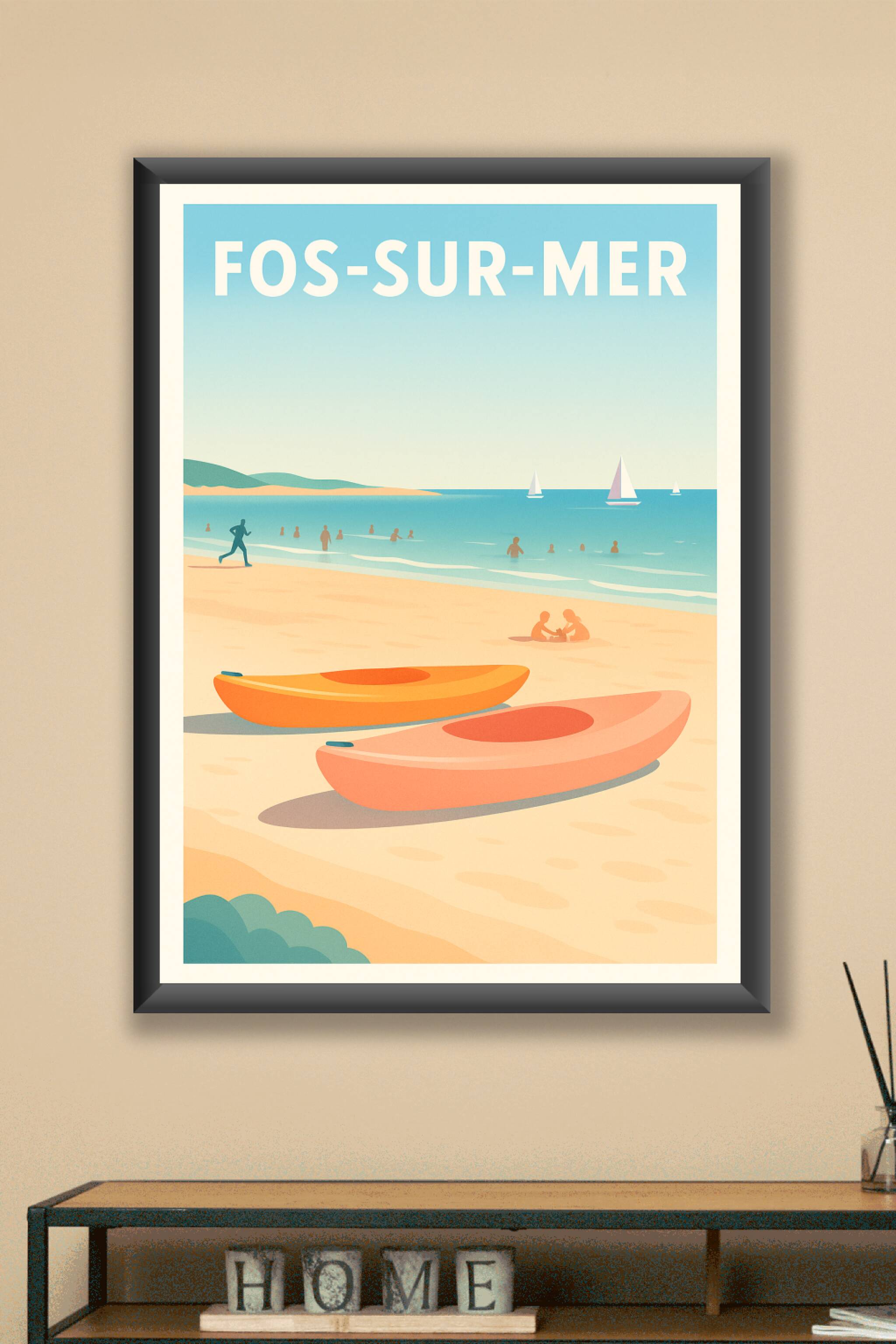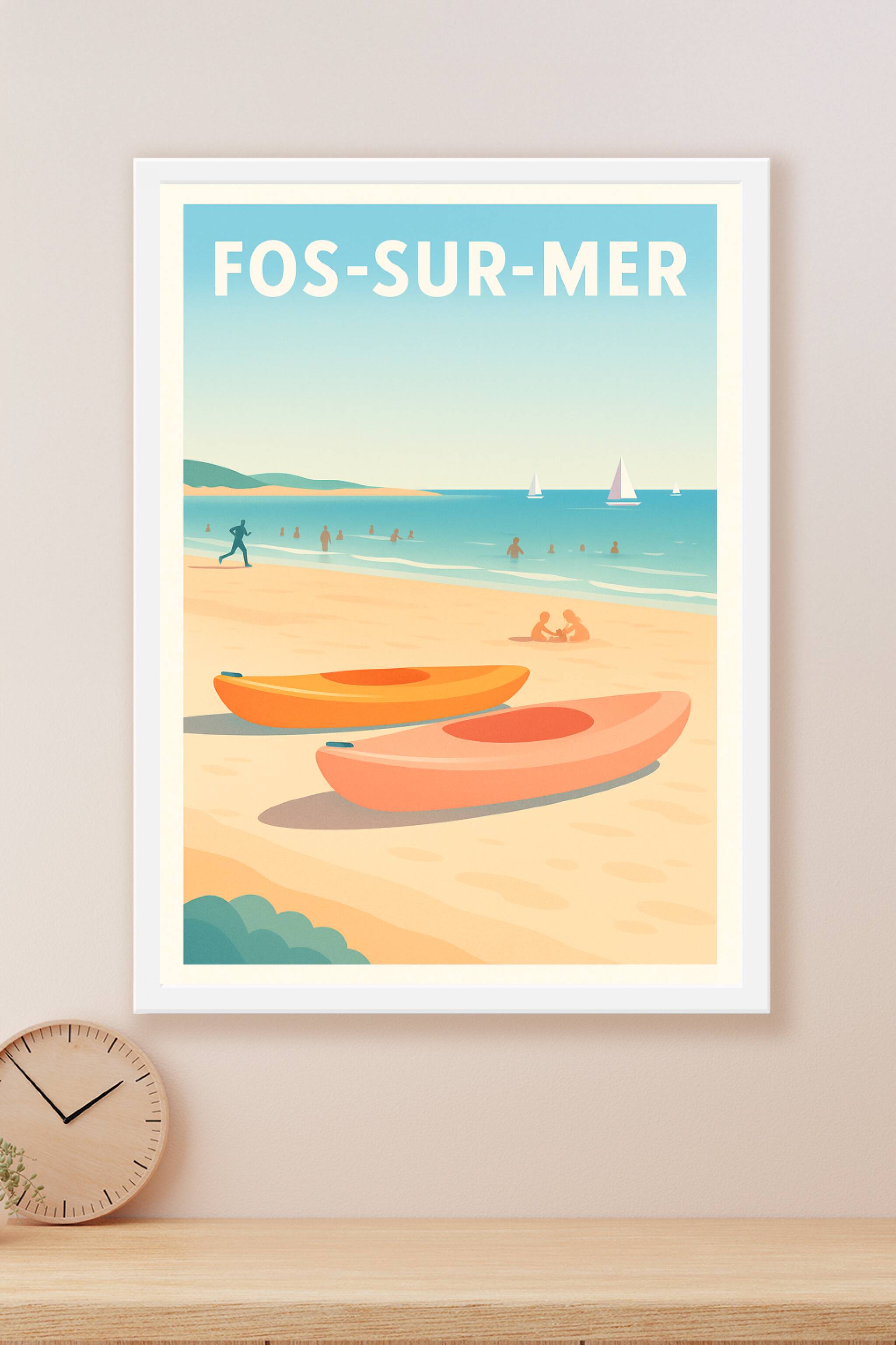 Découvrez la douceur de vivre au bord de la Méditerranée avec cette affiche illustrée représentant la plage de Fos-sur-Mer. Entre kayak posé sur le...