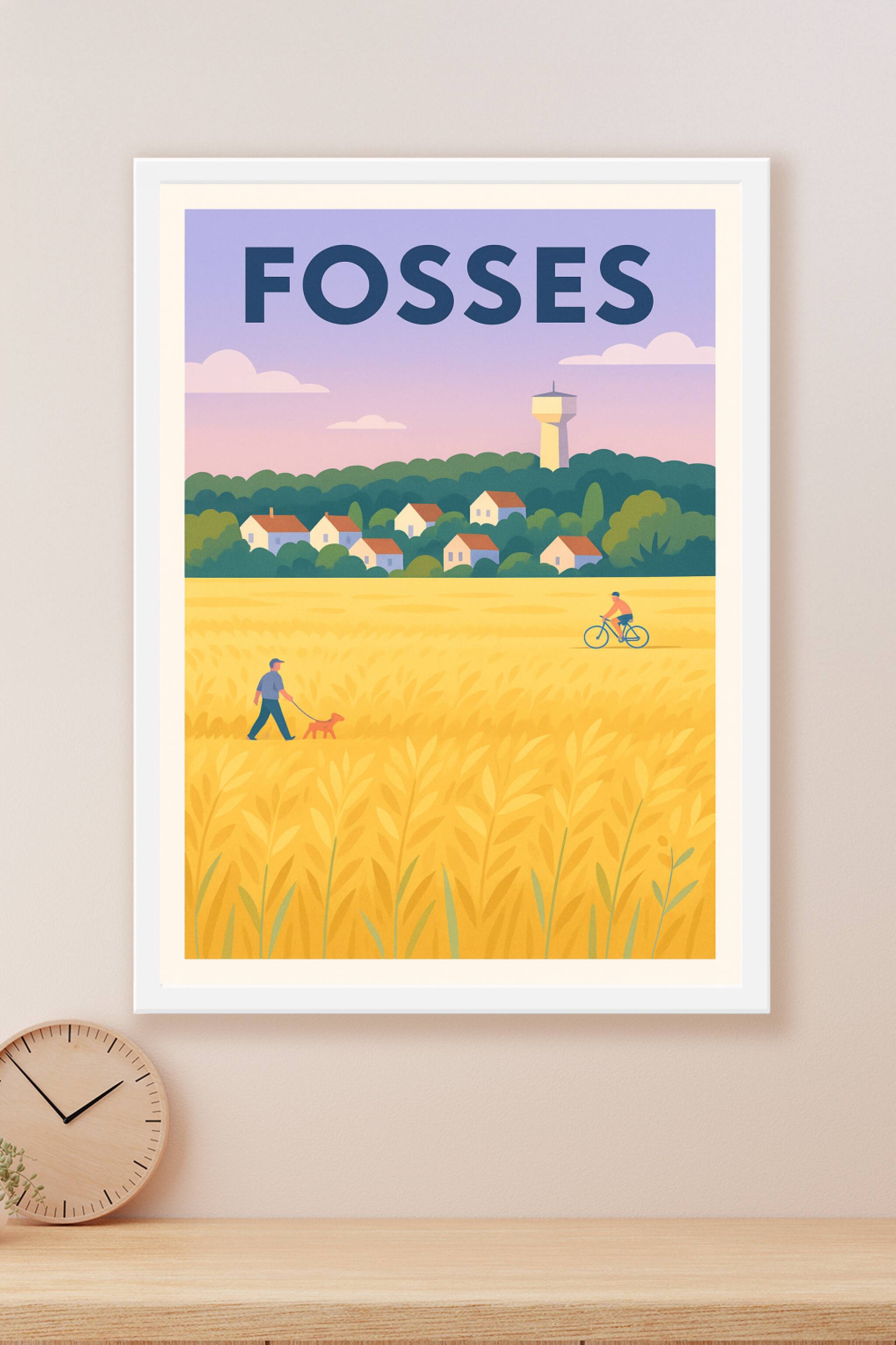Découvrez la quiétude de la ville de Fosses à travers cette affiche illustrée aux couleurs douces et apaisantes. Le poster met en scène un champ do...