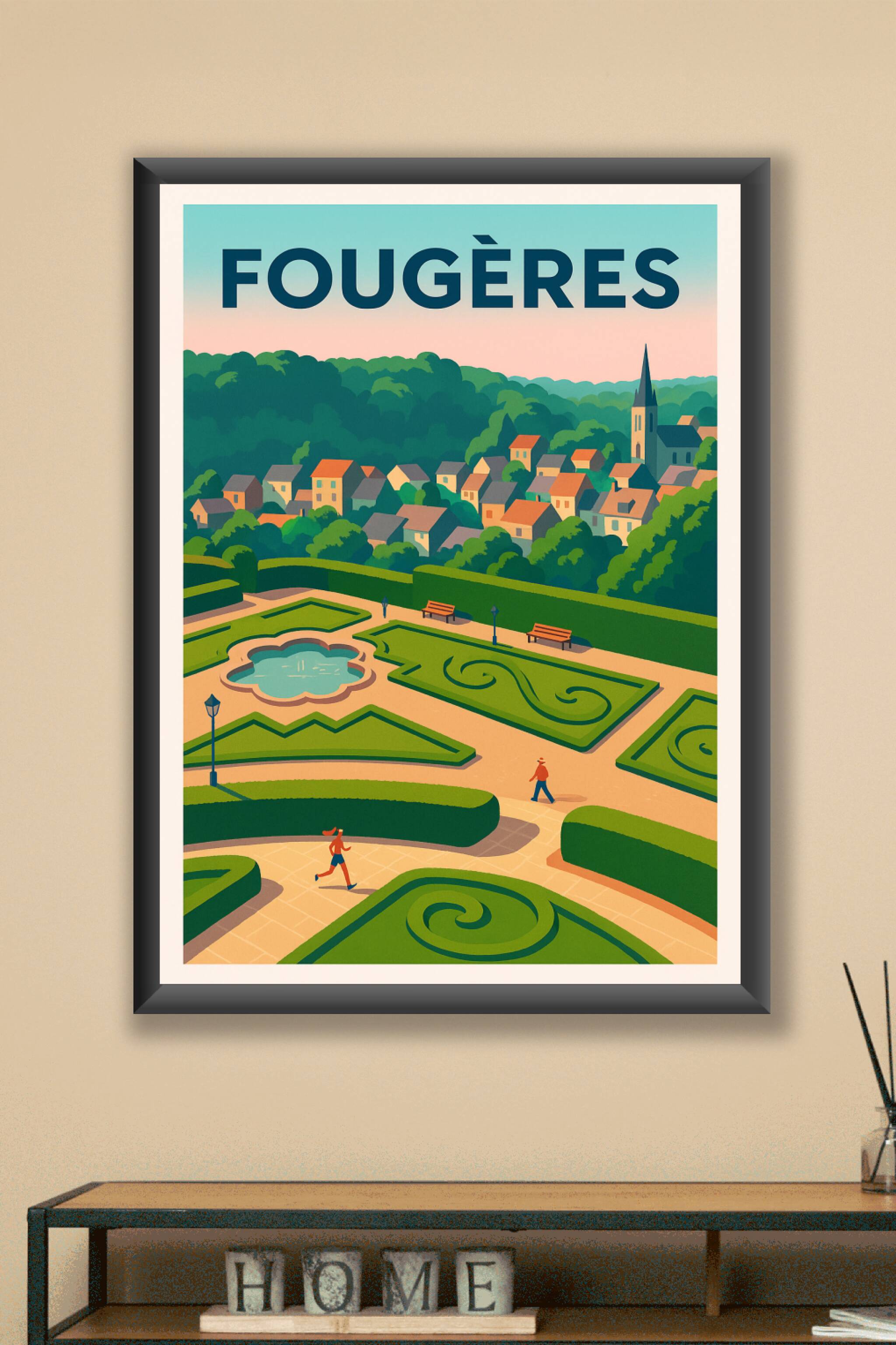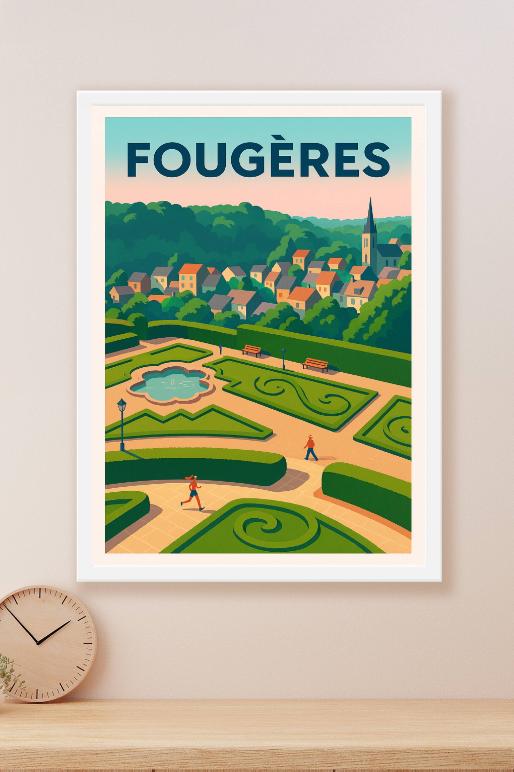 Découvrez l'élégance intemporelle de Fougères à travers cette affiche au style graphique épuré qui met en lumière ses célèbres jardins à la françai...