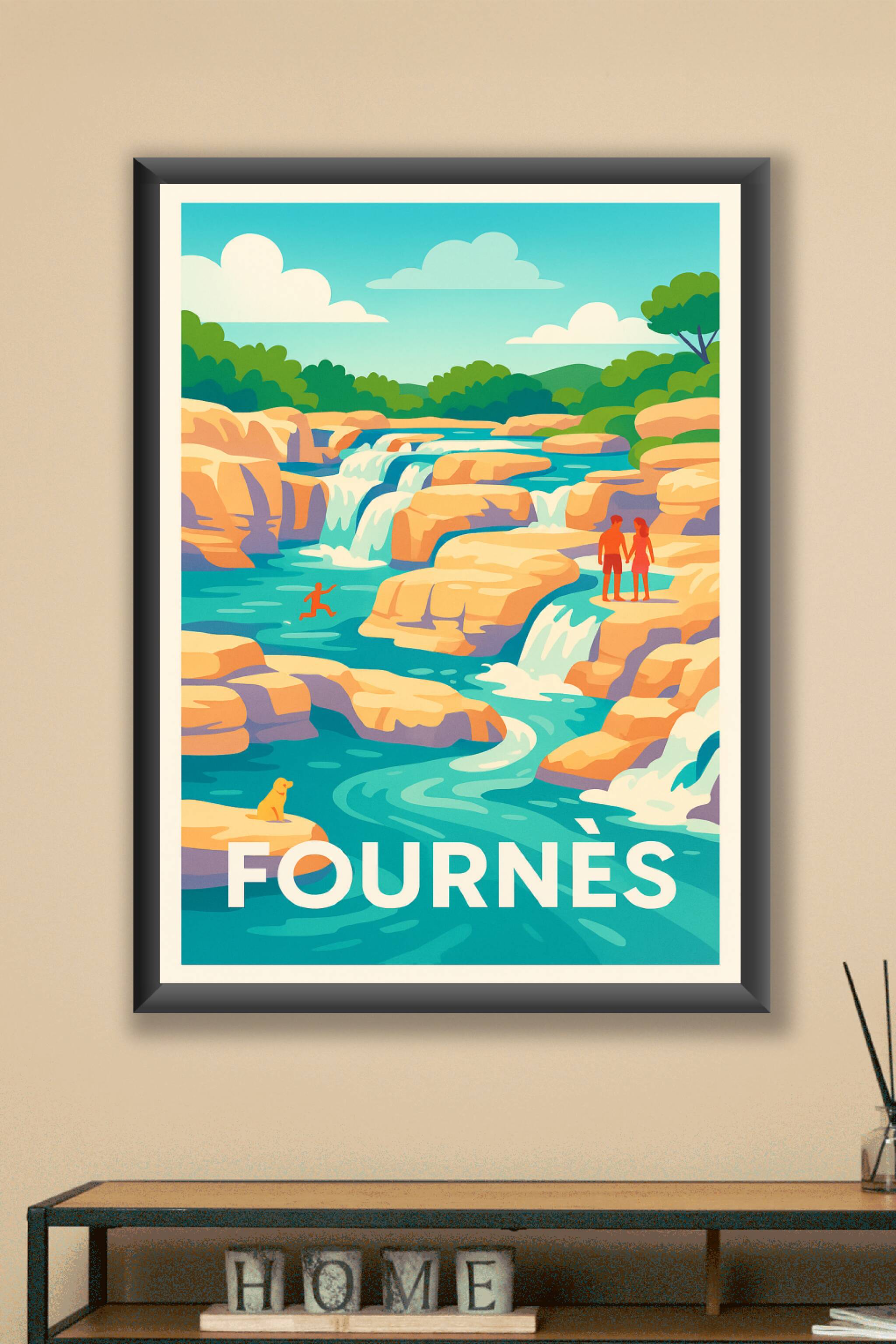 Découvrez la beauté sauvage de Fournès avec cette affiche vibrante qui capture les cascades et les rochers baignés de lumière. Ce poster, au style ...