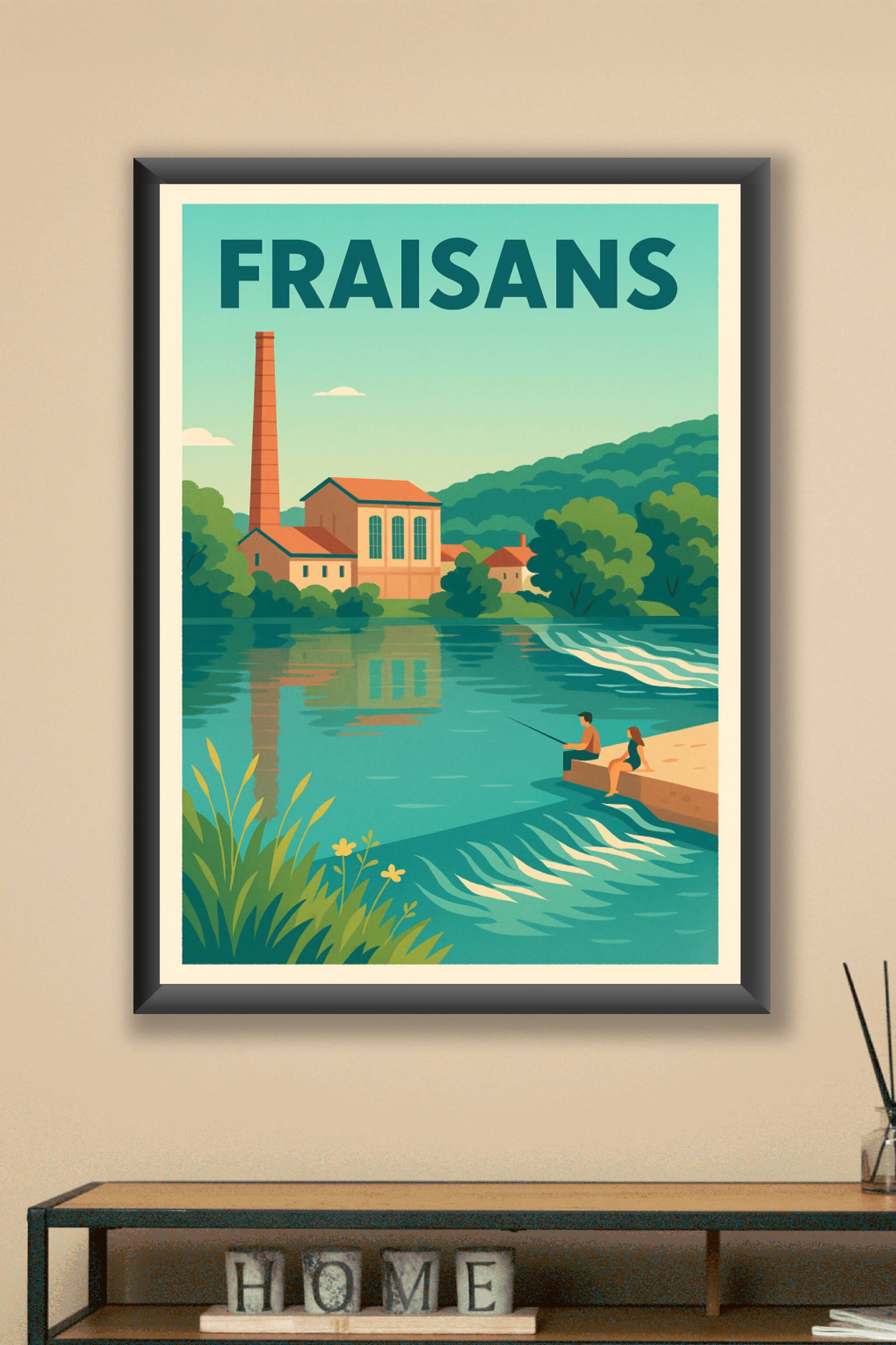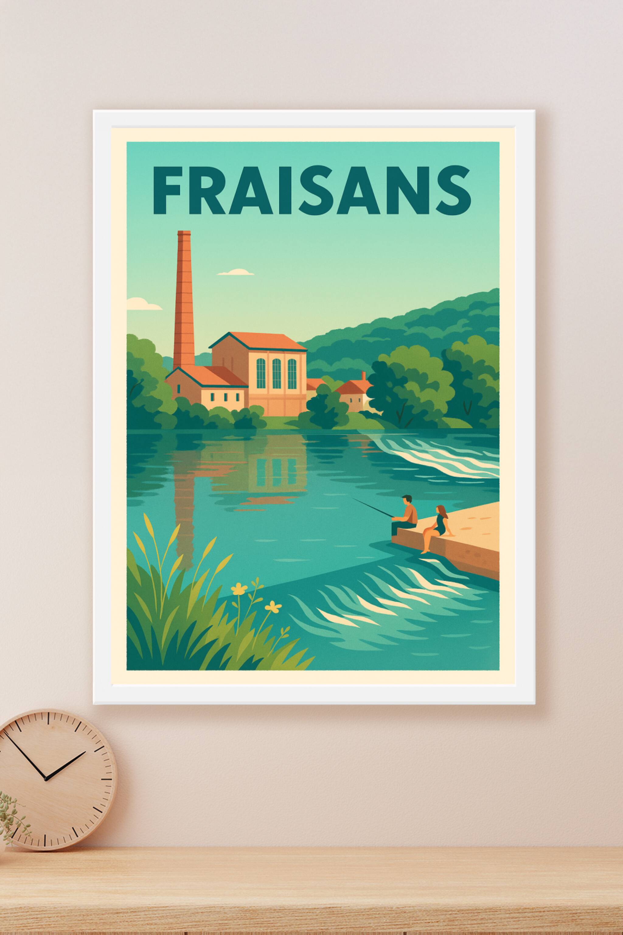 Découvrez la quiétude de Fraisans avec cette affiche qui illustre une scène paisible au bord de la rivière, où se mêlent nature luxuriante et archi...