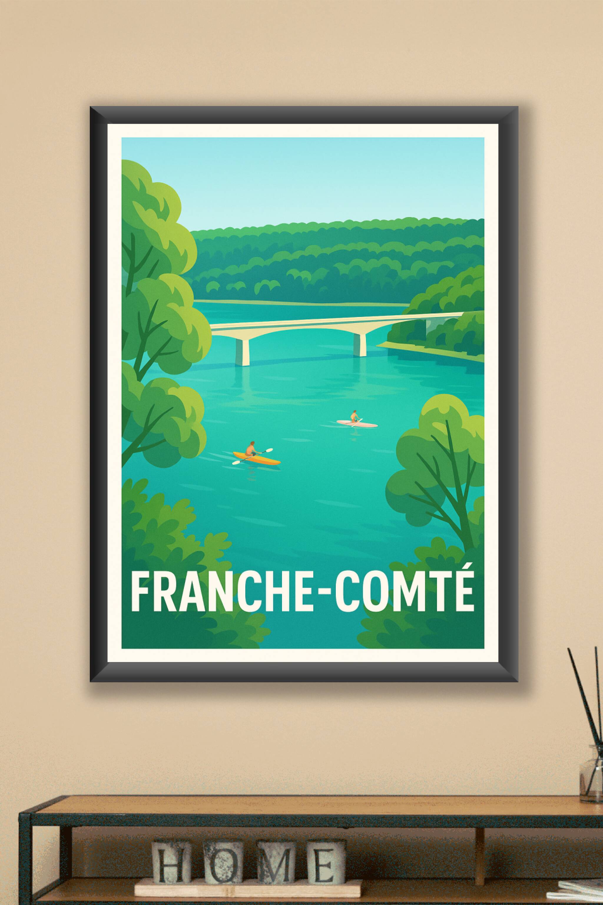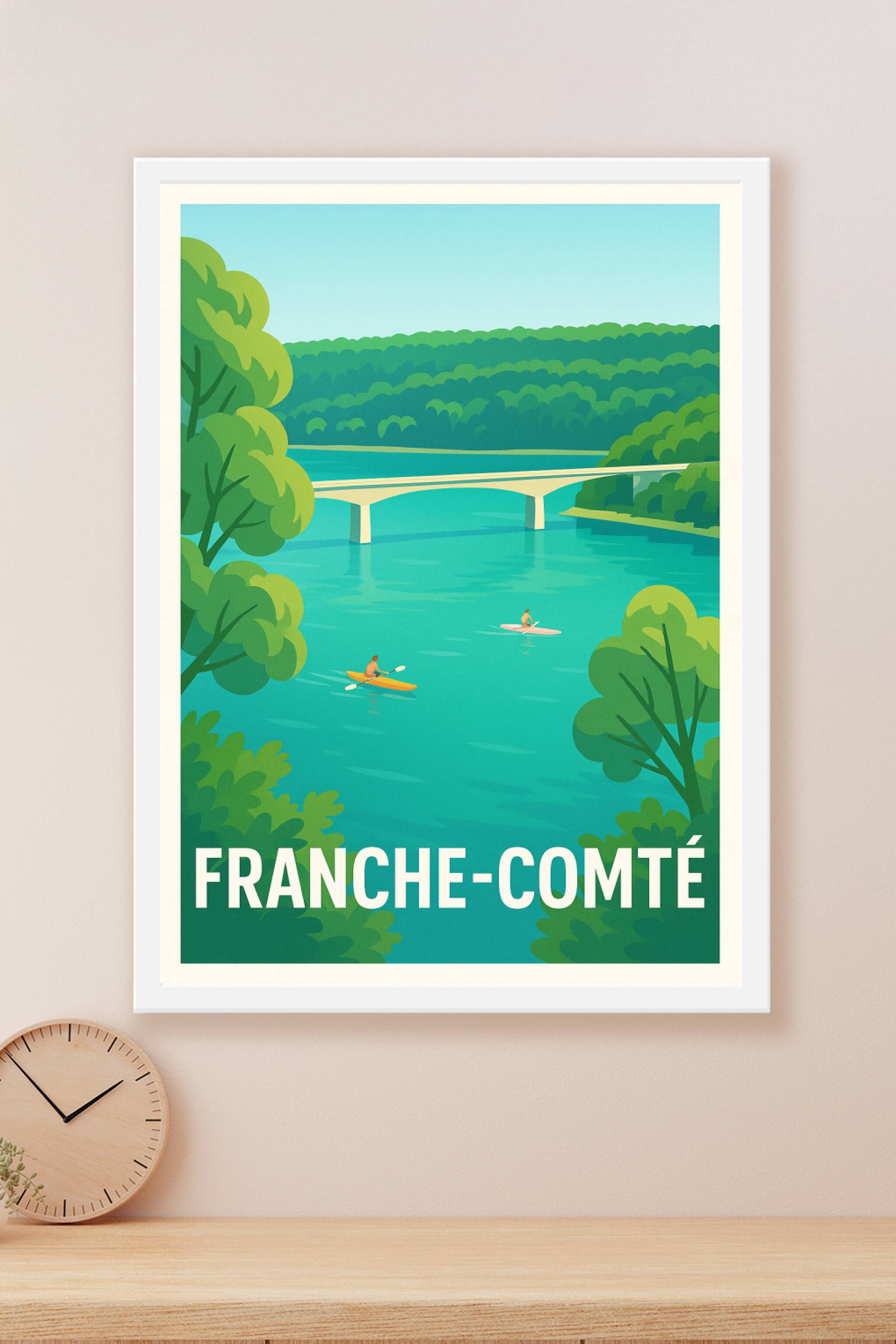 Découvrez la sérénité des paysages verdoyants de la Franche-Comté avec cette affiche illustrée mettant en scène des kayaks glissant sur une rivière...