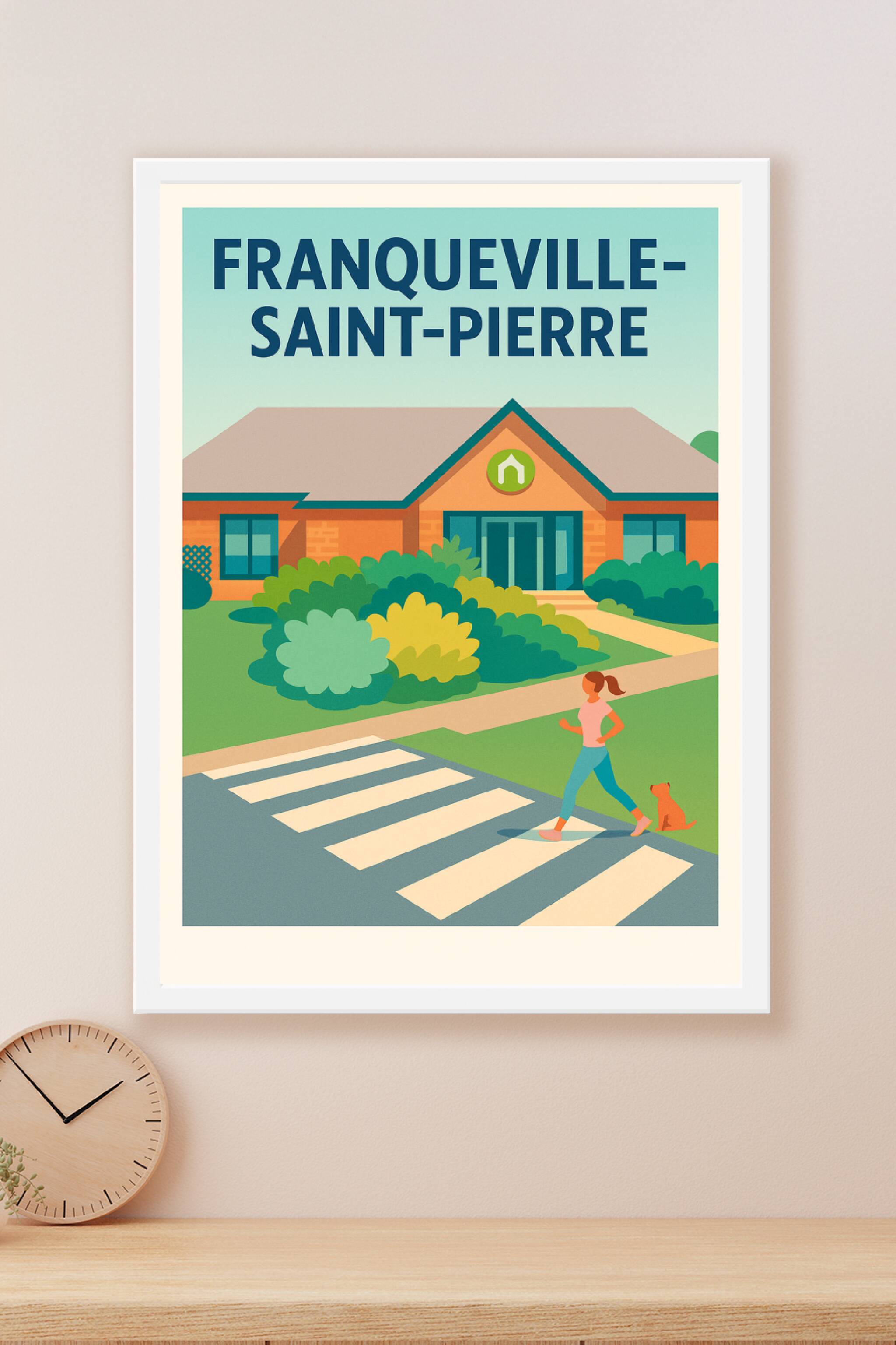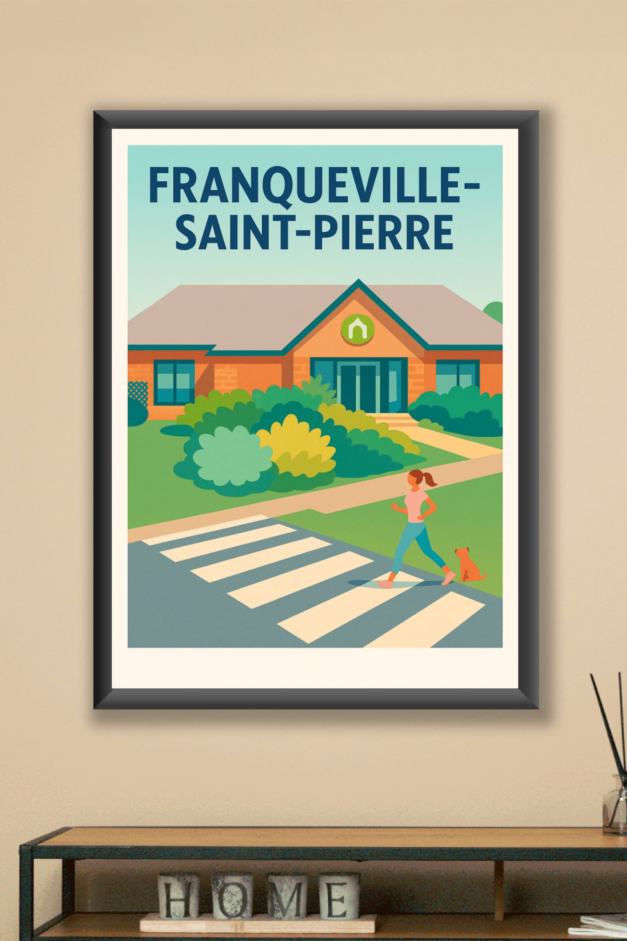 Découvrez l'ambiance paisible de Franqueville-Saint-Pierre avec cette affiche illustrée mettant en scène un quartier résidentiel verdoyant et convi...