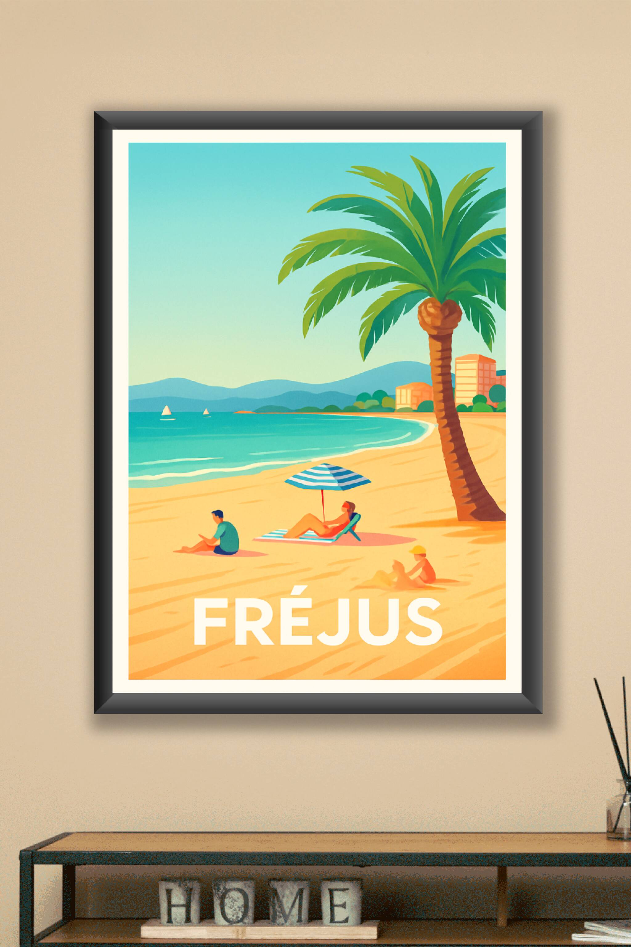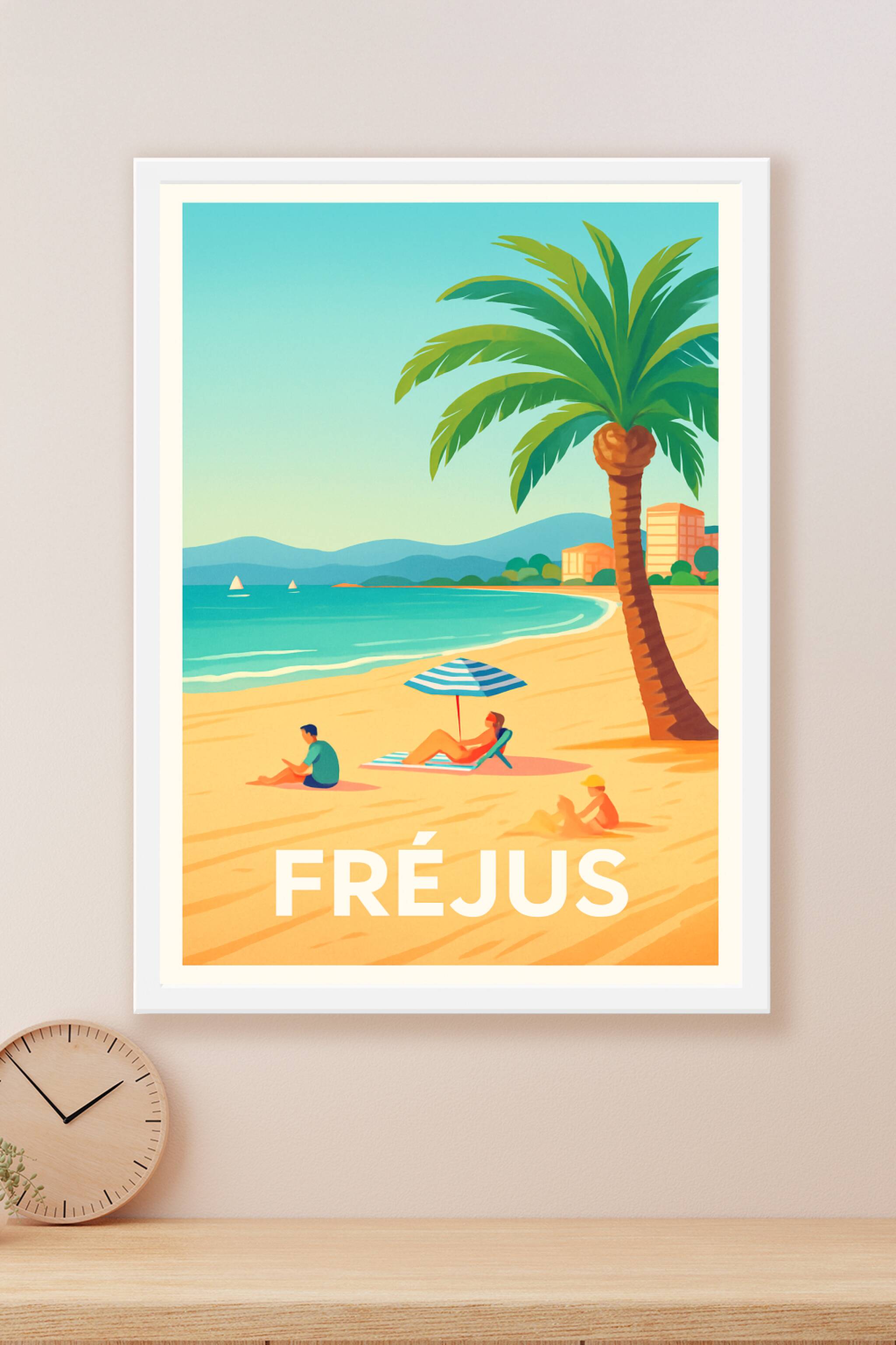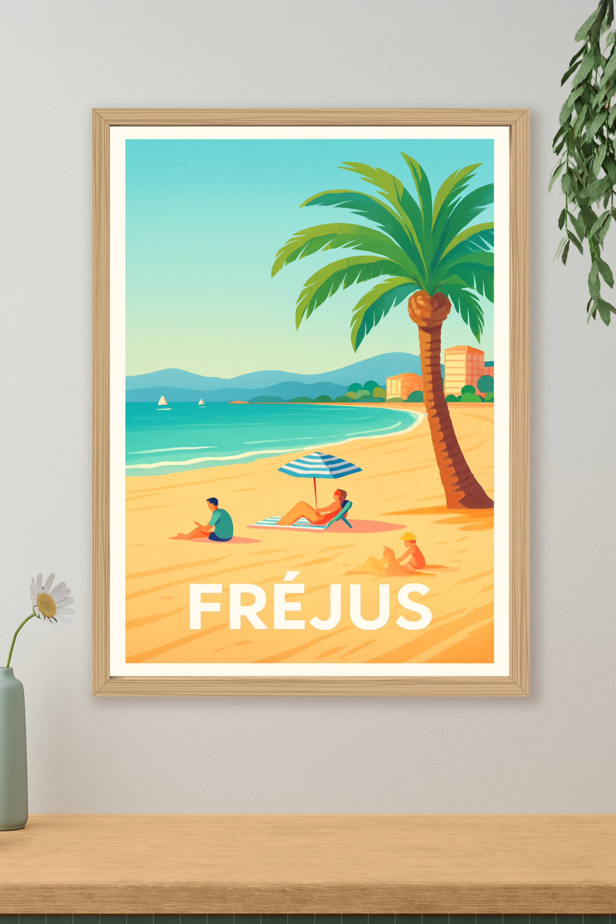 Évadez-vous sur les plages dorées de Fréjus avec cette affiche au style vintage illuminé par un ciel azur et une mer calme. Ce poster évoque parfai...