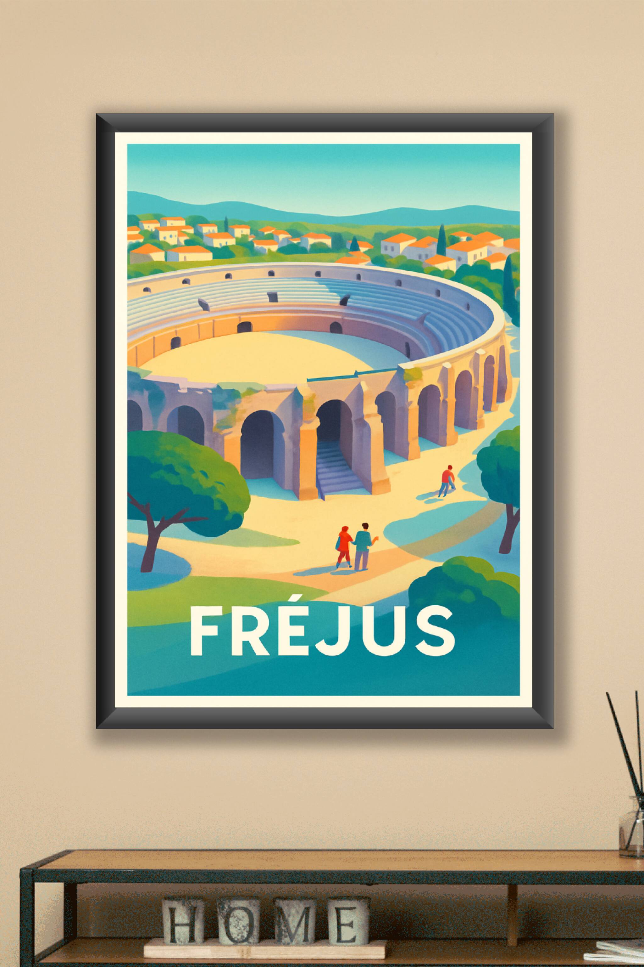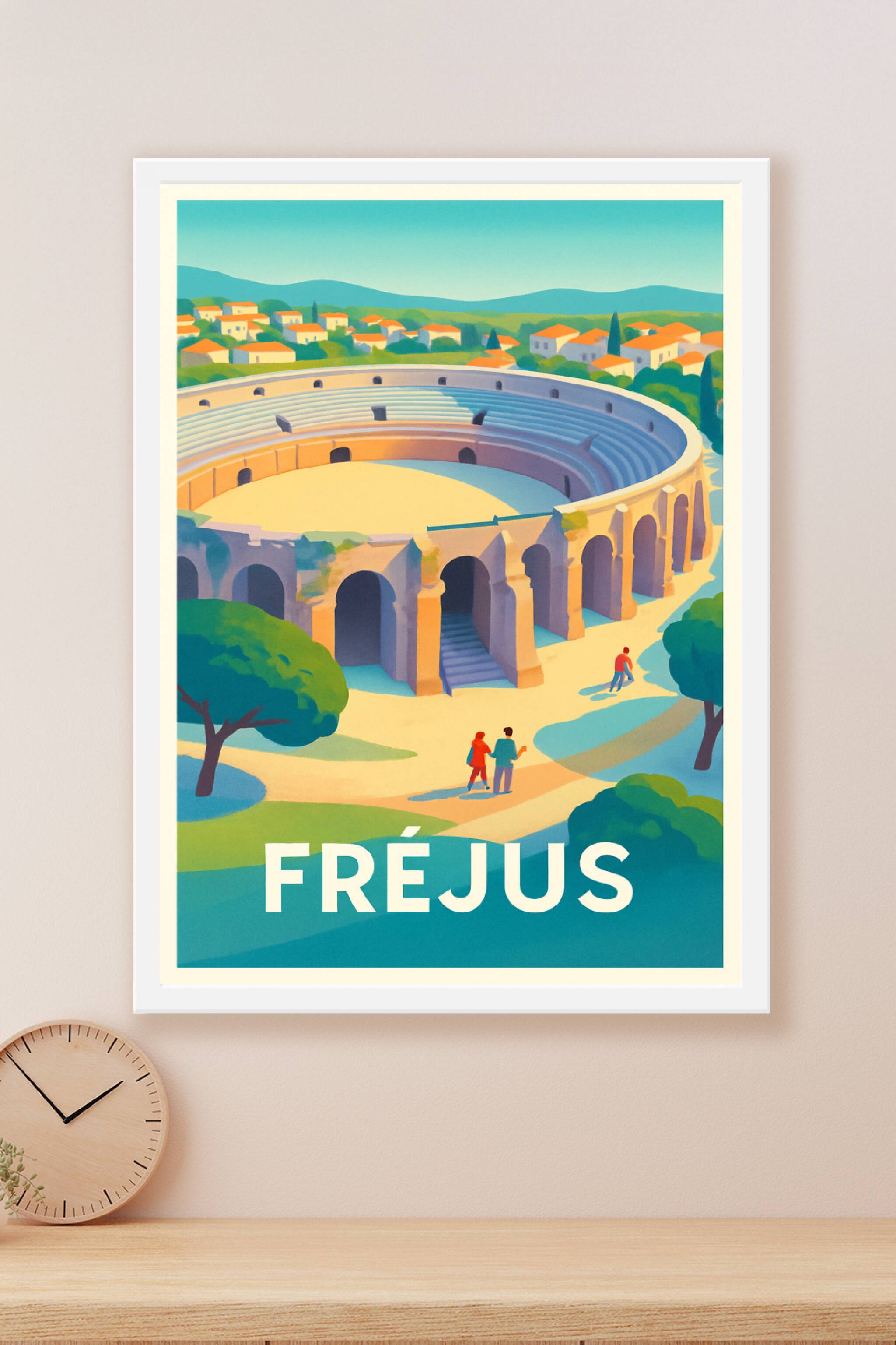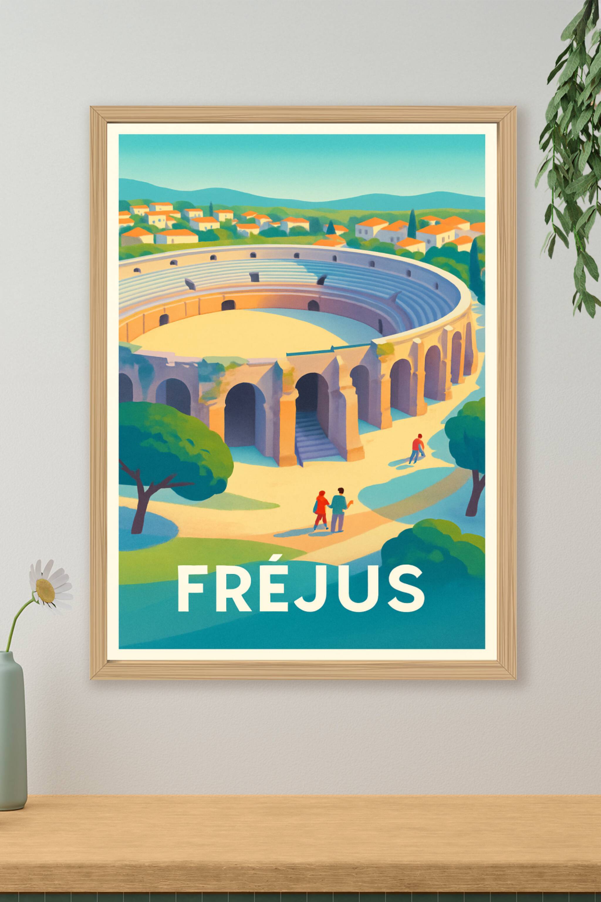 Découvrez cette magnifique affiche représentant l'amphithéâtre romain emblématique de Fréjus, baigné par une lumière douce et enveloppante. Ce post...