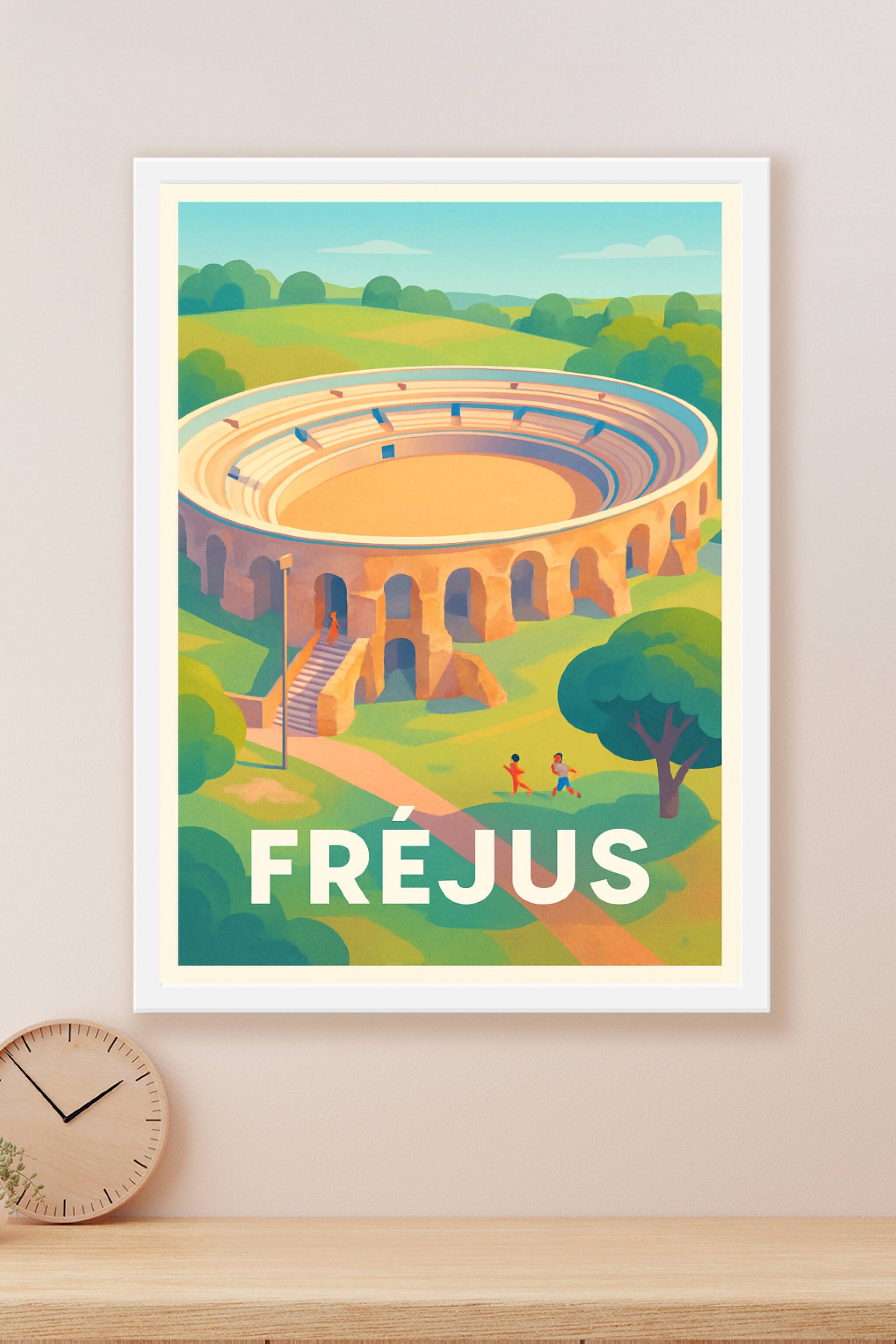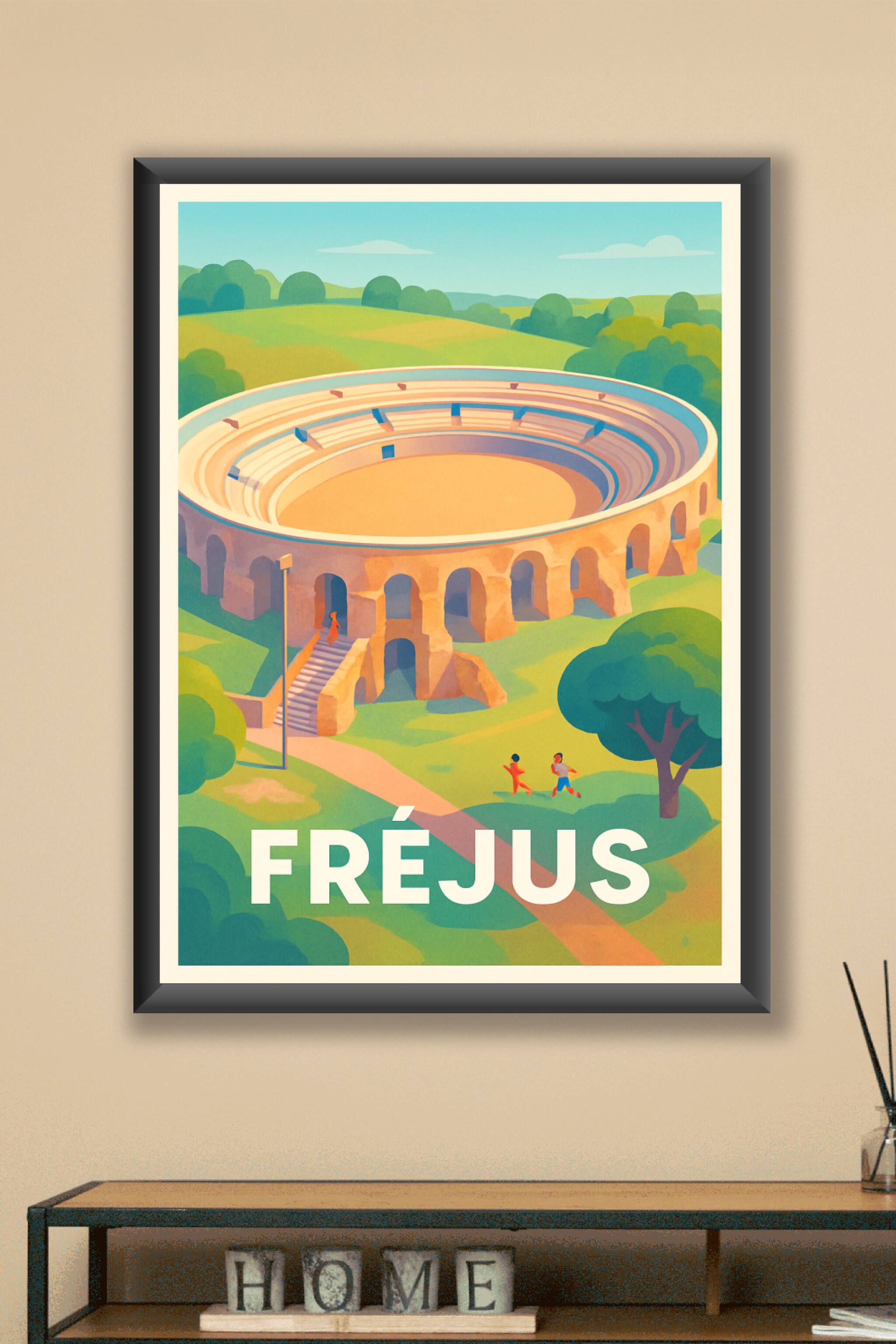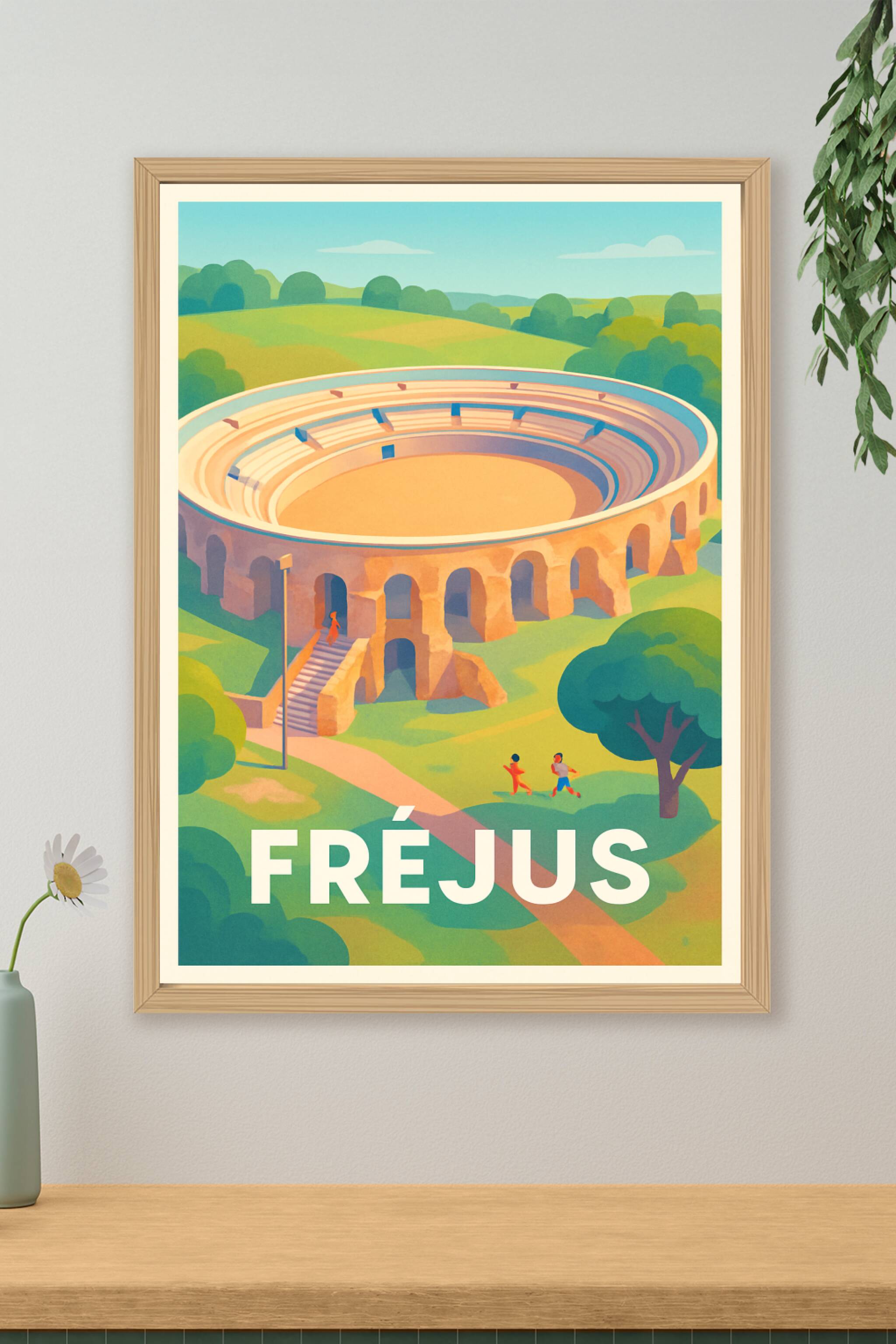 Découvrez cette superbe affiche illustrant l'arène romaine de Fréjus, un symbole historique niché au milieu d'un paysage verdoyant. Ce poster au st...