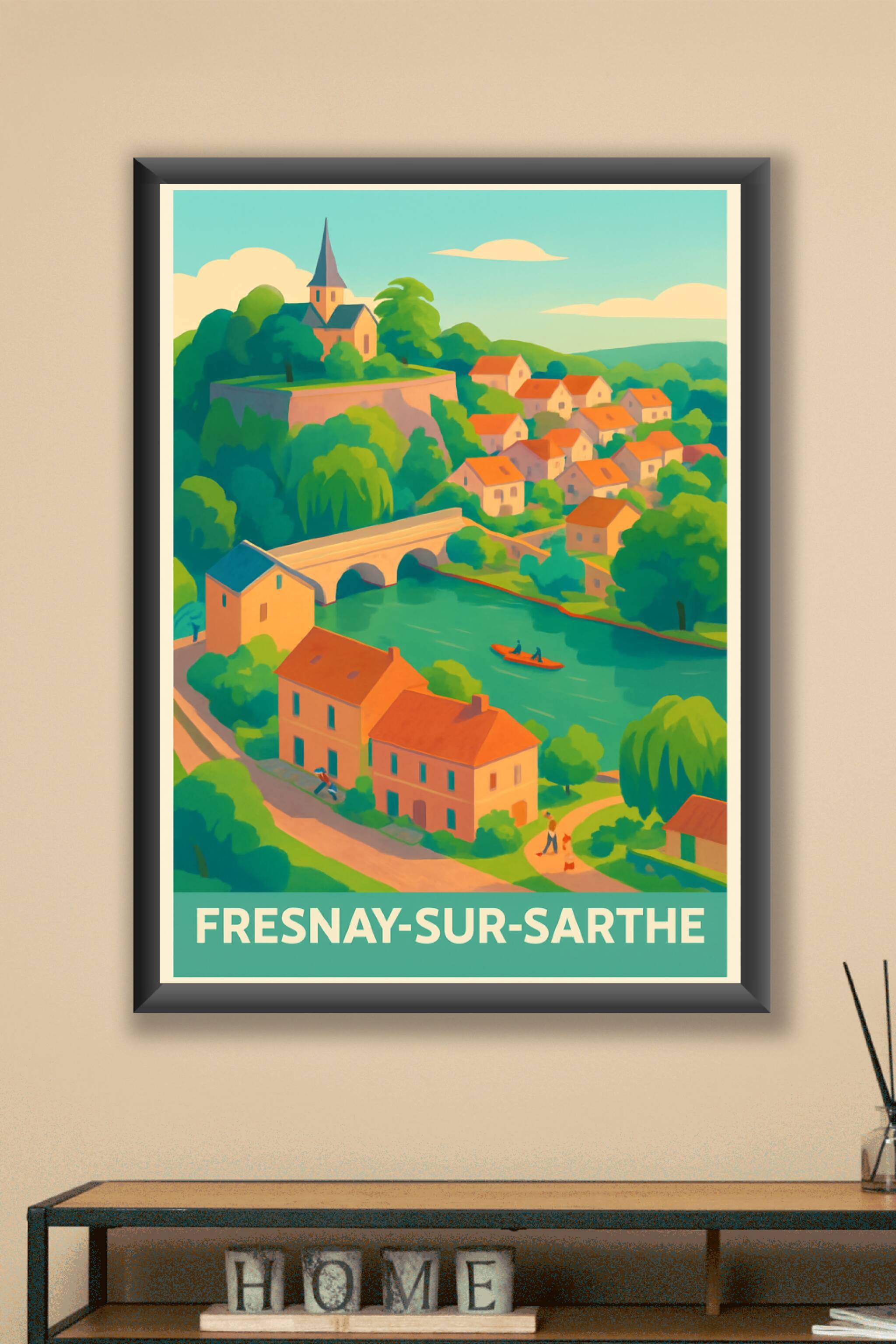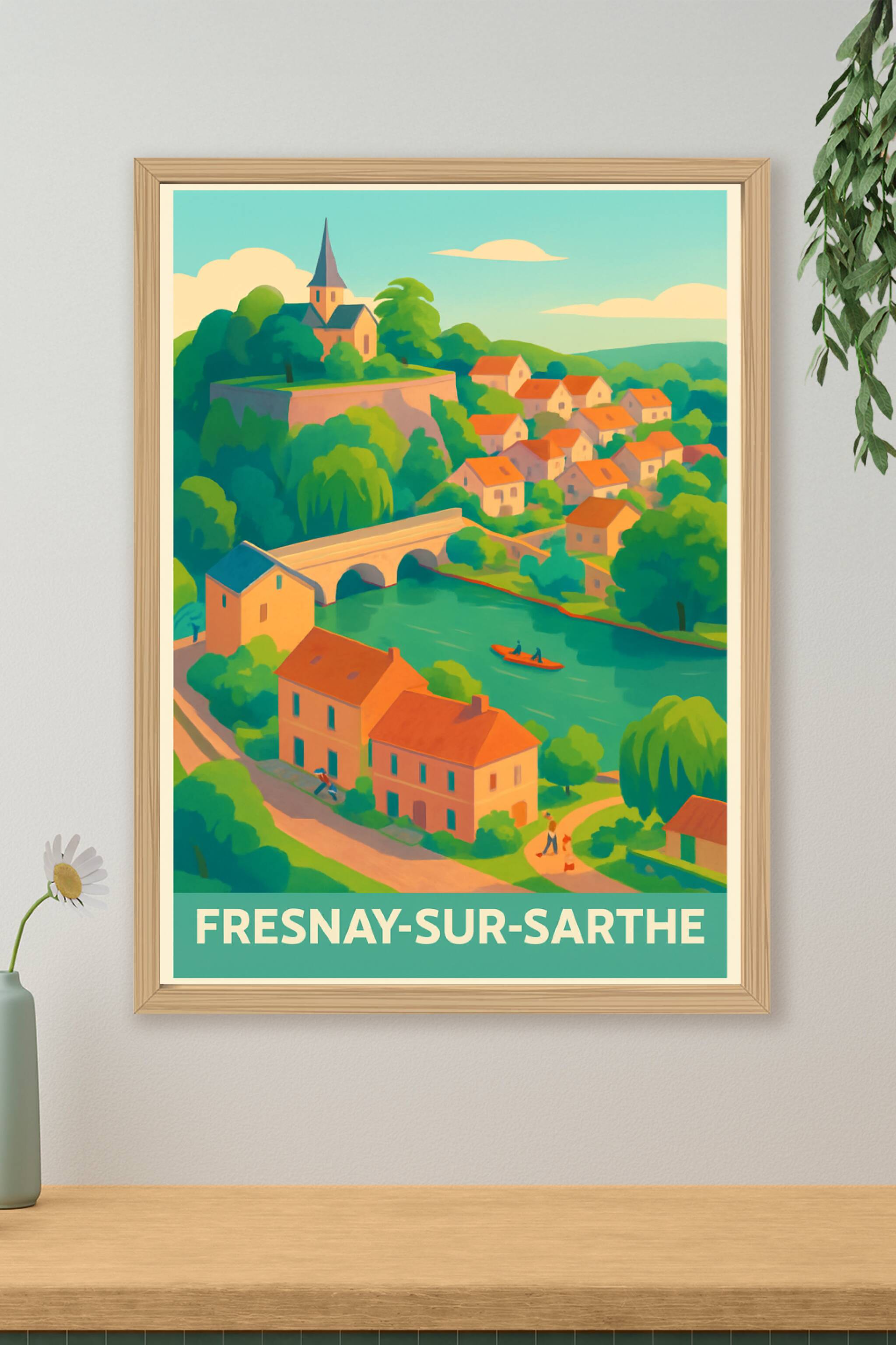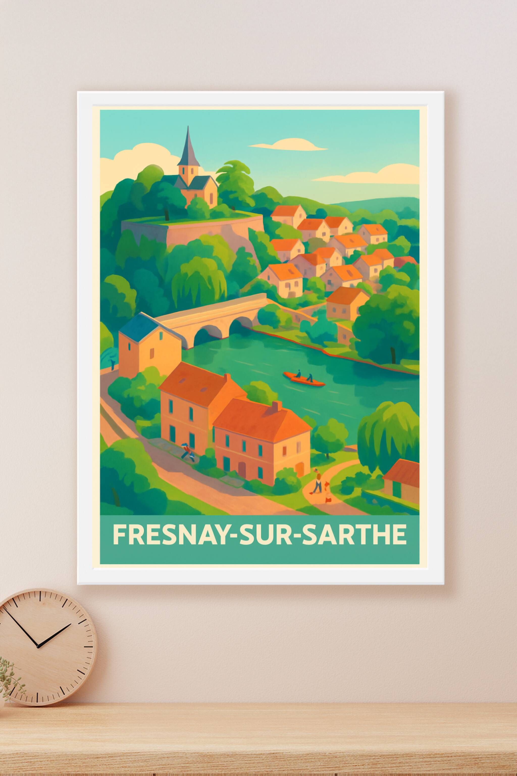 Découvrez l'atmosphère paisible et colorée de Fresnay-sur-Sarthe à travers cette affiche illustrée mettant en scène ses maisons traditionnelles et ...