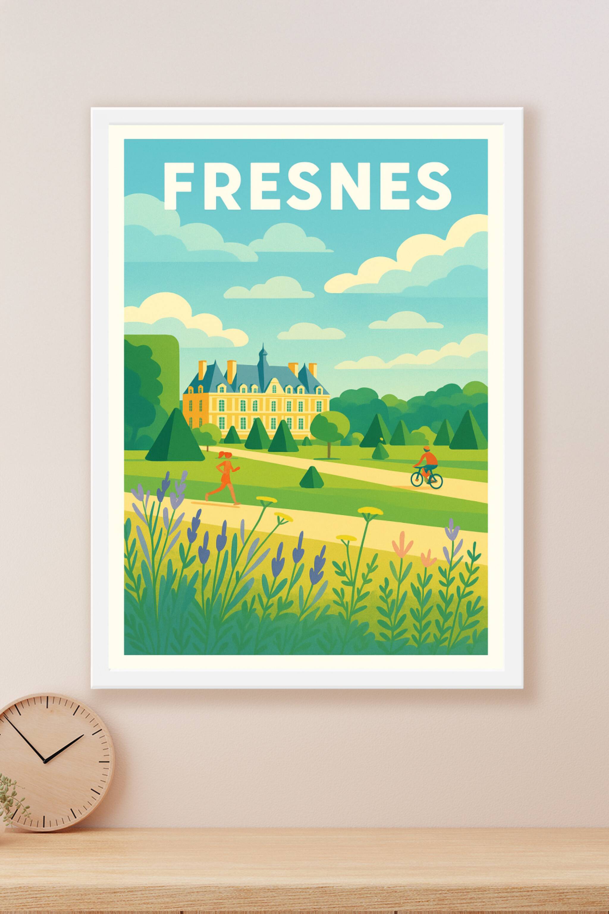Découvrez la douceur et le charme de Fresnes avec cette affiche au style vintage, représentant un paysage bucolique où se mêlent un château majestu...