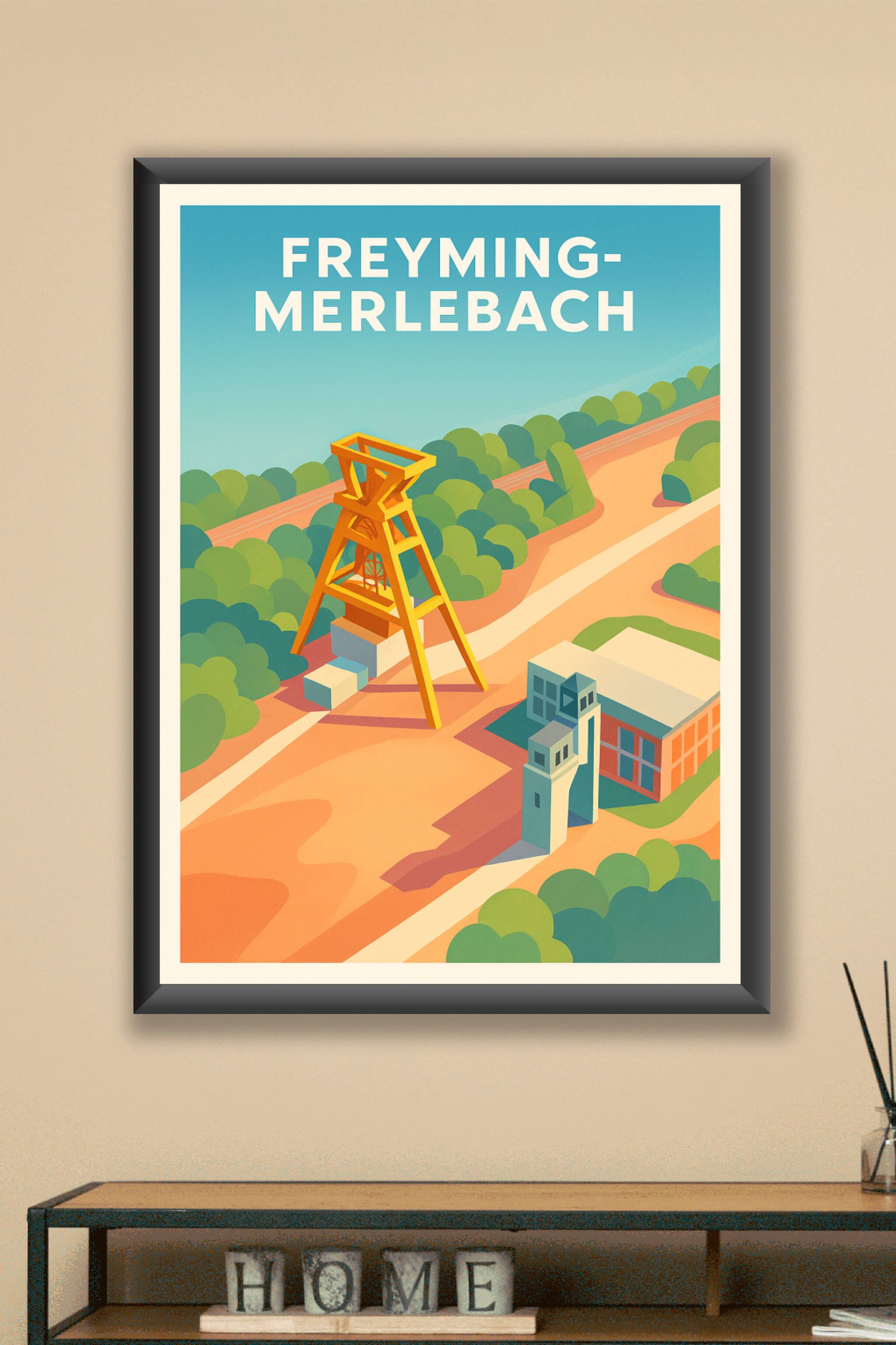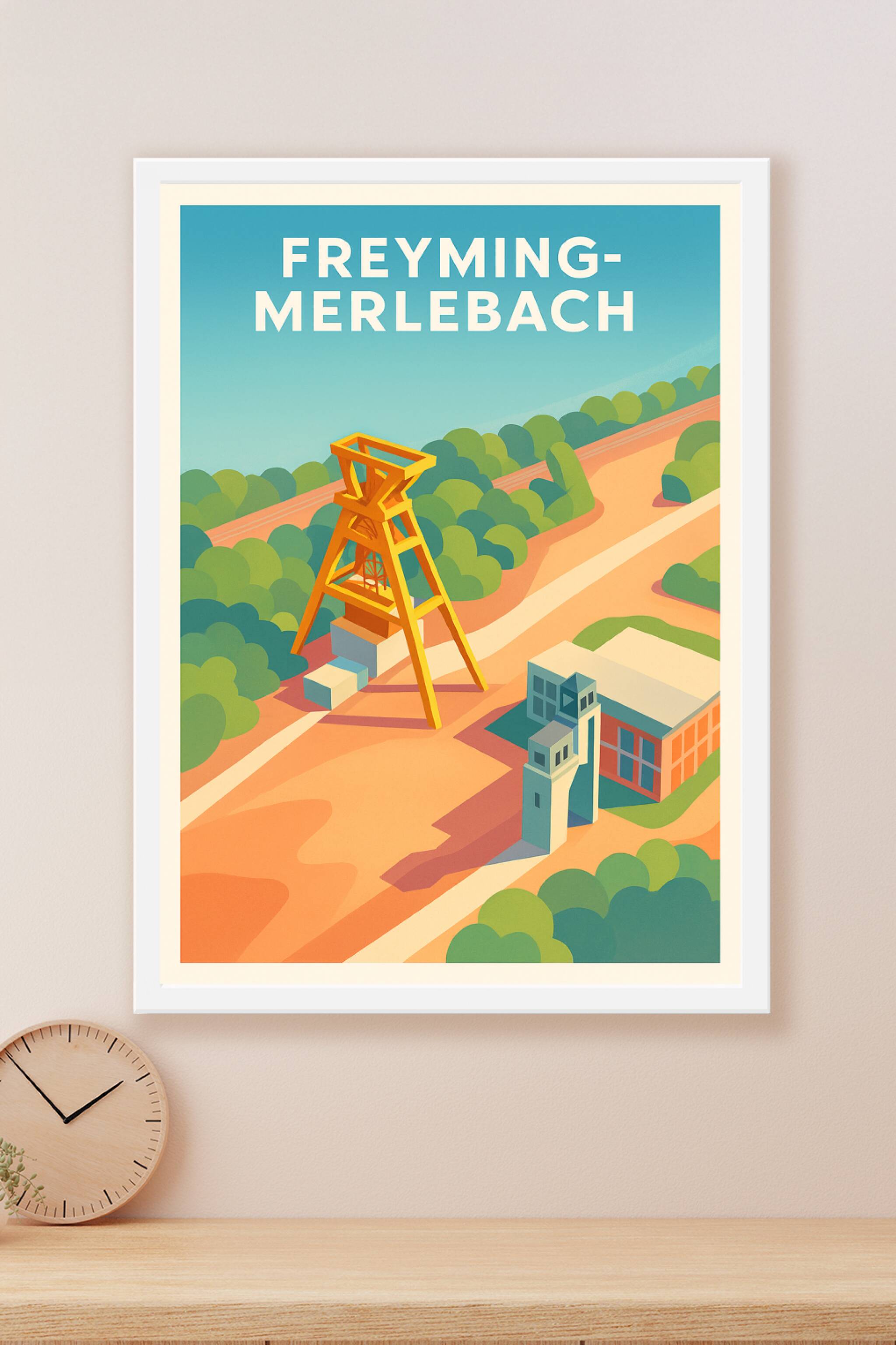 Découvrez cette superbe affiche qui met en valeur le patrimoine industriel emblématique de Freyming-Merlebach dans un style graphique moderne et lu...