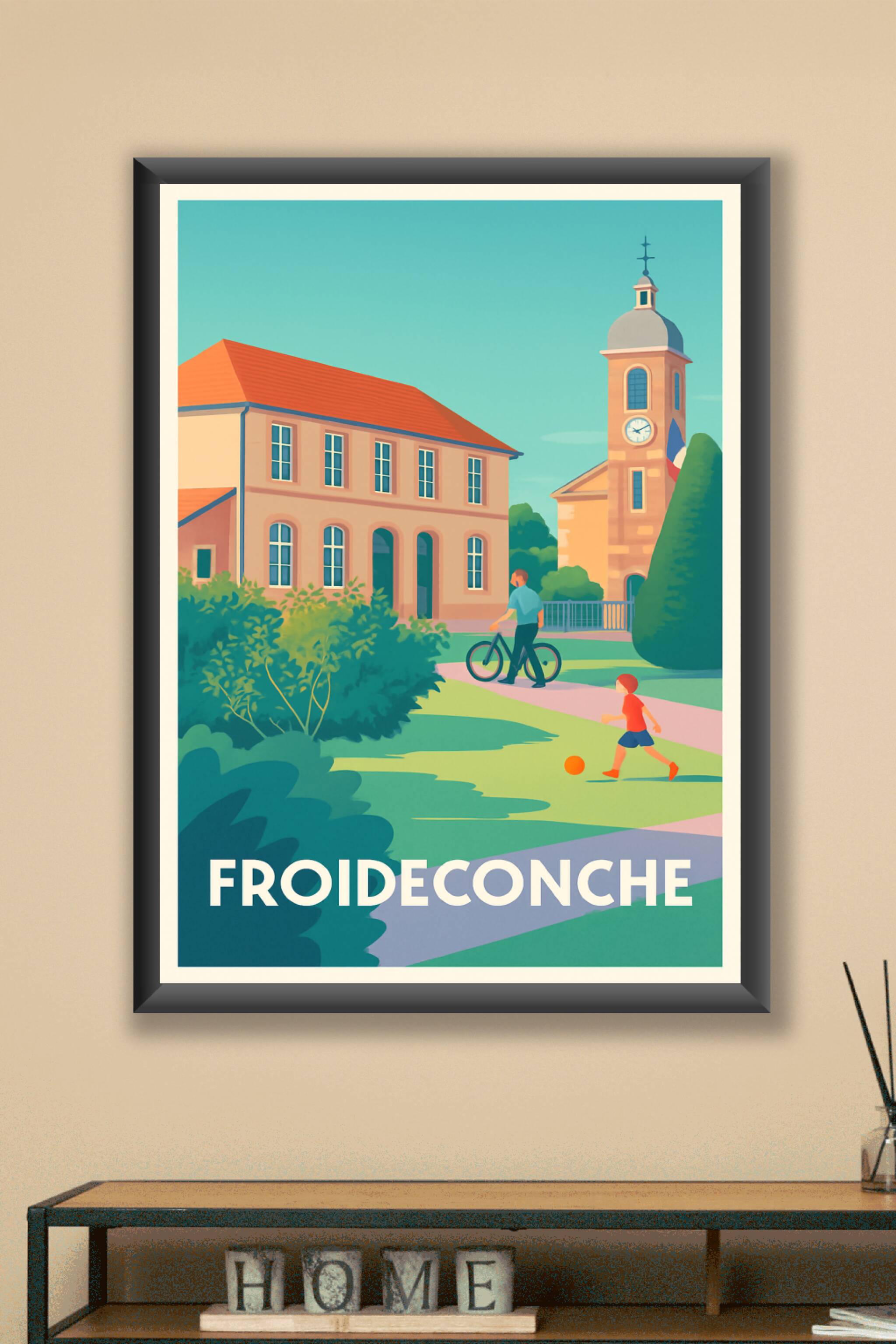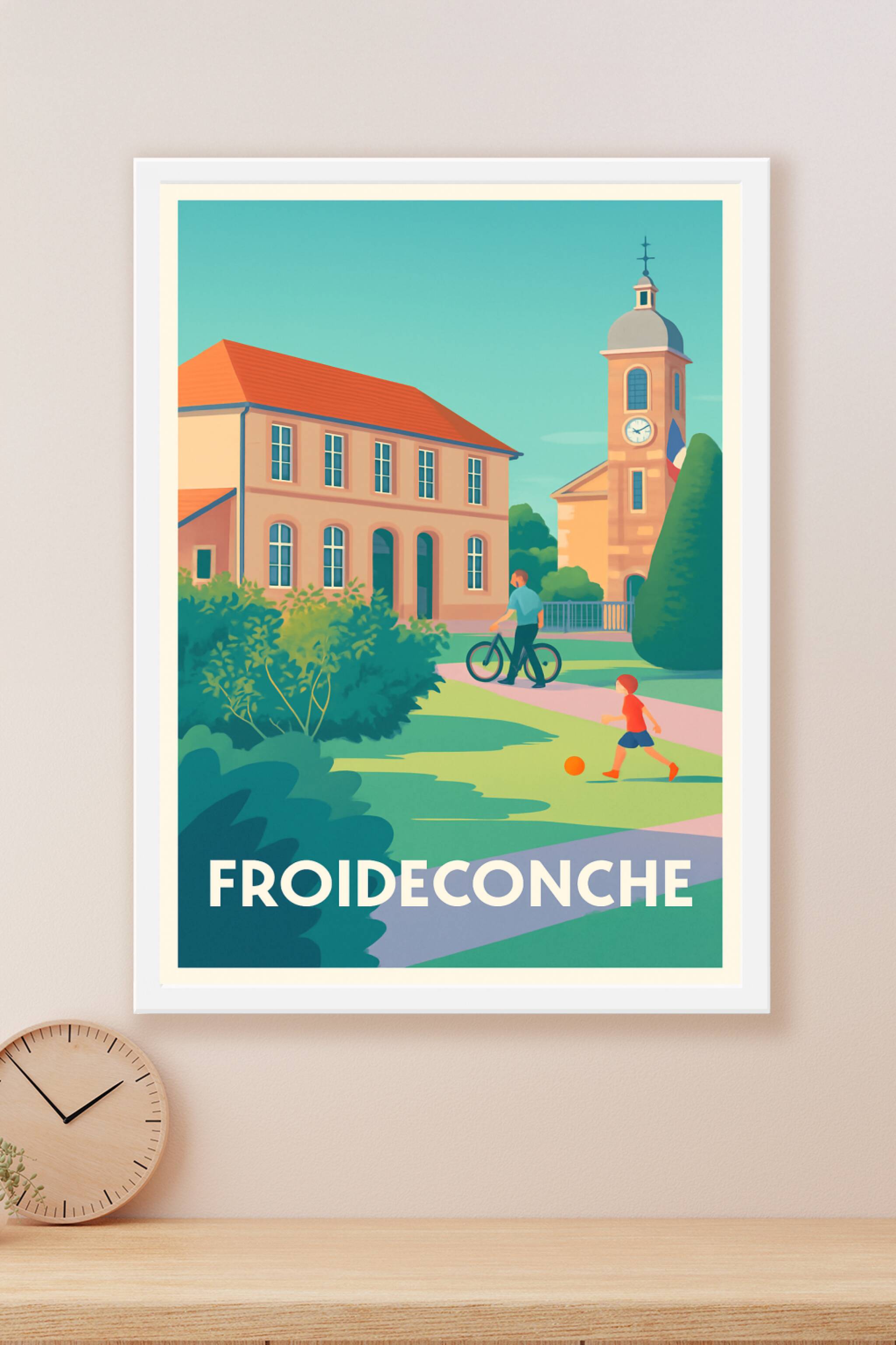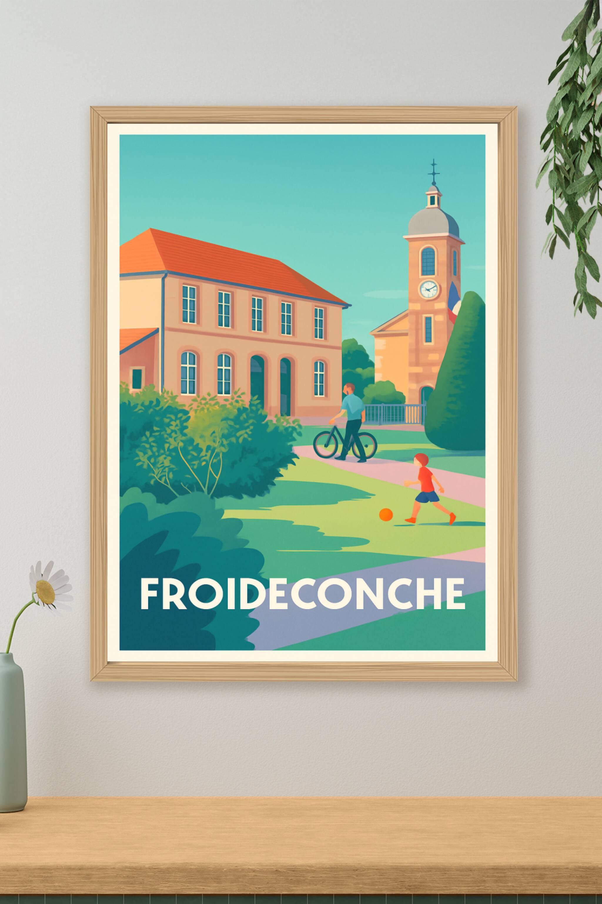 Découvrez l'atmosphère paisible de Froideconche avec cette affiche illustrée qui capture un moment de vie simple et serein, entre nature et archite...