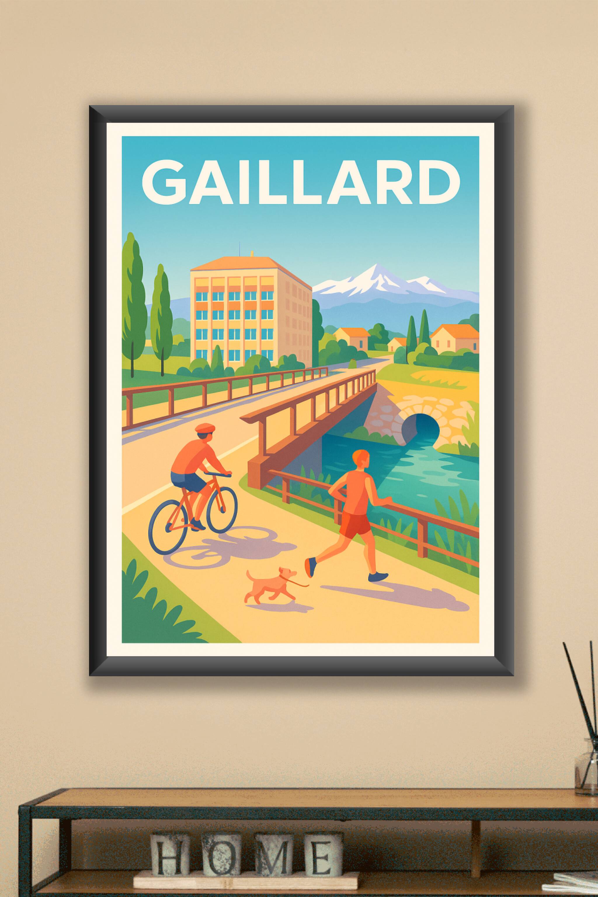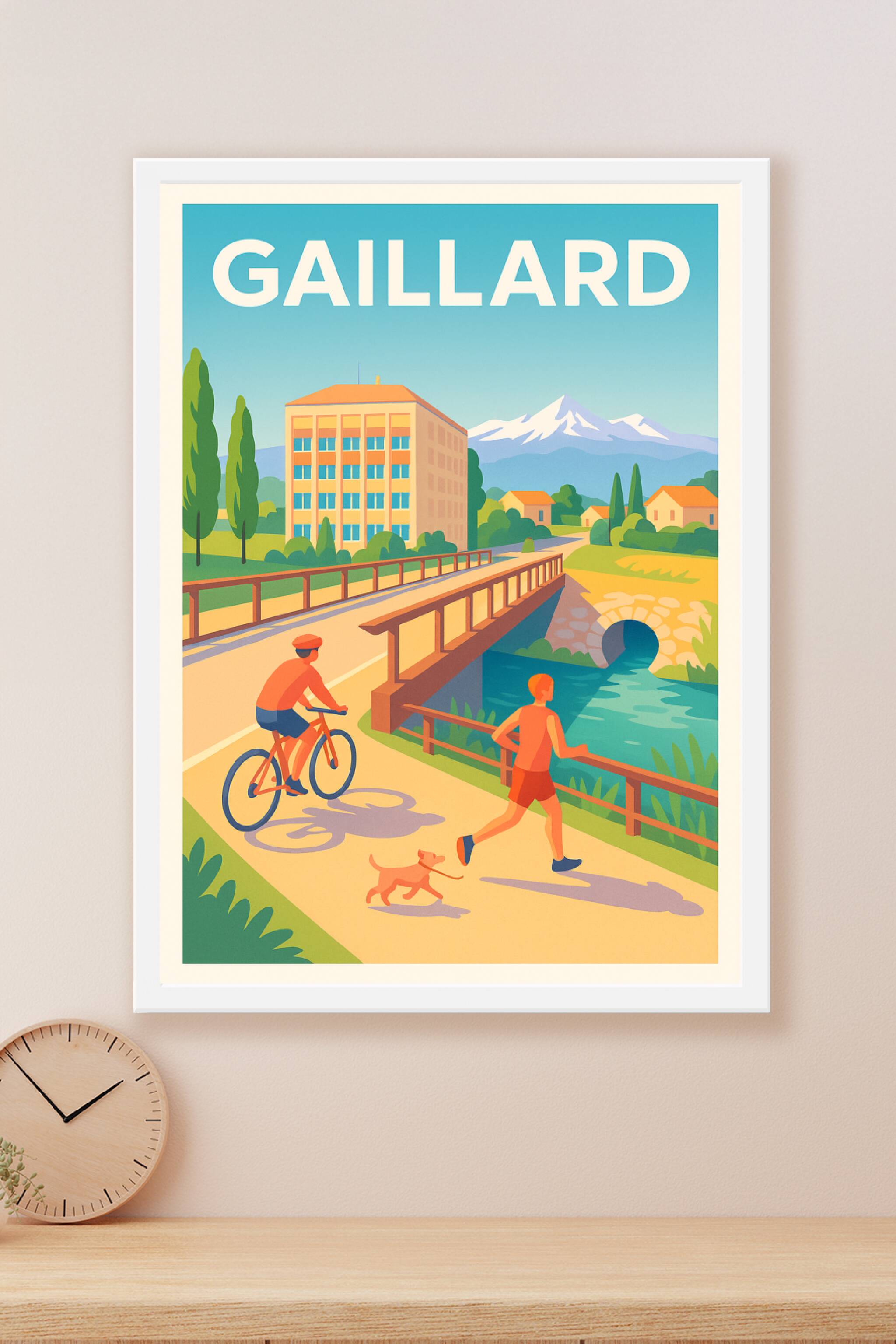 Découvrez Gaillard à travers cette affiche vibrante qui met en scène une balade sportive entre vélo et jogging, au bord d'une rivière limpide avec ...