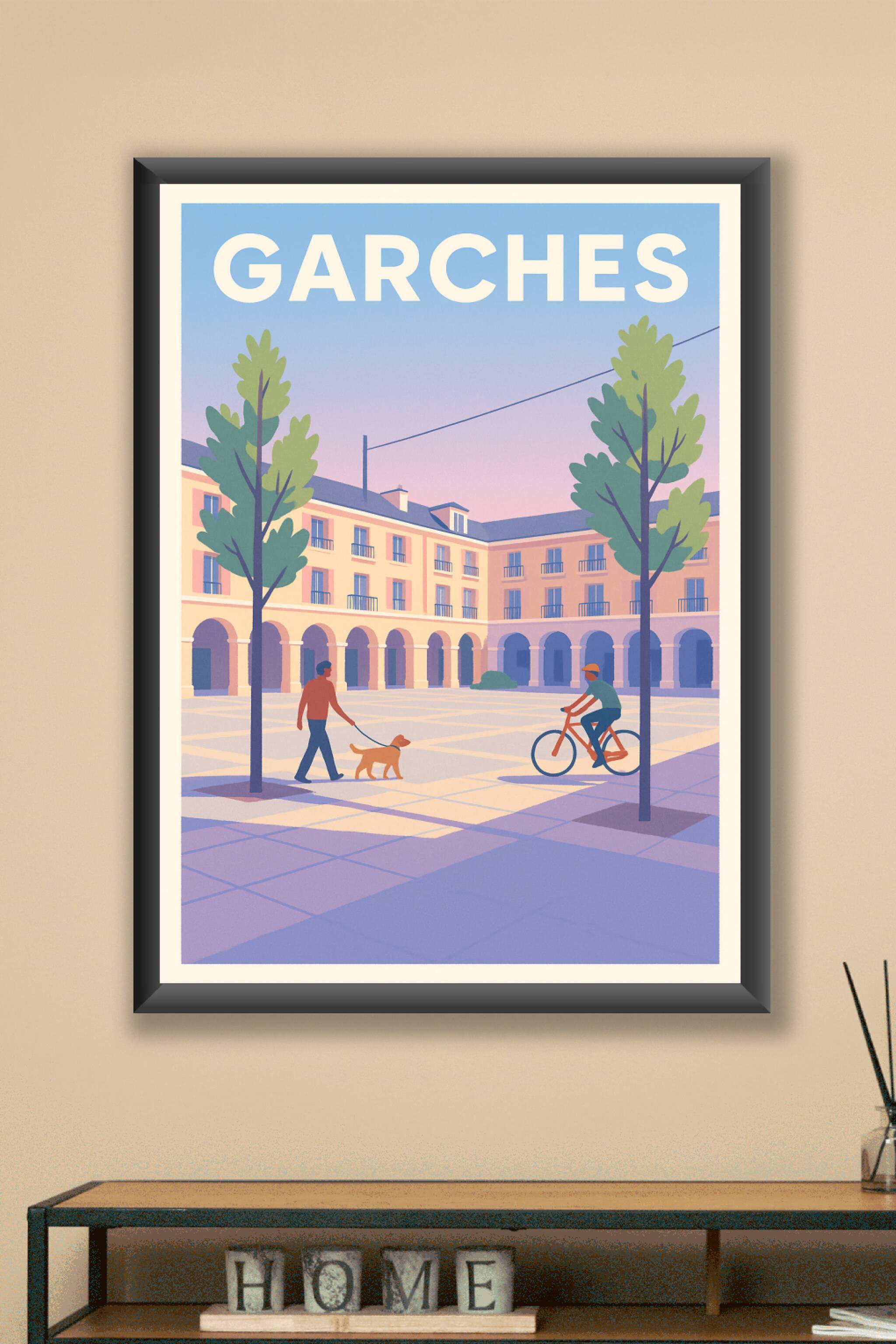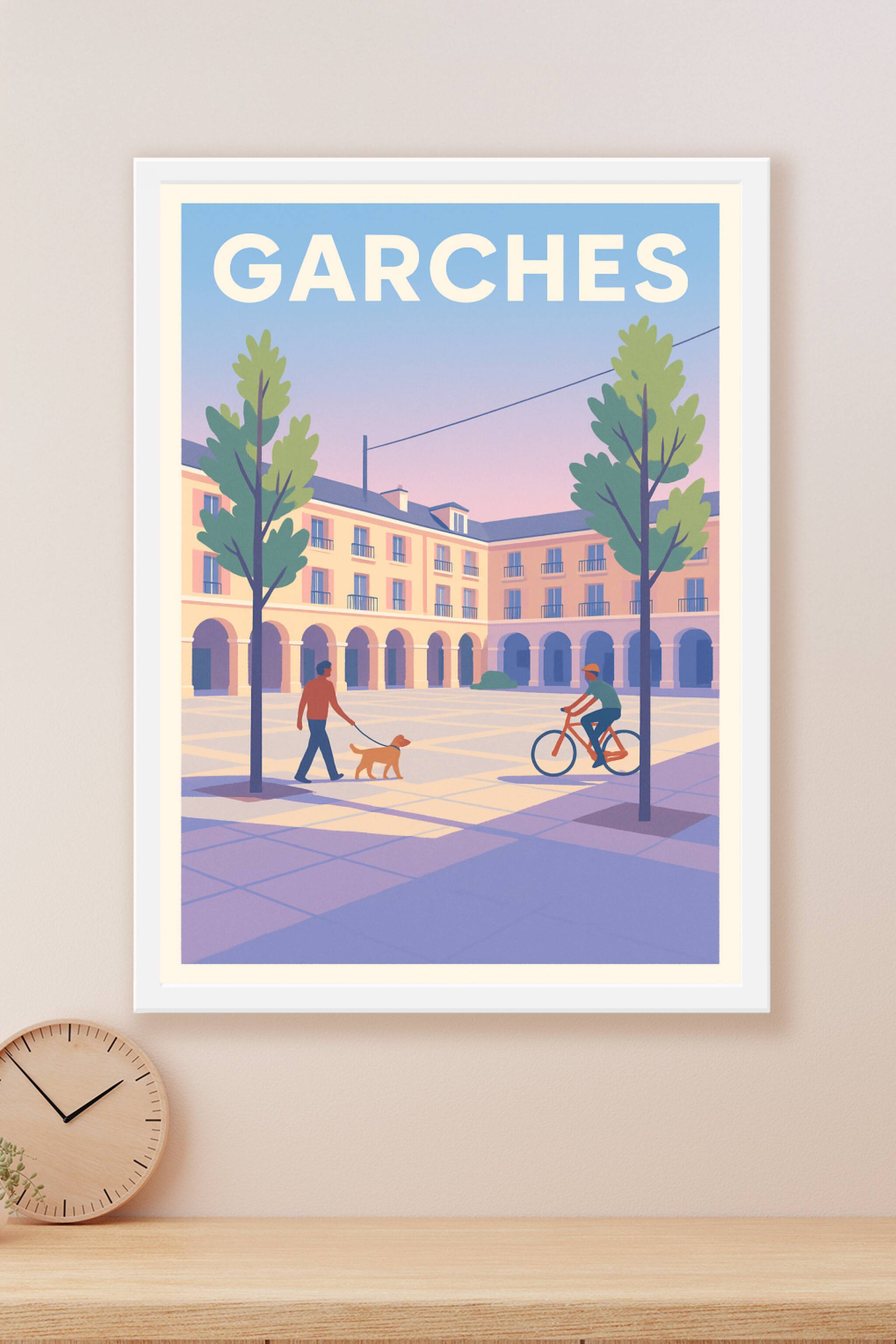 Découvrez l'élégance tranquille de Garches avec cette affiche au style doux et épuré qui capture une scène paisible dans une cour urbaine. Les tein...