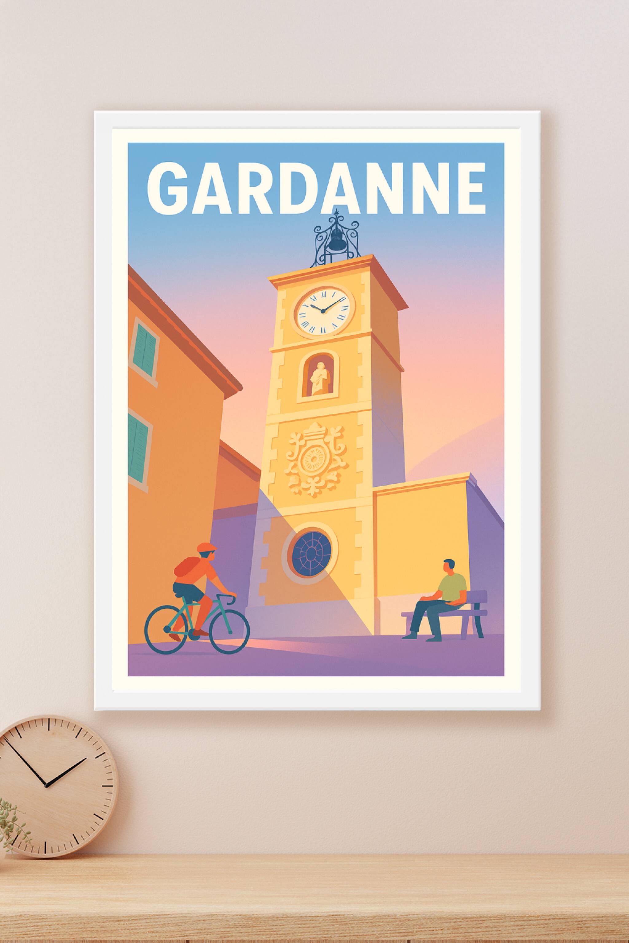Apportez une touche chaleureuse et apaisante à votre décoration avec cette affiche illustrée mettant en avant le charme architectural de Gardanne. Cette scène baignée dans une douce lumière de fin de journée capture l'essence d'un moment paisible, entre cycliste et flâneur, aux pieds de l'emblématique horloge de la ville. Ce poster est imprimé en tirage "Fine Art" sur papier 305g coton pour une qualité d'impression exceptionnelle, garantissant des couleurs vives et un rendu durable. Disponible en formats A1 à A4, avec ou sans cadre, cette affiche s'adapte à tous vos espaces et fait un cadeau idéal pour les amoureux de la Provence et de l'art visuel. Profitez d'un produit 100% fabriqué en France, pour une décoration élégante et raffinée.
