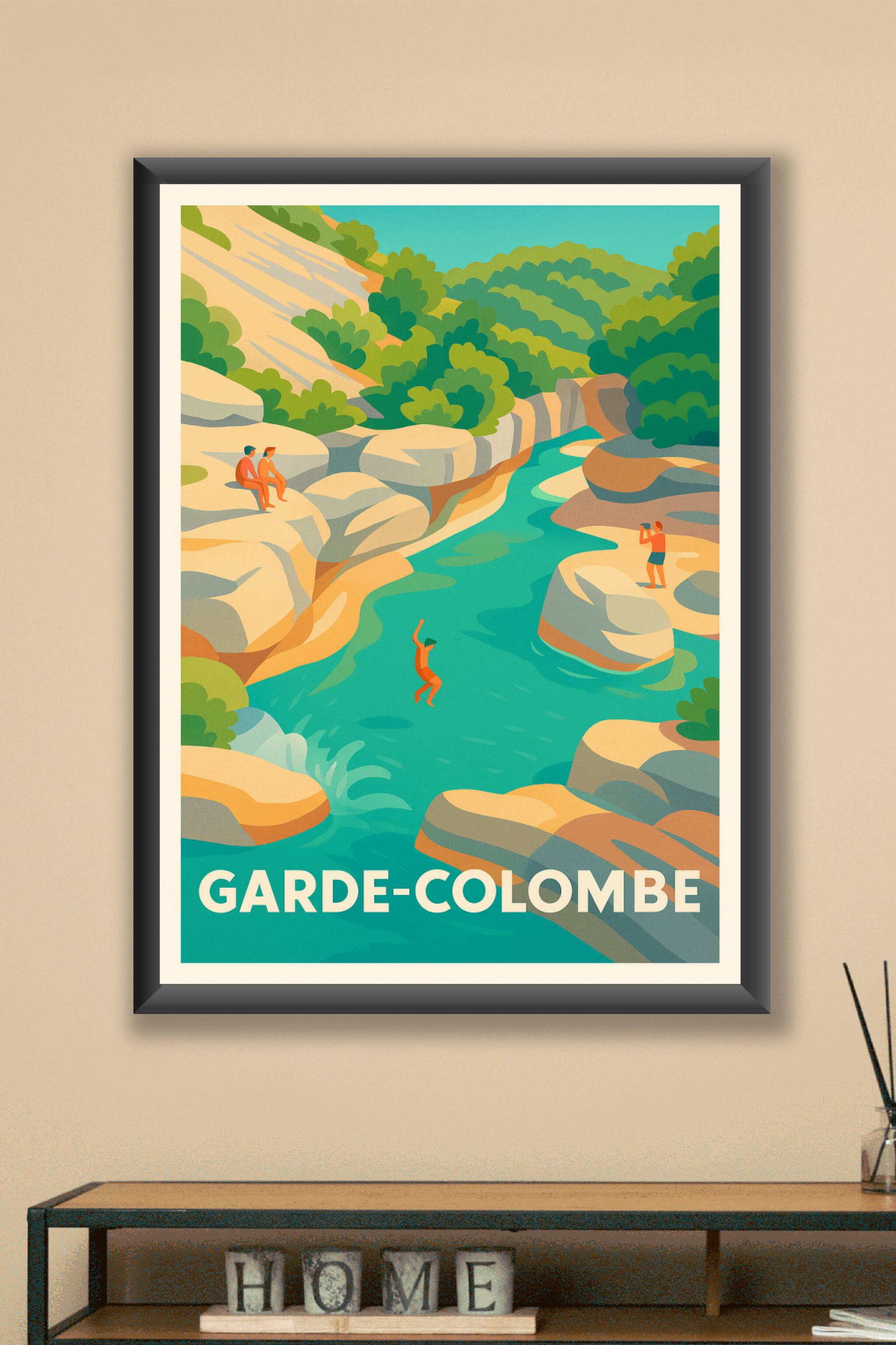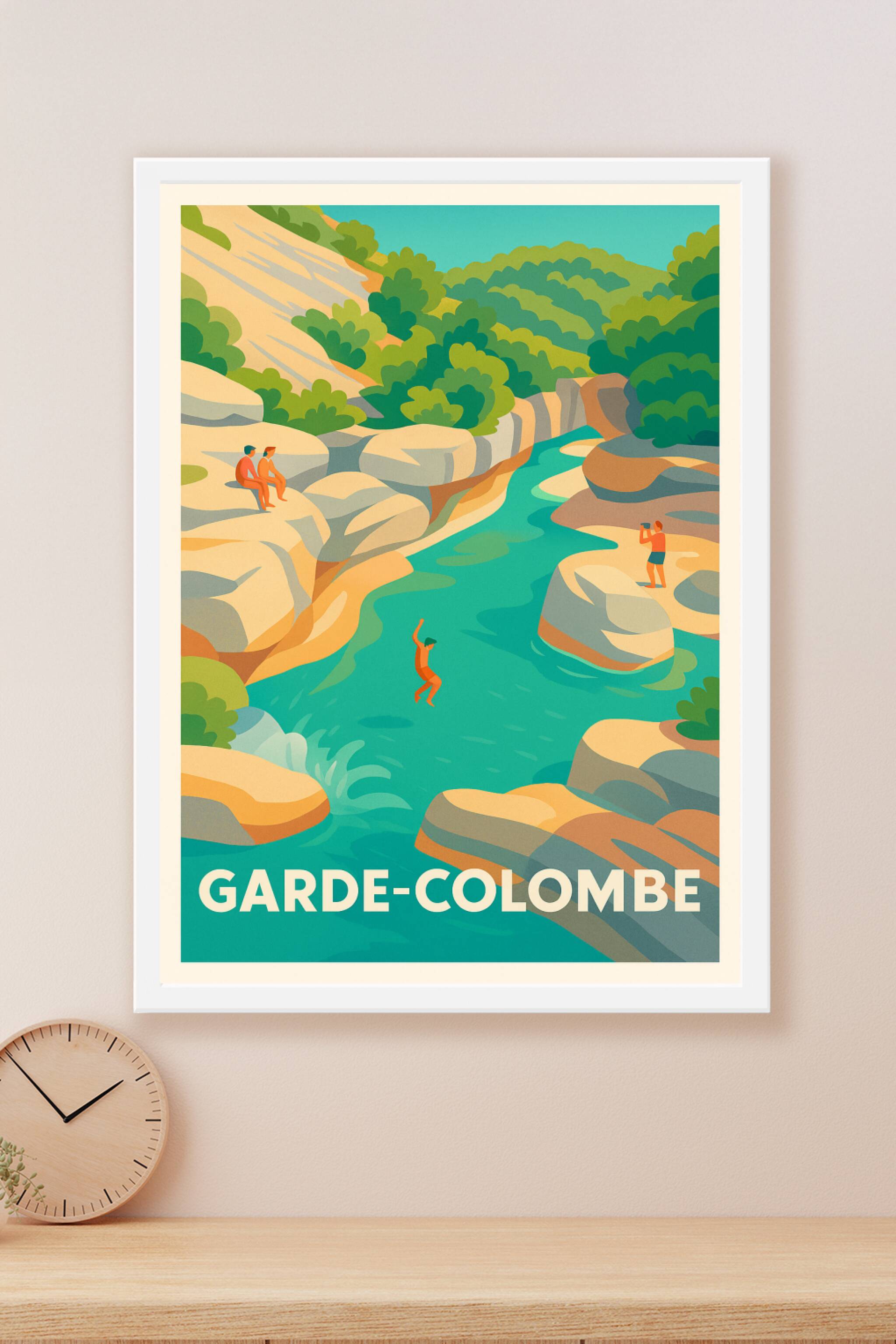Découvrez la sérénité et la beauté sauvage de Garde-Colombe à travers cette affiche illustrée aux couleurs douces et contrastées. Cette scène estivale met en avant la nature authentique et les plaisirs simples d'un plongeon dans une rivière cristalline entourée de rochers et de verdure luxuriante. Imprimée en tirage "Fine Art" sur un papier 305g coton de haute qualité, cette affiche/poster apporte une touche rafraîchissante et lumineuse à votre décoration intérieure. Disponible en formats A1 à A4, avec ou sans cadre, ce poster est idéal pour sublimer vos espaces de vie ou offrir un cadeau original et artistique aux amoureux de paysages naturels et de moments suspendus.