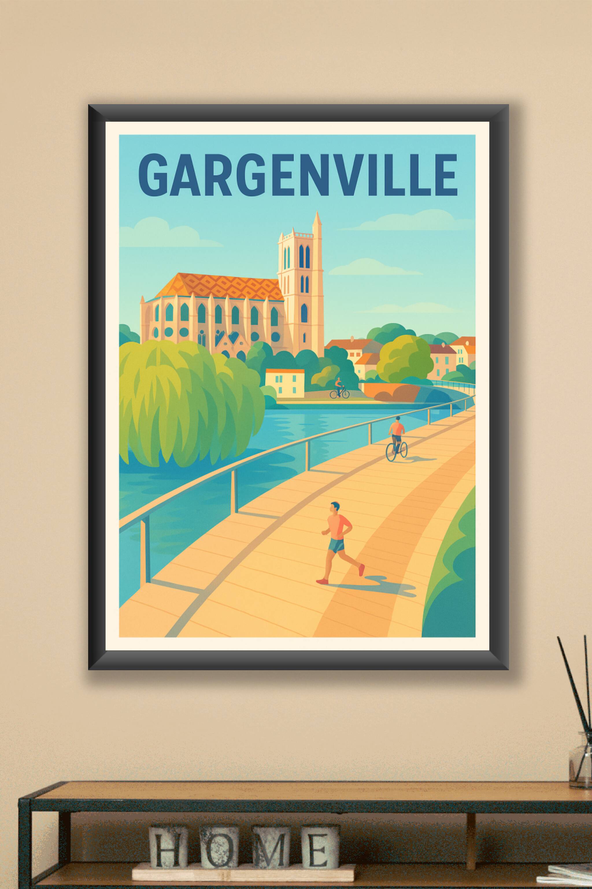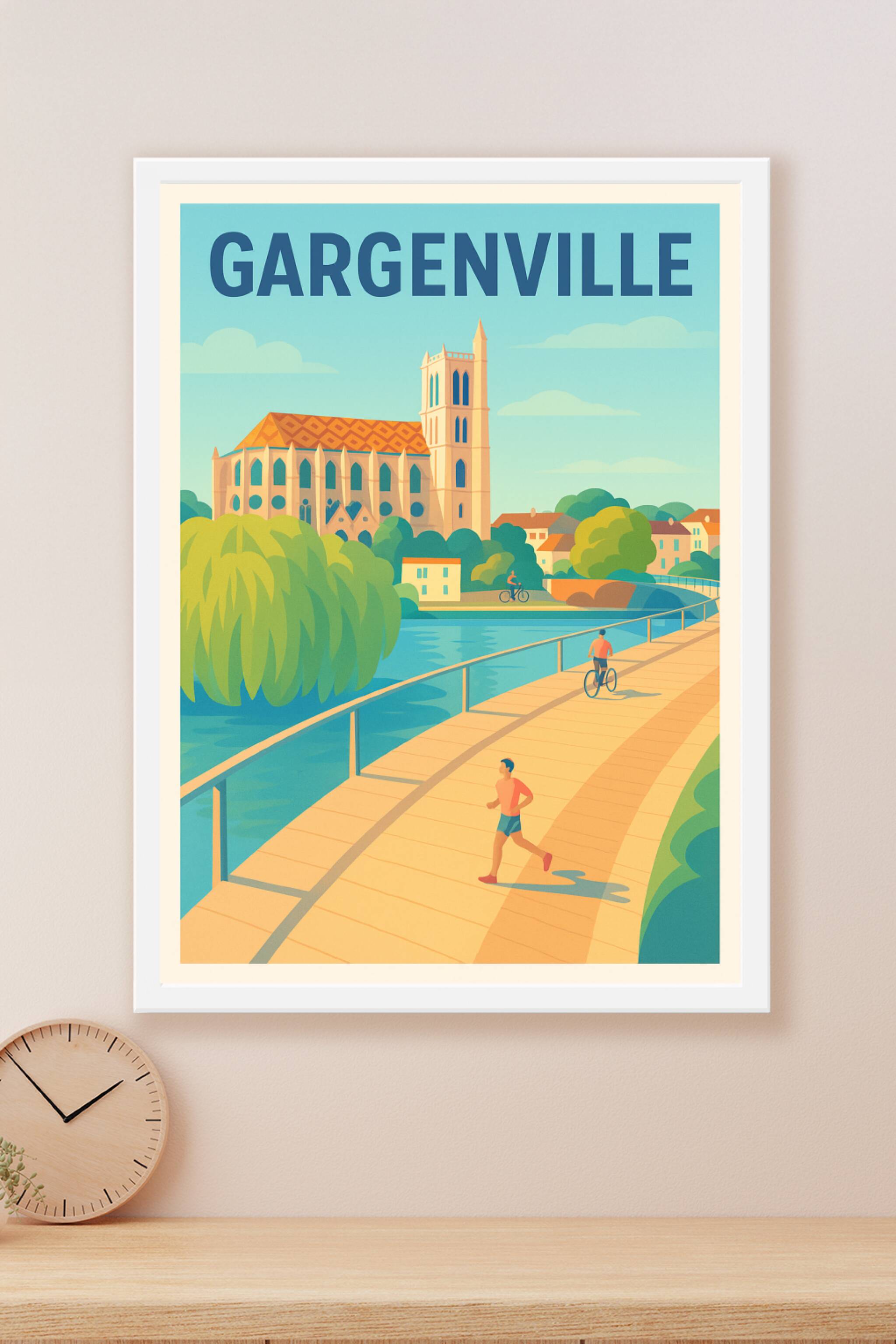 Découvrez l'élégance paisible de Gargenville avec cette affiche au design retro illustrant la ville et ses paysages emblématiques au bord de l'eau. Ce poster met en scène une promenade ensoleillée où cyclistes et joggeurs partagent un moment de tranquillité au cœur d'une nature luxuriante et d'architecture typique.Cette affiche est réalisée en tirage "Fine Art" de haute qualité sur papier 305g coton, assurant des couleurs vives et une durabilité exceptionnelle. Disponible en formats A1 à A4, avec ou sans cadre, ce poster est l'ajout parfait pour apporter une touche artistique et inspirante à votre intérieur. Fabrication 100% française pour un produit aussi authentique qu'esthétique.