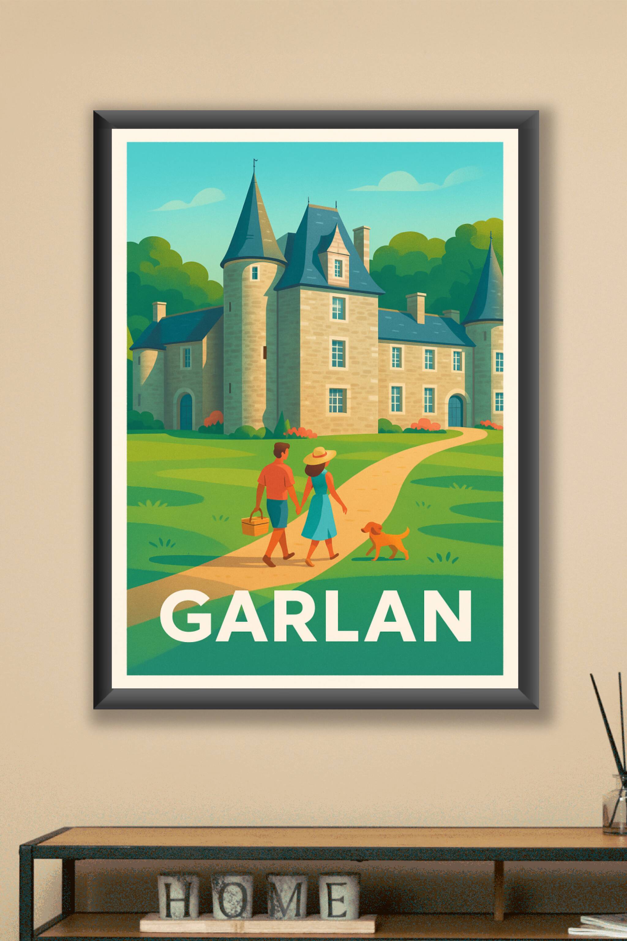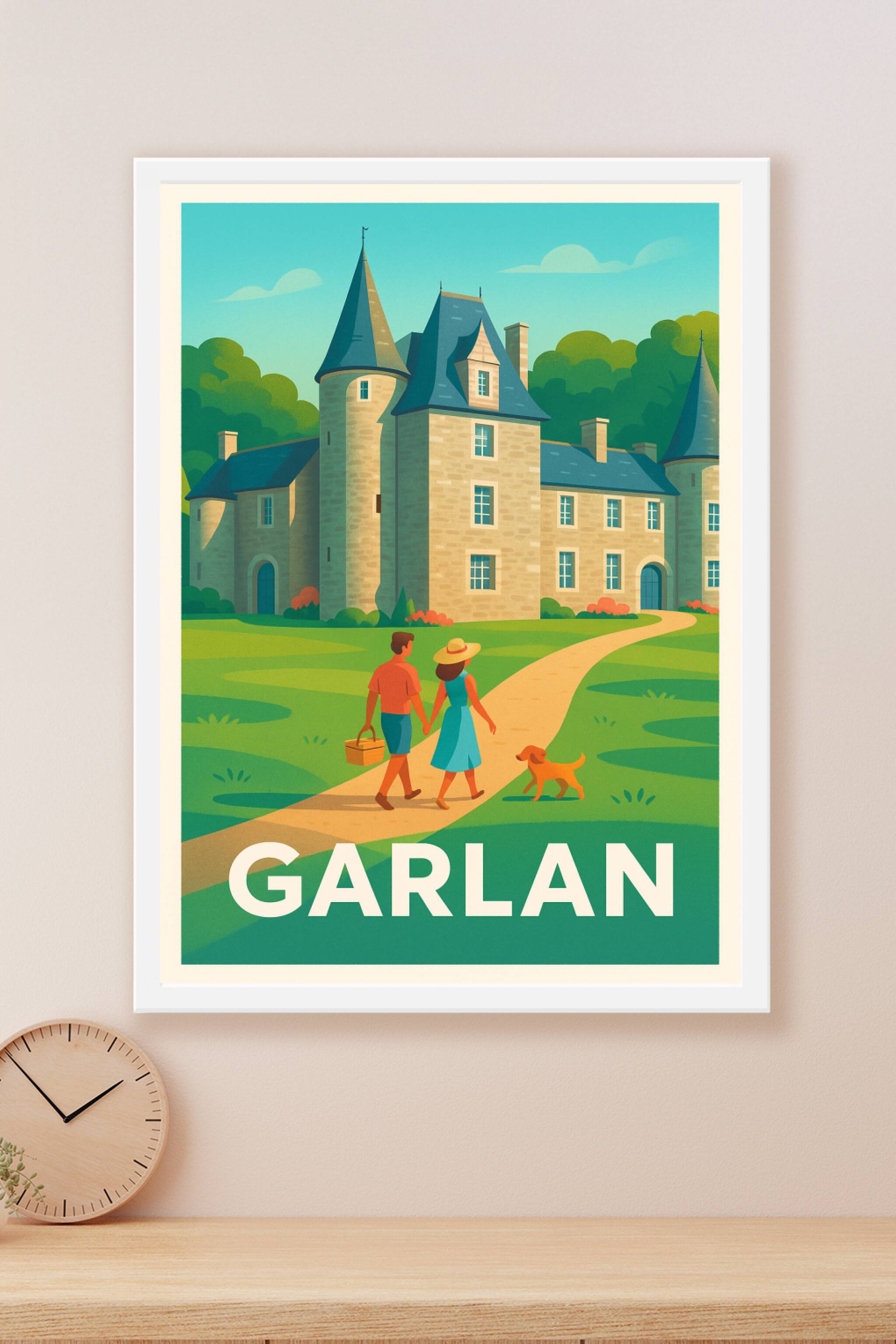 Découvrez la douceur et le charme de Garlan à travers cette affiche illustrée mettant en scène un couple et leur chien se promenant vers un majestu...
