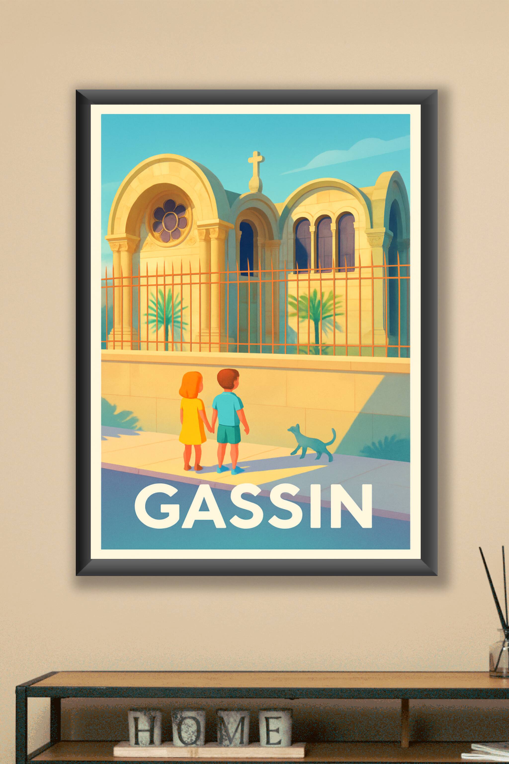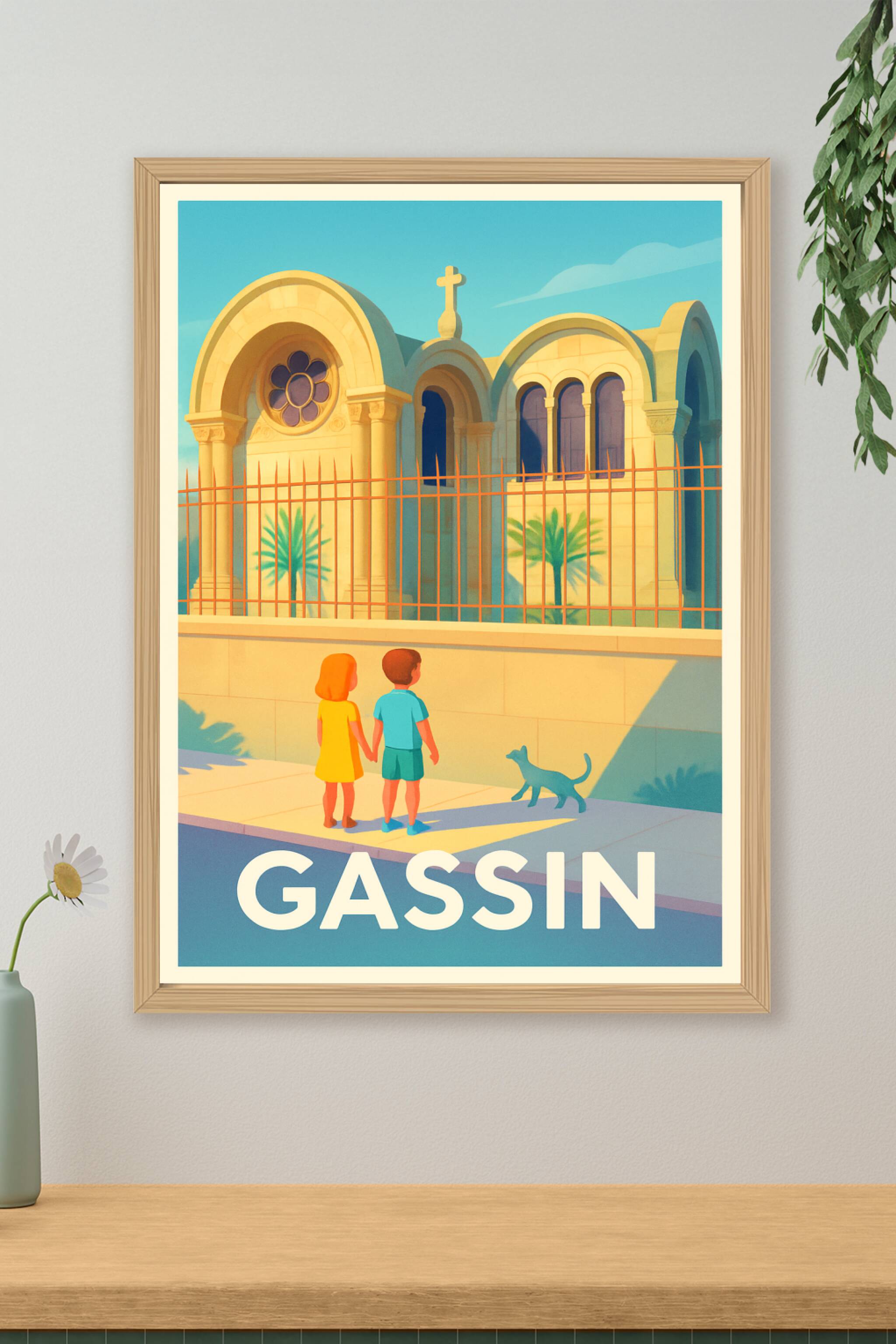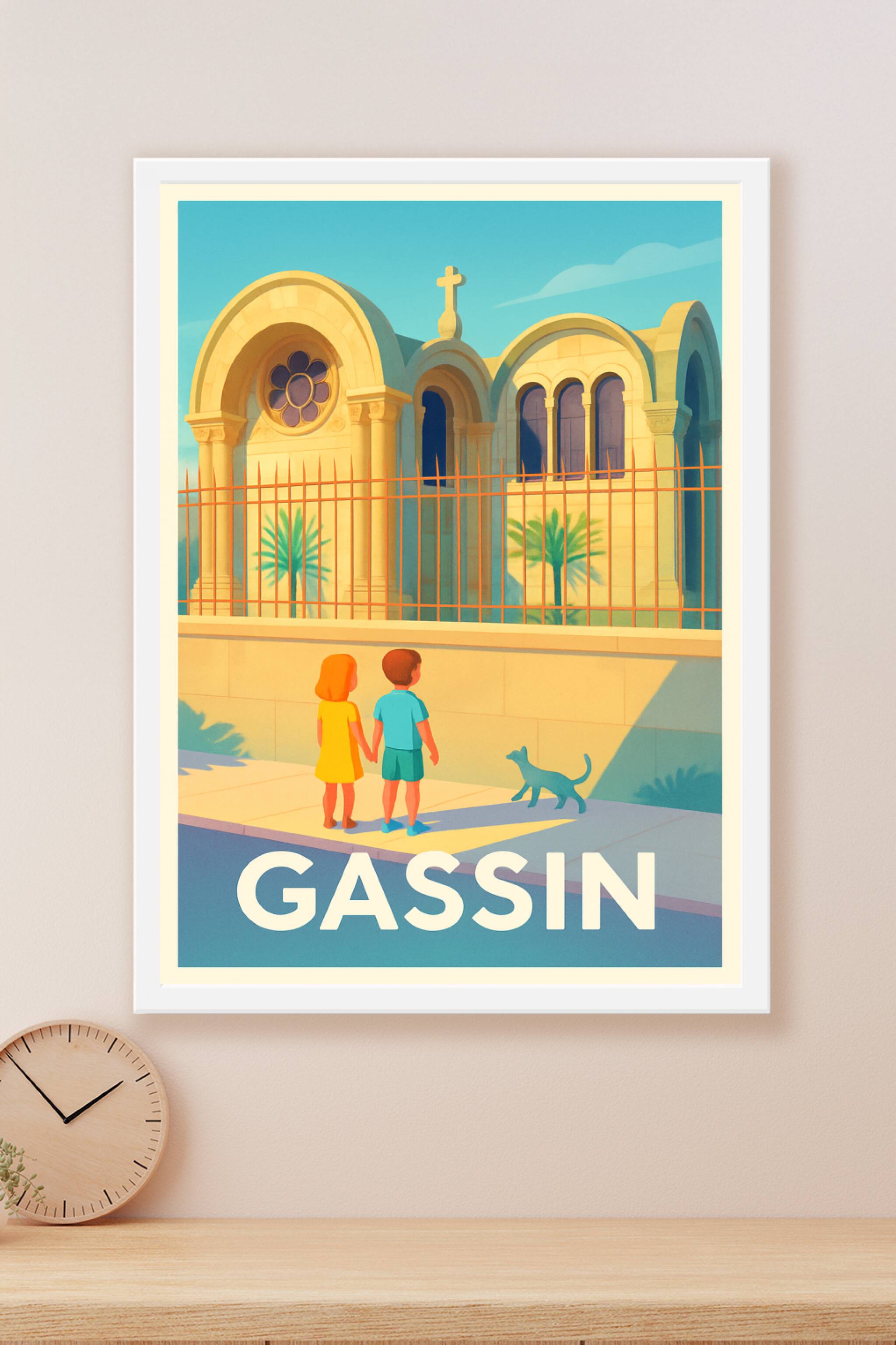 Découvrez le charme intemporel de Gassin avec cette affiche illustrée qui capture l'élégance de son architecture typique baignée par une lumière do...