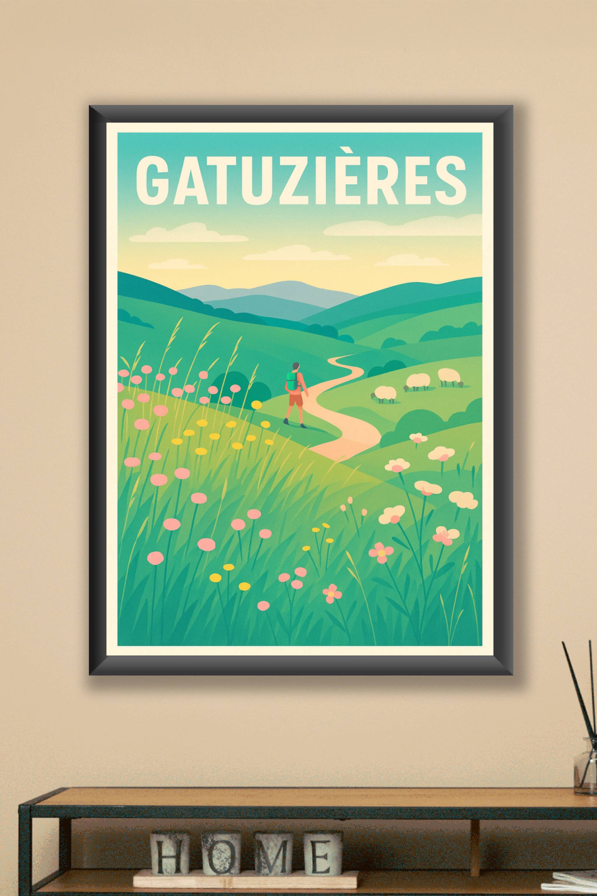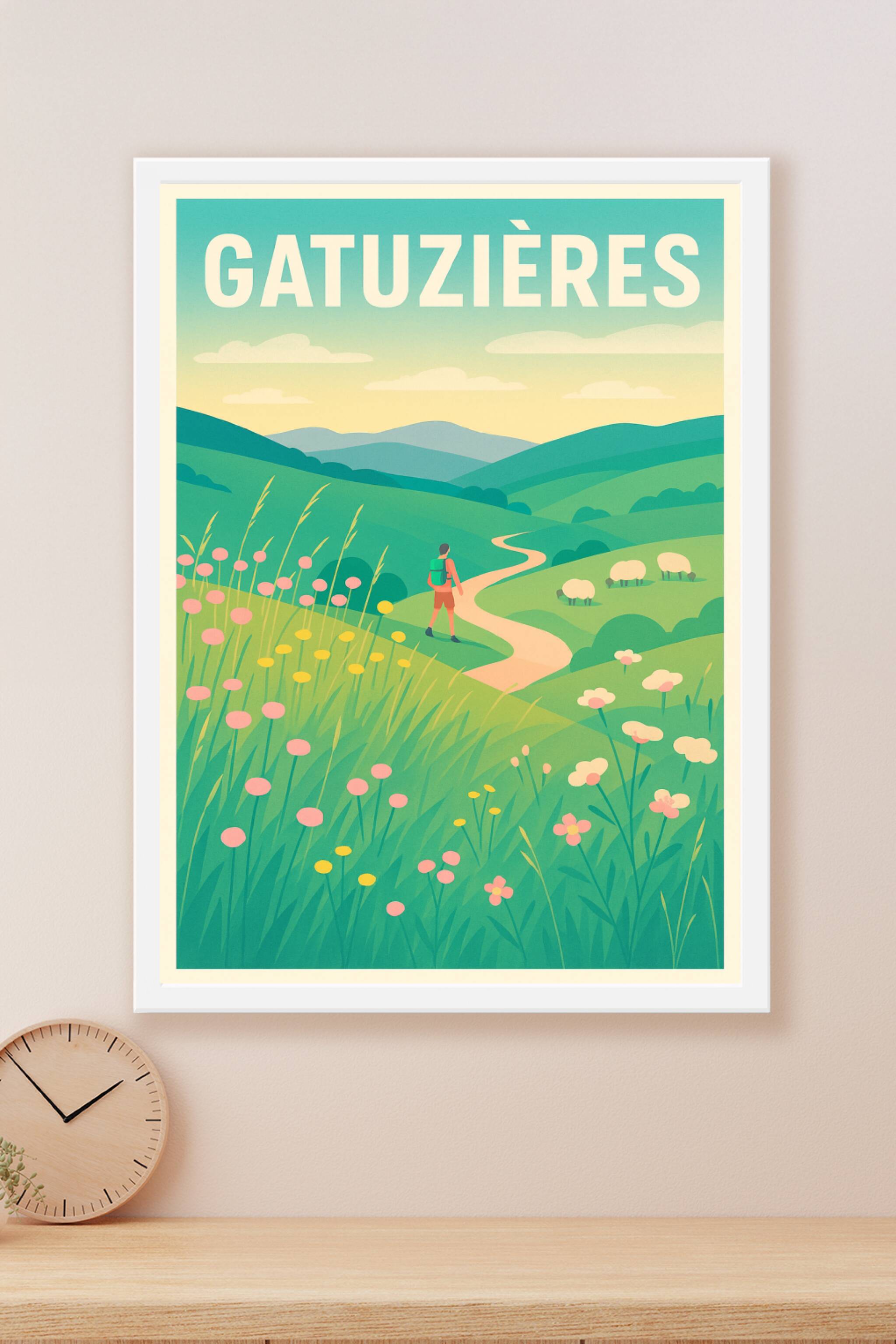 Découvrez la sérénité des paysages verdoyants de Gatuzières avec cette affiche illustrée mettant en scène un randonneur au cœur des collines, entou...