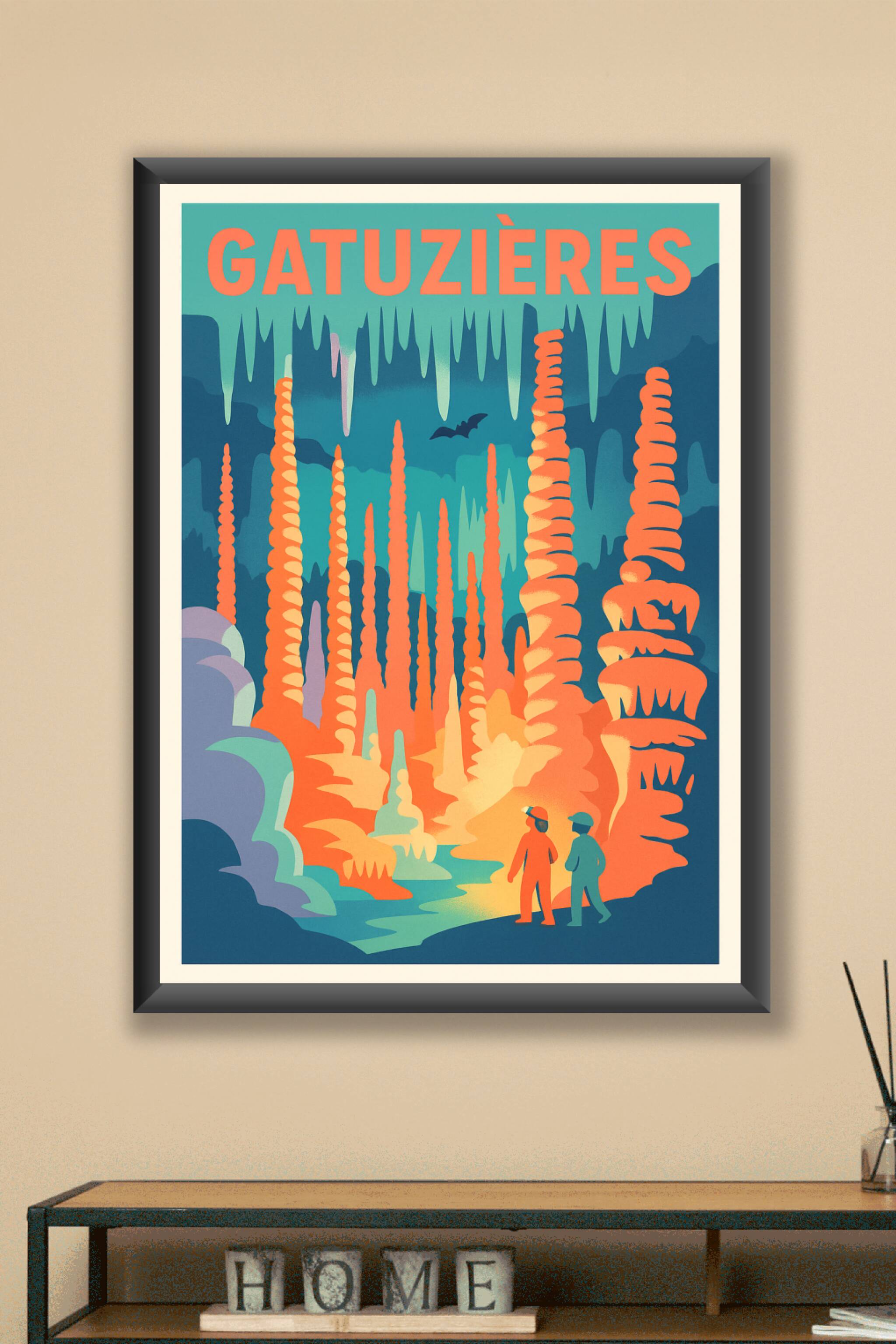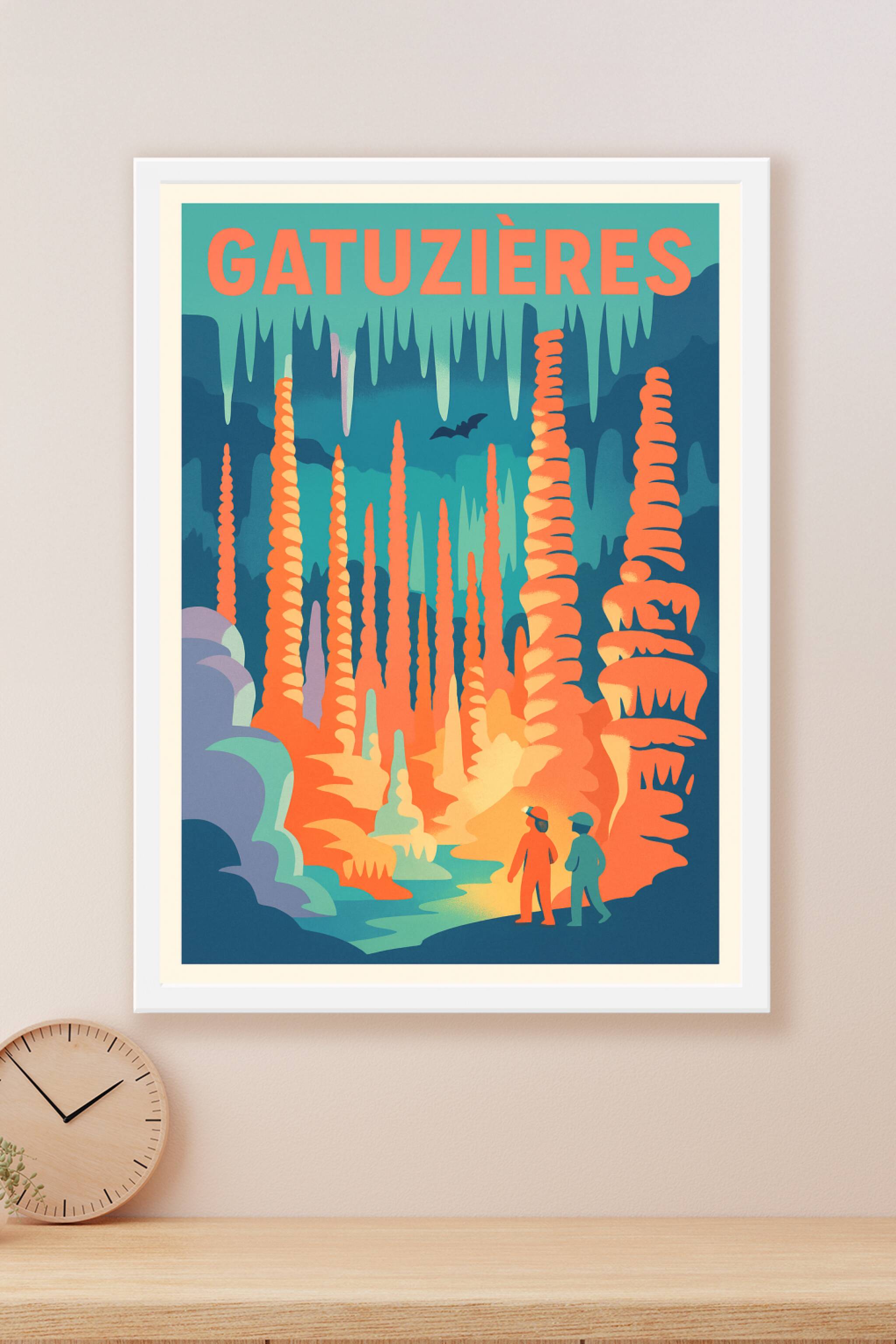 Découvrez la magie souterraine de Gatuzières avec cette affiche au style rétro illustrant les merveilles des grottes et stalagmites colorées. Cette...