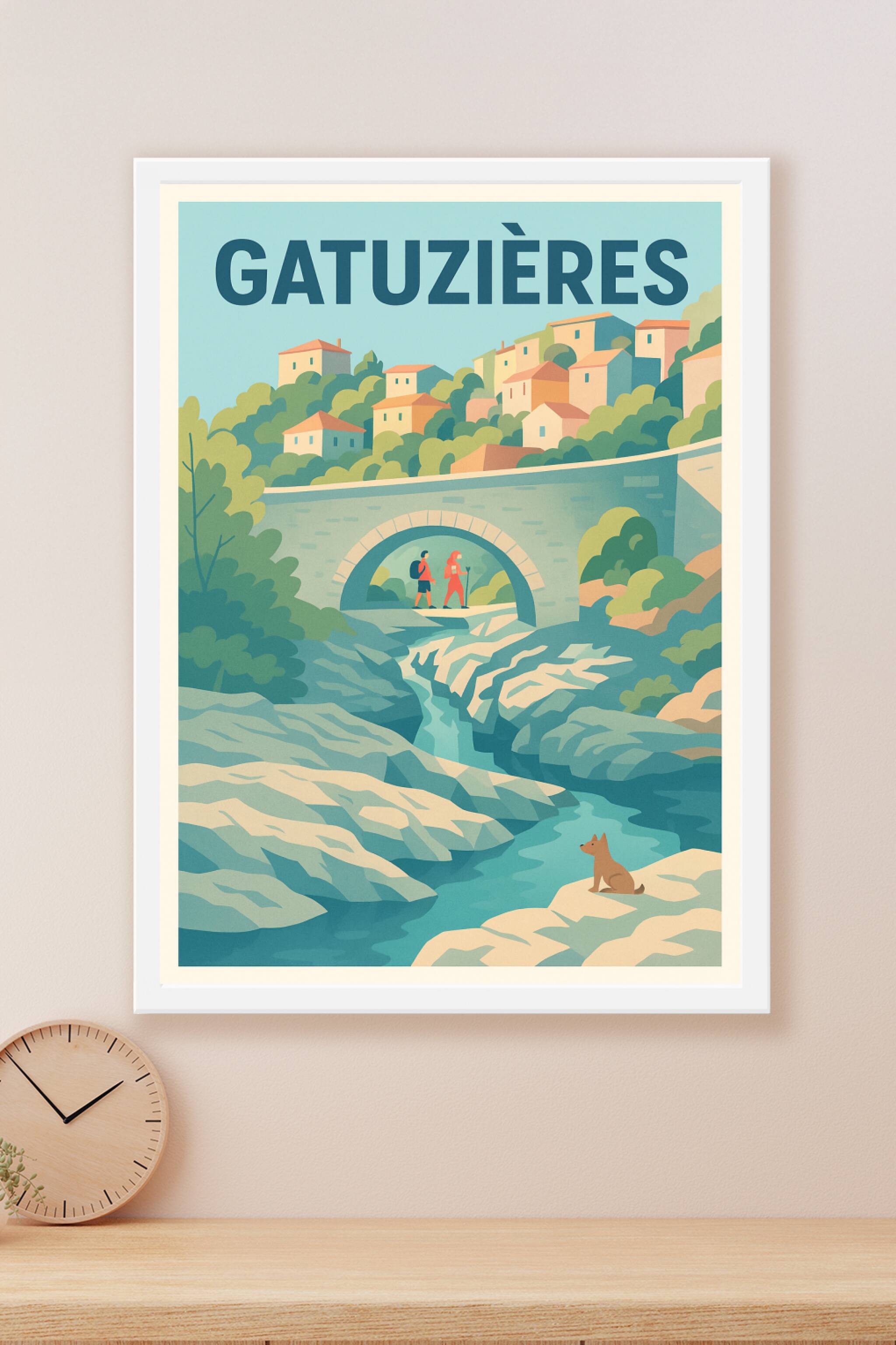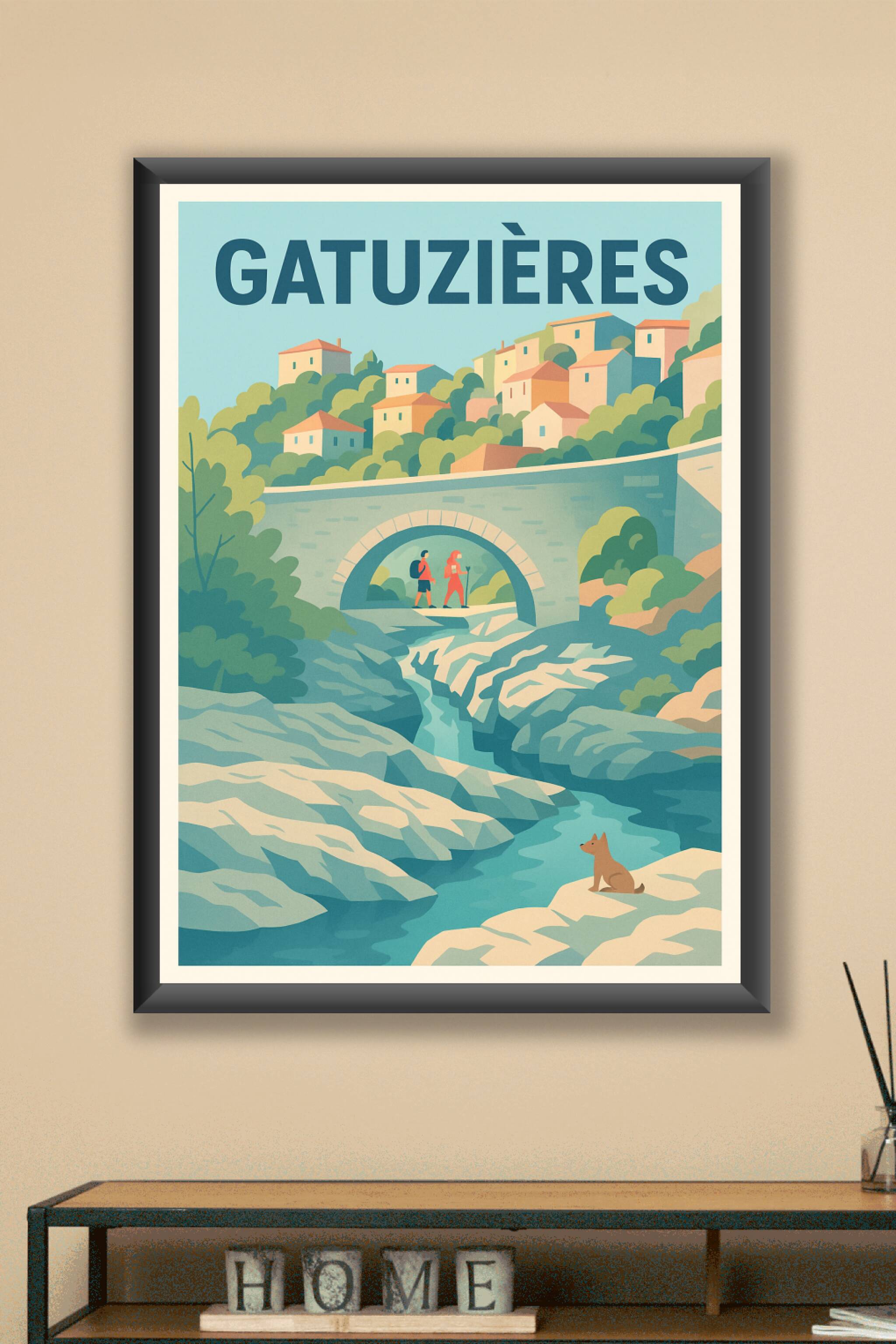 Découvrez la beauté authentique de Gatuzières avec cette affiche illustrée au style doux et épuré, représentant un paysage naturel où la randonnée ...