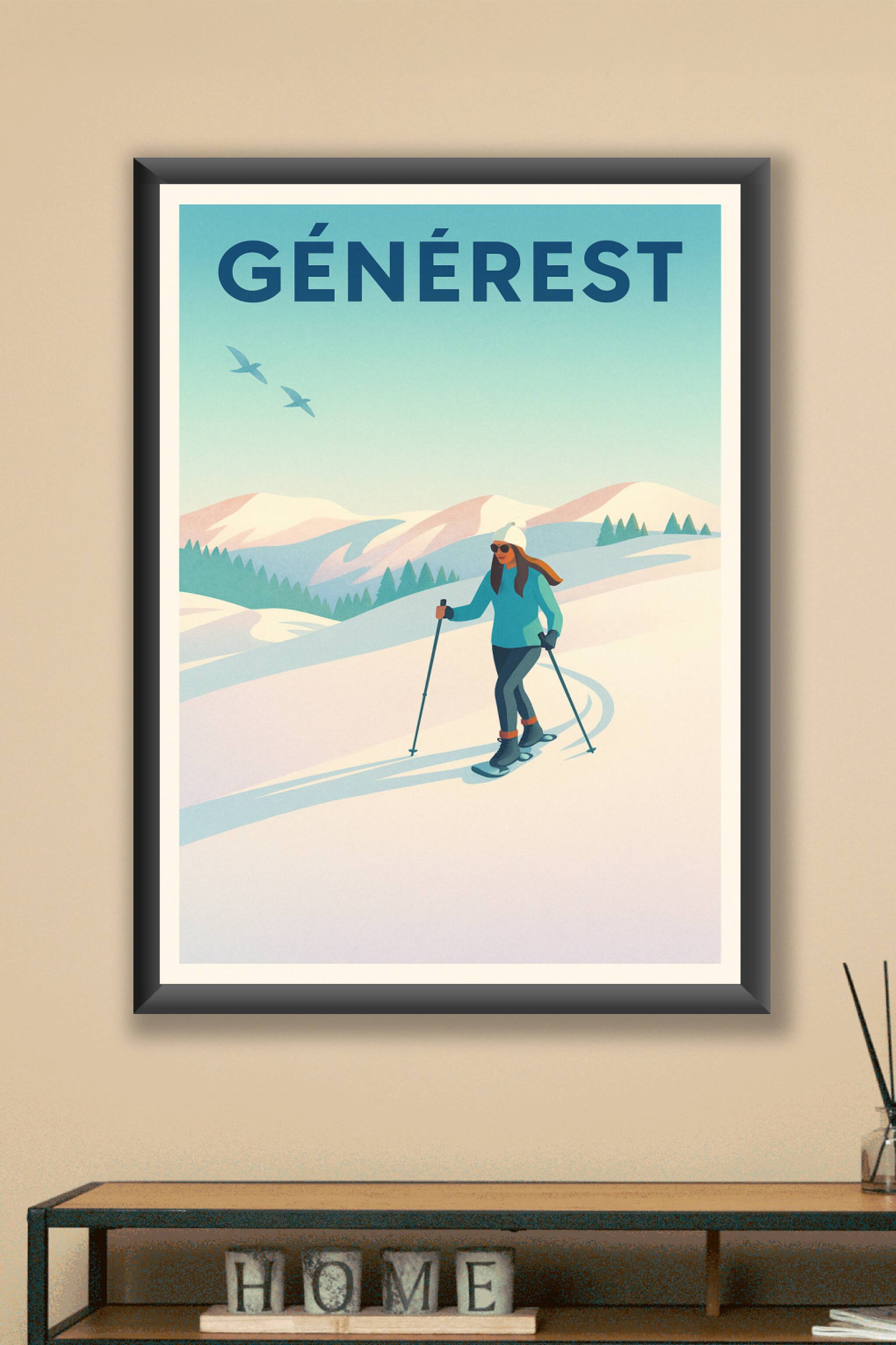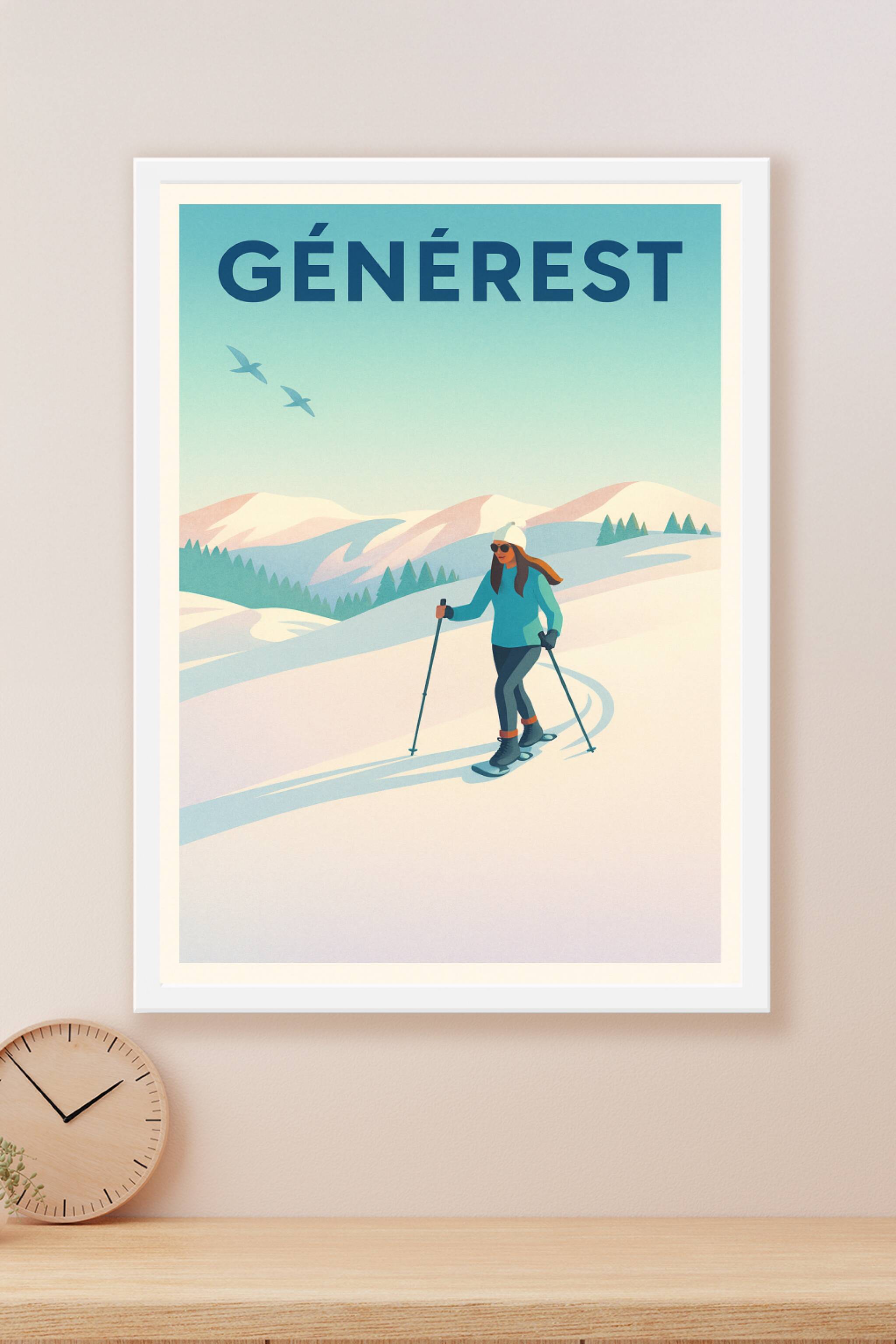 Découvrez la beauté apaisante des paysages enneigés de Générest avec cette affiche élégante mettant en scène une randonneuse en raquettes au cœur d...