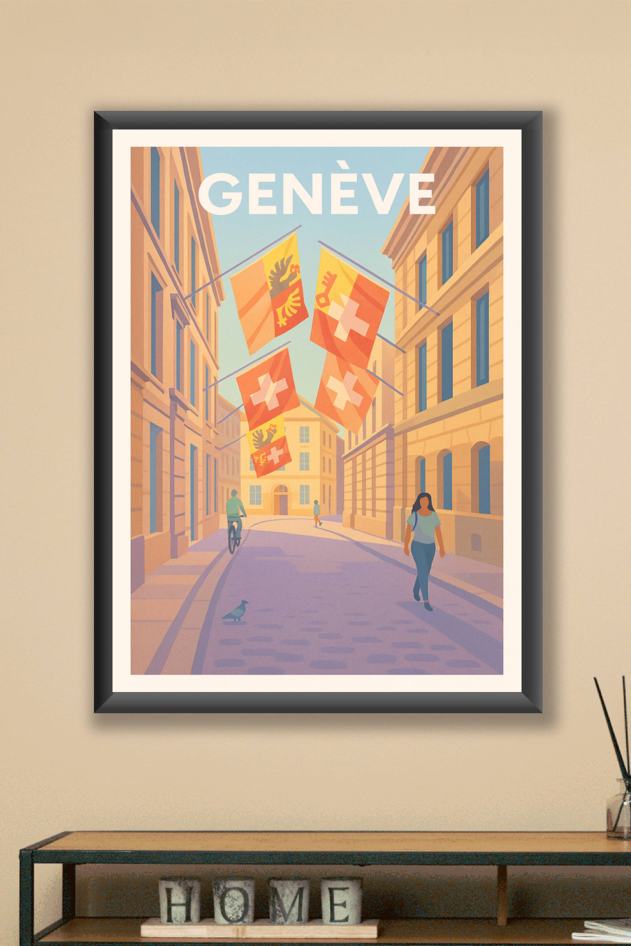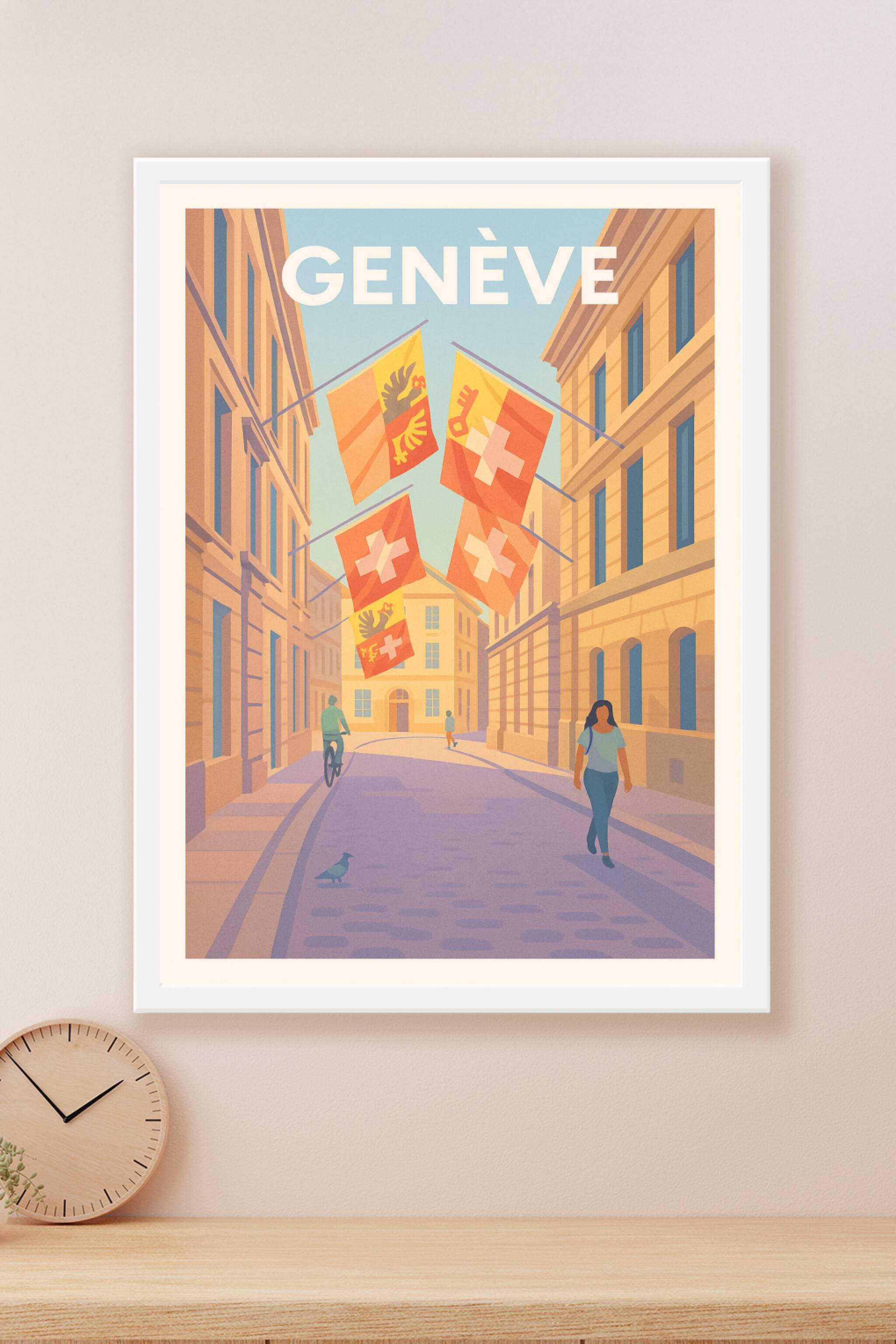 Découvrez cette affiche illustrée qui capture avec douceur l'élégance urbaine de Genève, où les drapeaux suisses flottent au-dessus des ruelles pai...