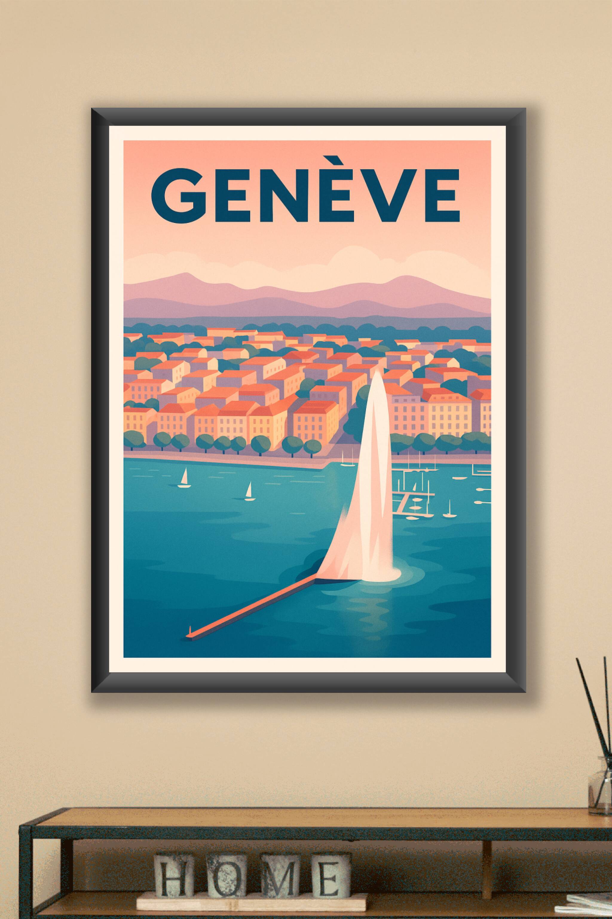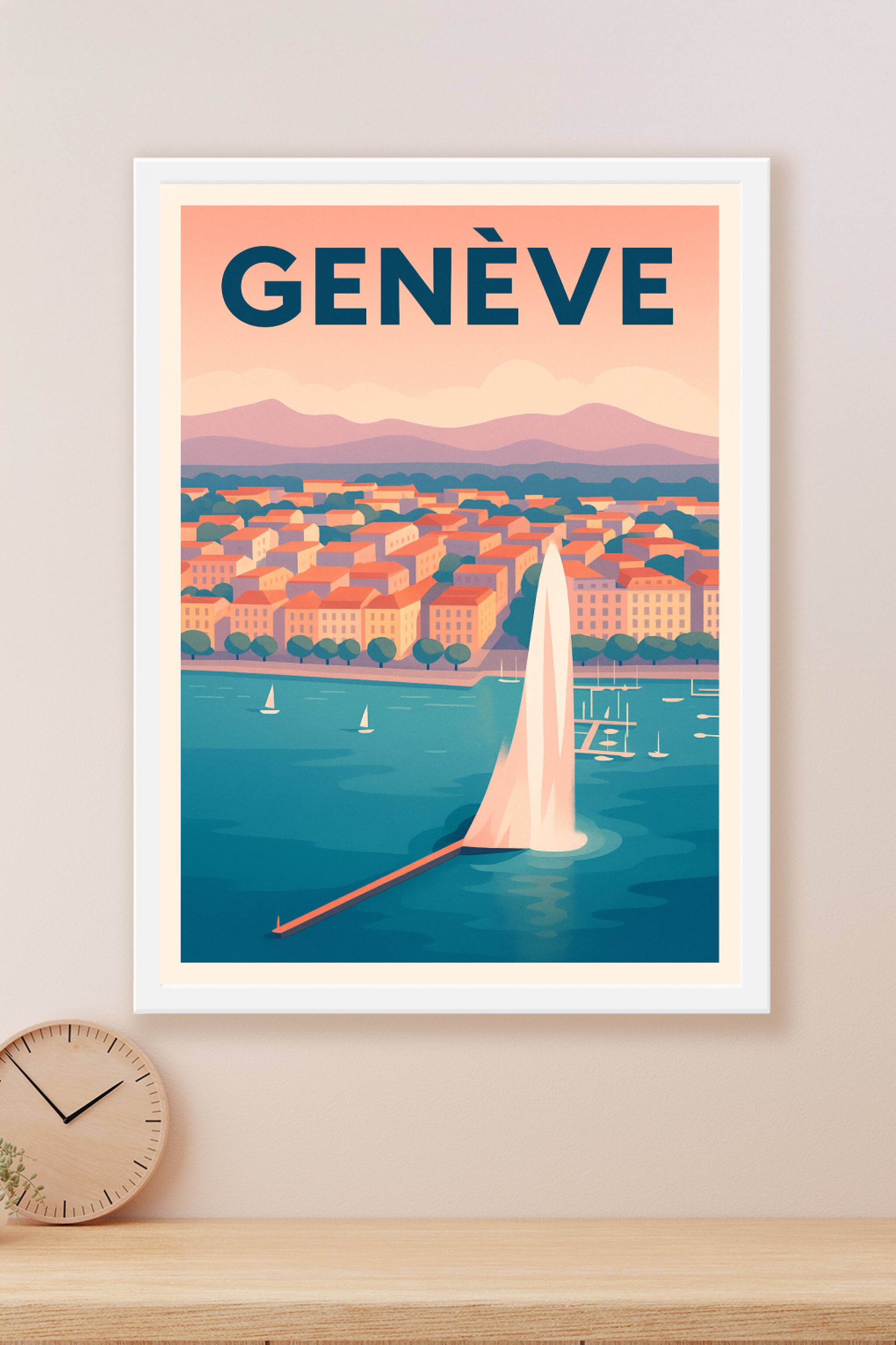 Découvrez l'élégance paisible de Genève avec cette superbe affiche illustrant le célèbre jet d'eau sur le lac Léman, entouré des toits colorés et d...