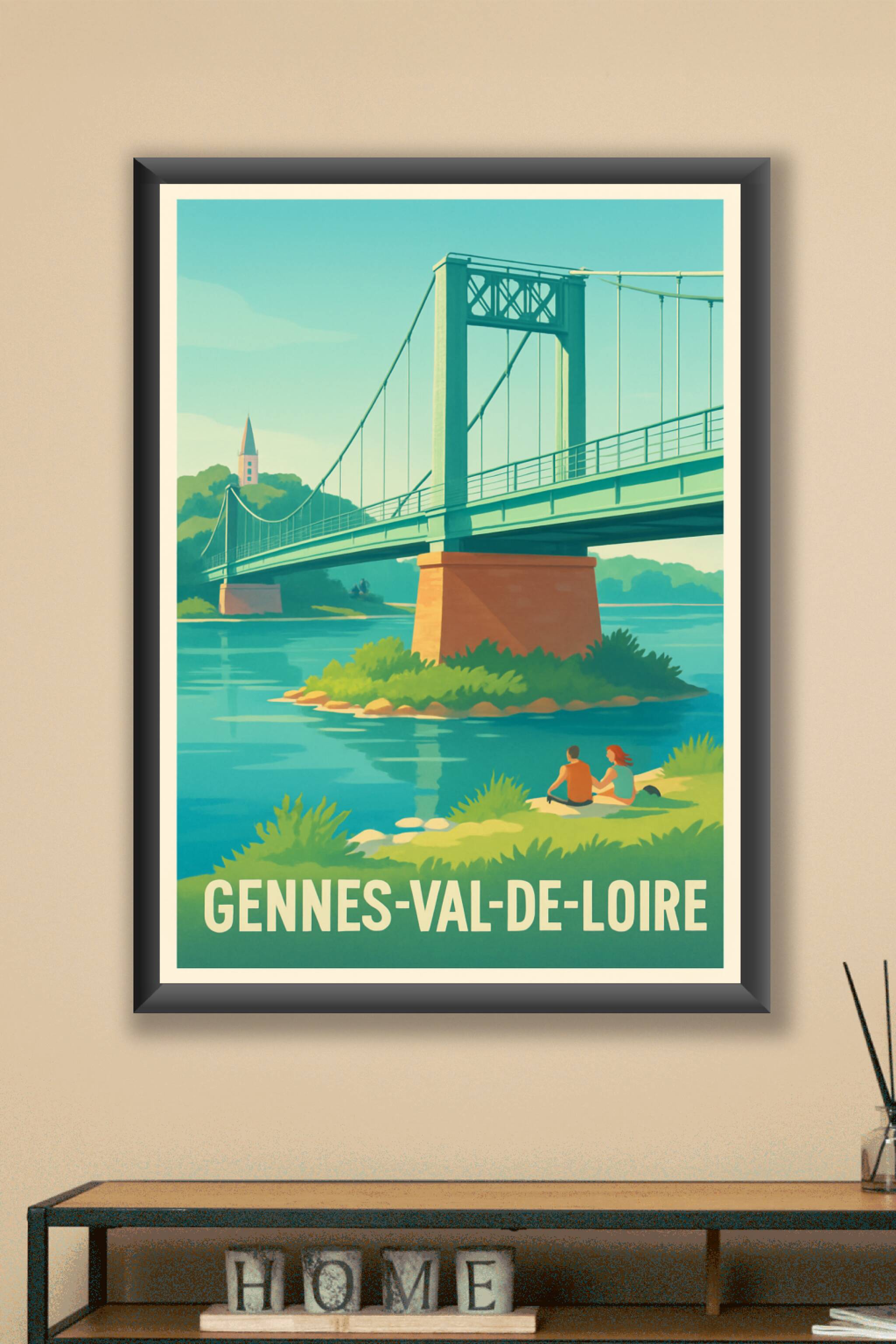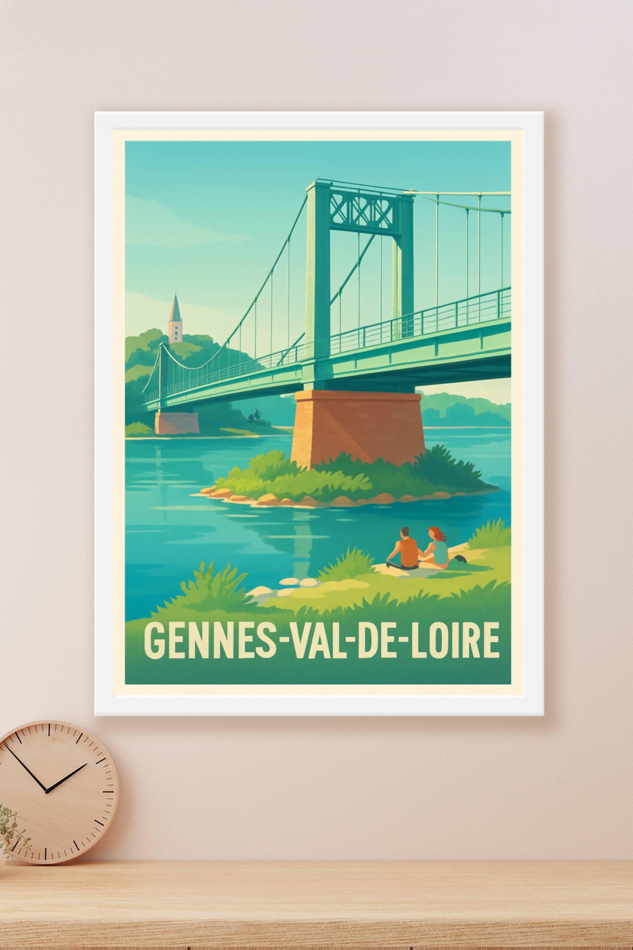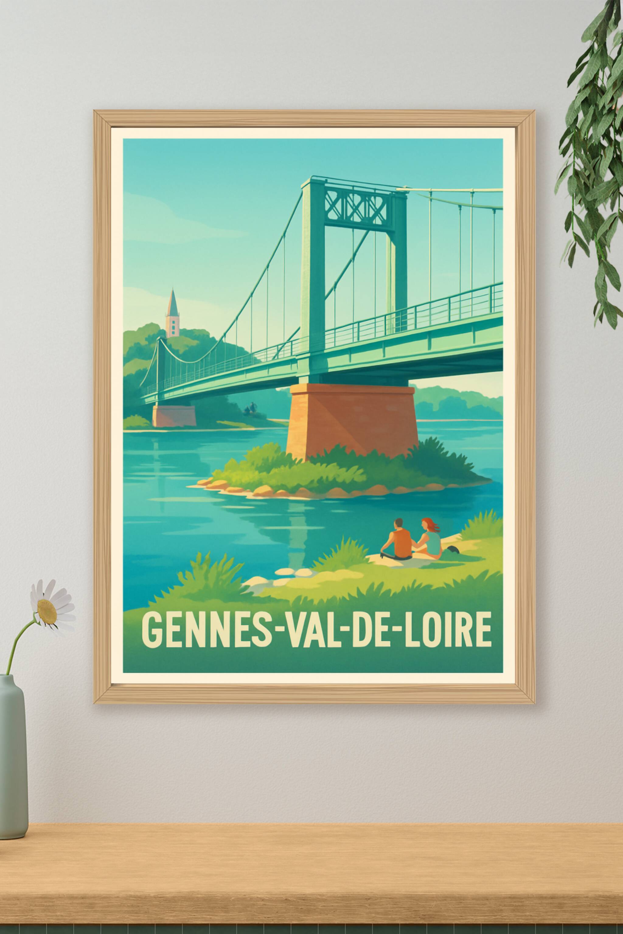 Découvrez la douceur de vivre à Gennes-Val-de-Loire avec cette affiche rétro mettant en scène le pont suspendu emblématique et ses alentours paisib...