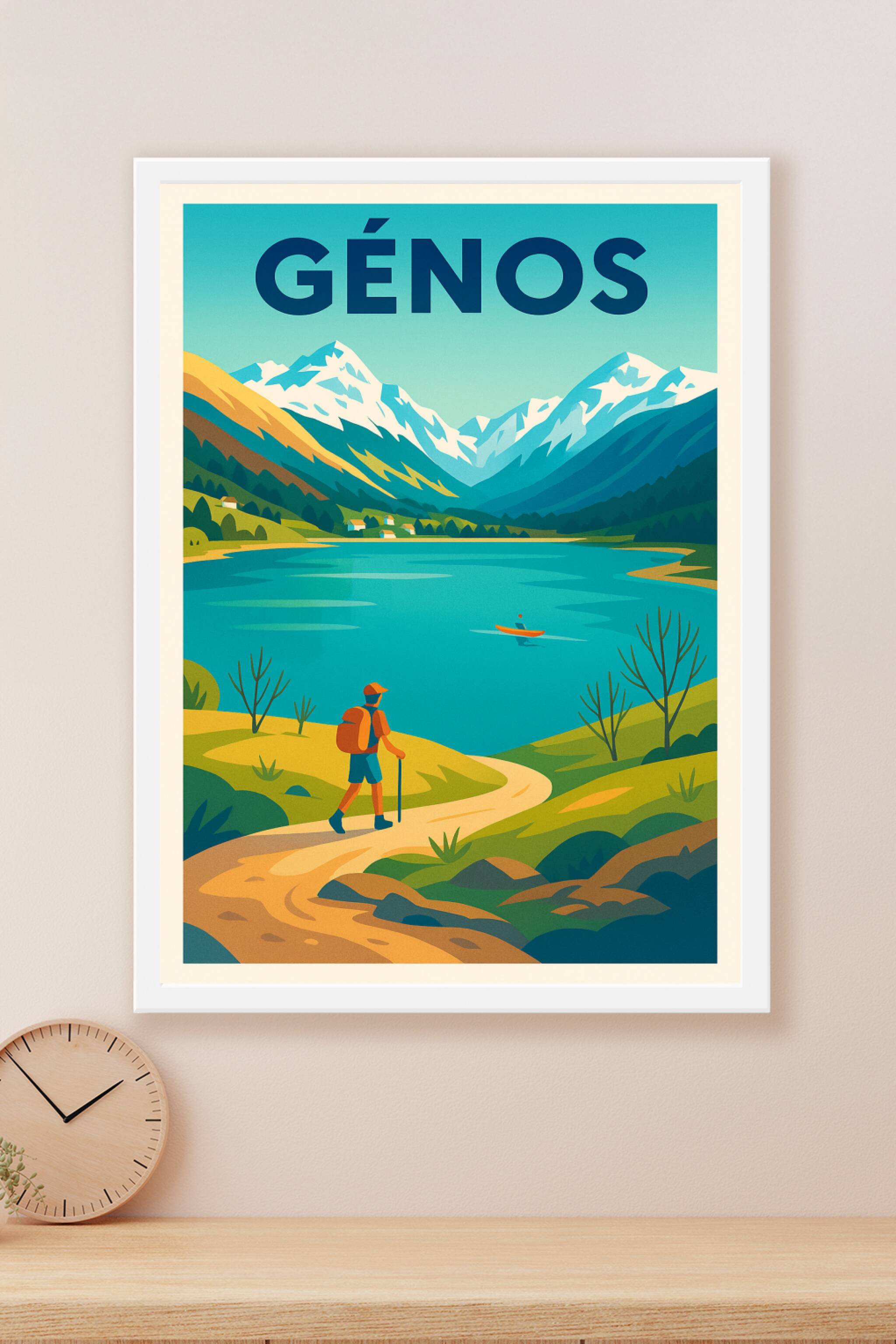 Découvrez la sérénité et la beauté naturelle de Génos avec cette affiche au style illustratif et coloré. Cette scène paisible met en avant un paysa...