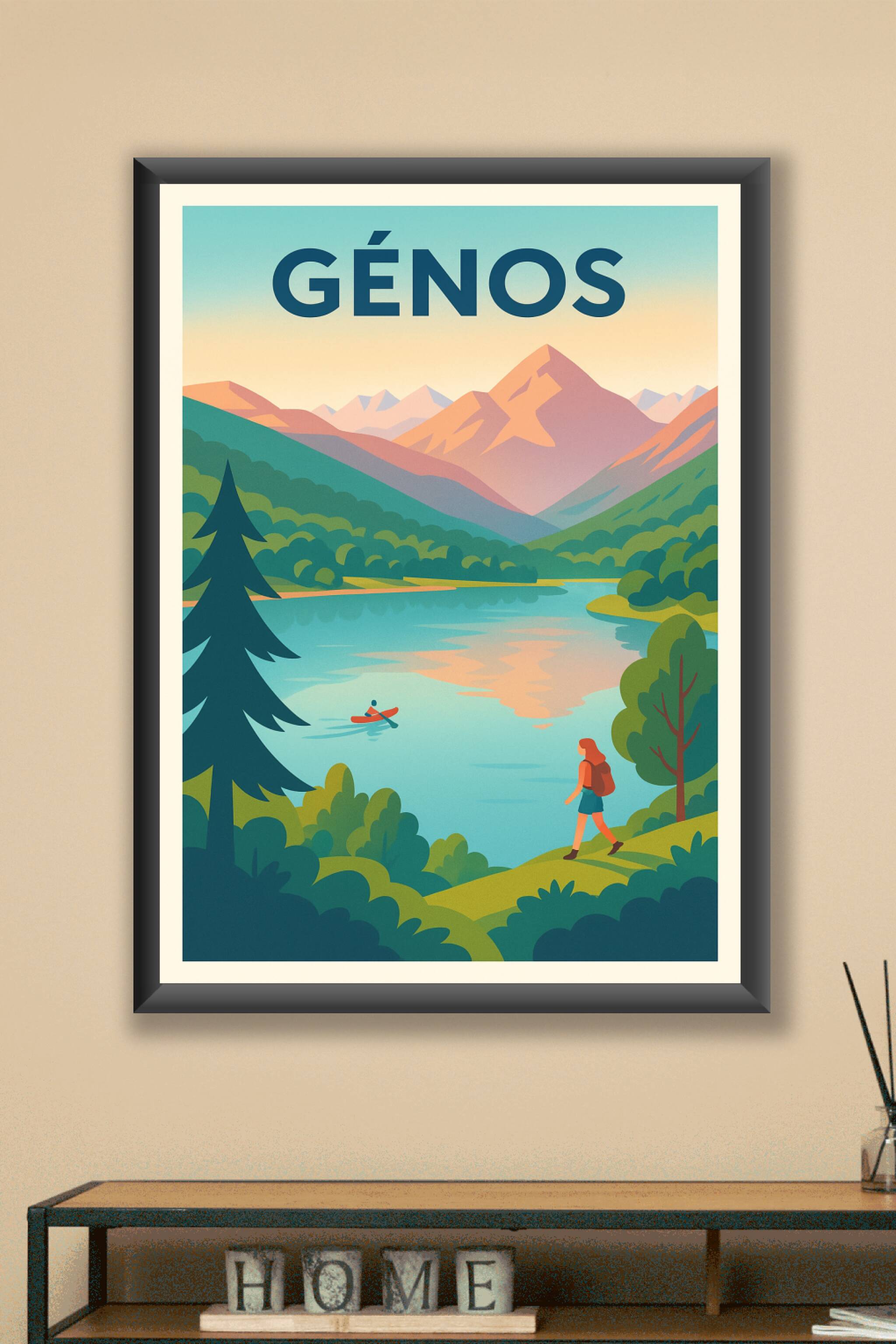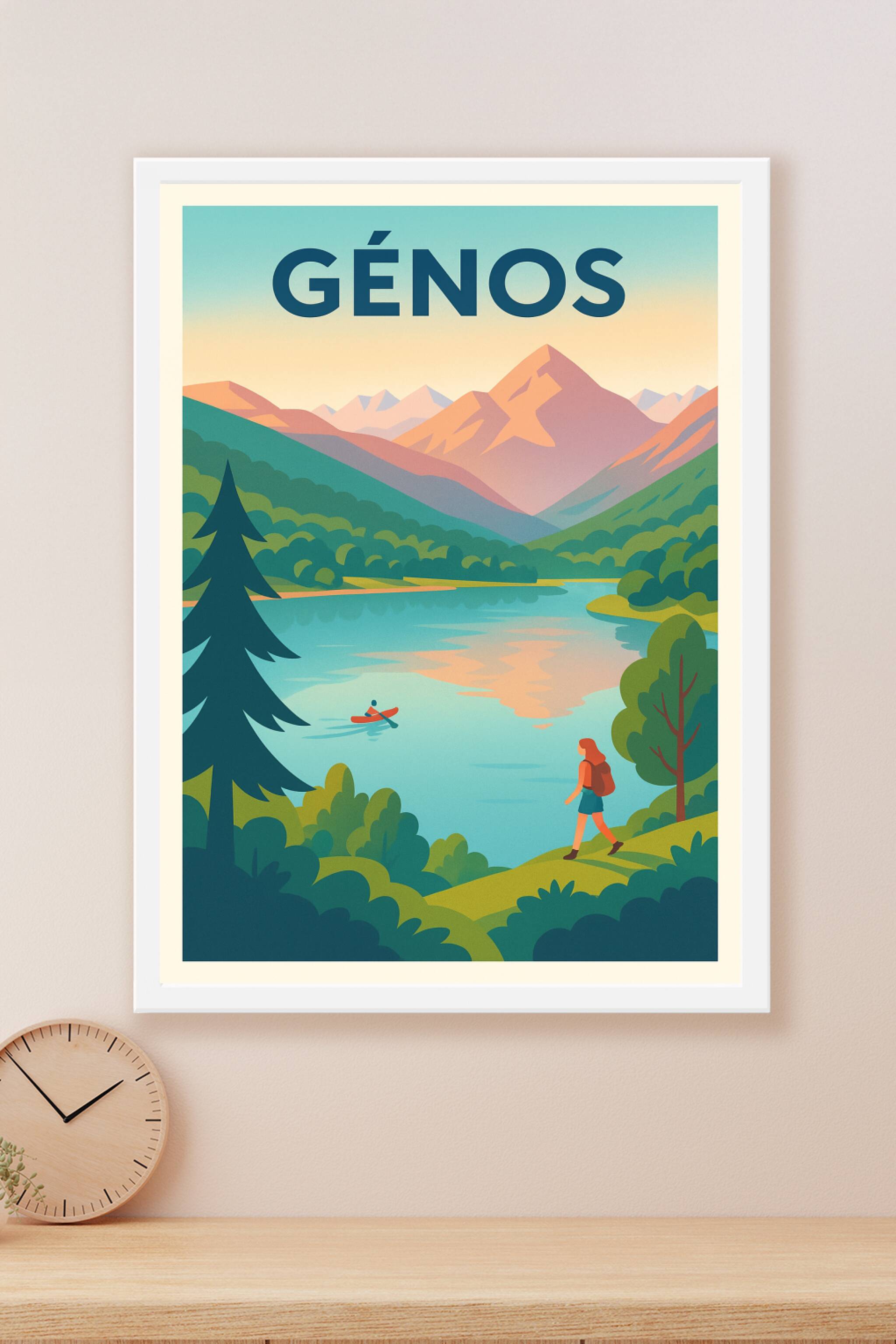 Découvrez la sérénité et la beauté sauvage de Génos à travers cette affiche illustrée au style vintage moderne, où un lac paisible se mêle aux mont...