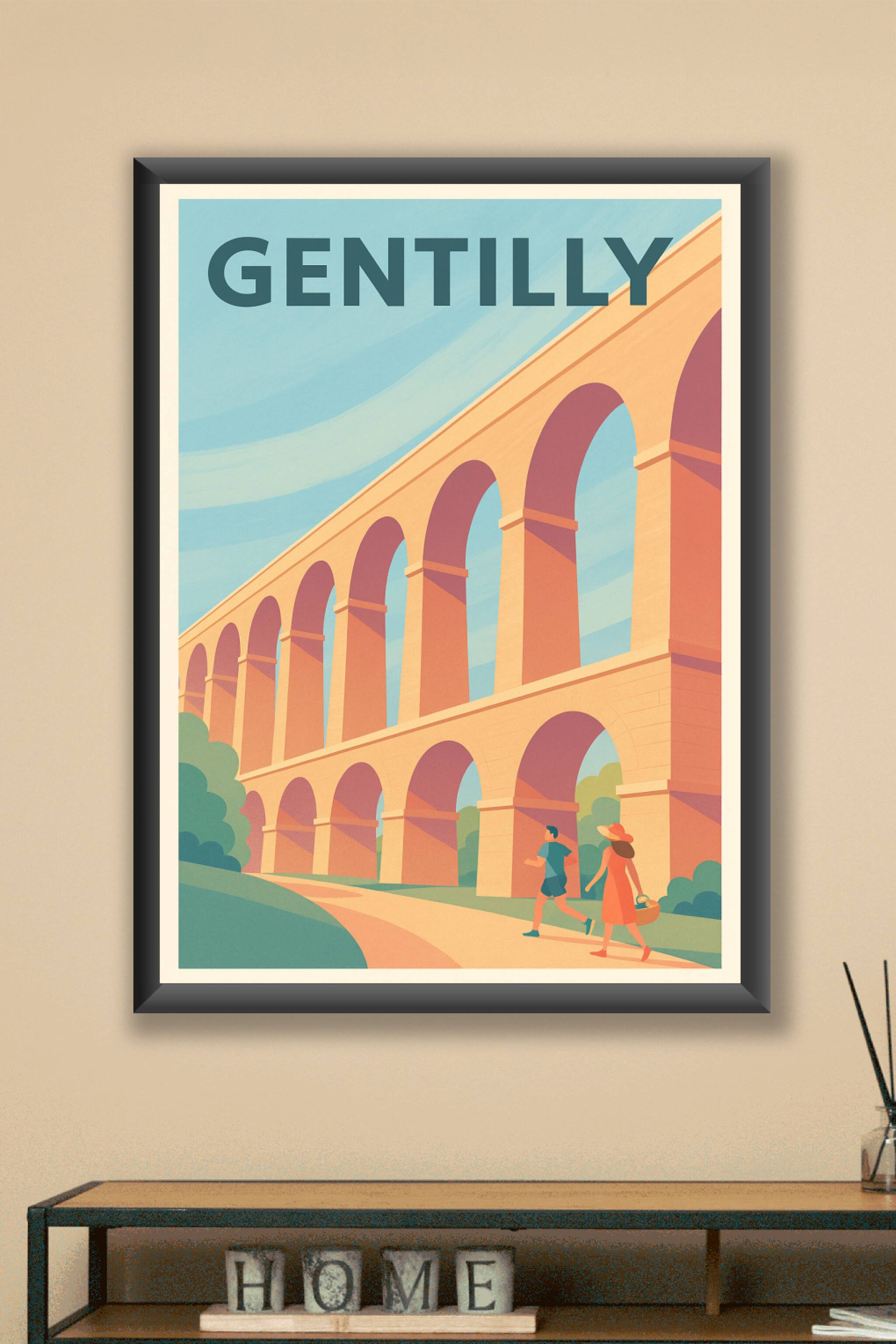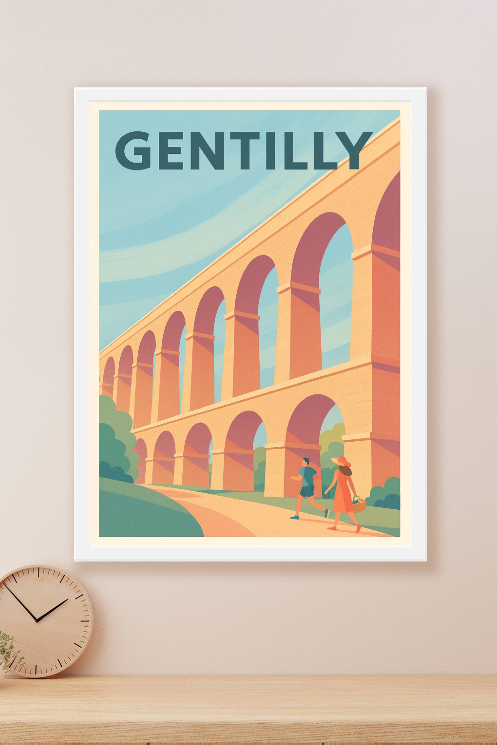 Découvrez l'élégance du patrimoine de Gentilly avec cette affiche illustrée présentant un aqueduc majestueux sous un ciel ensoleillé. Ce poster inv...
