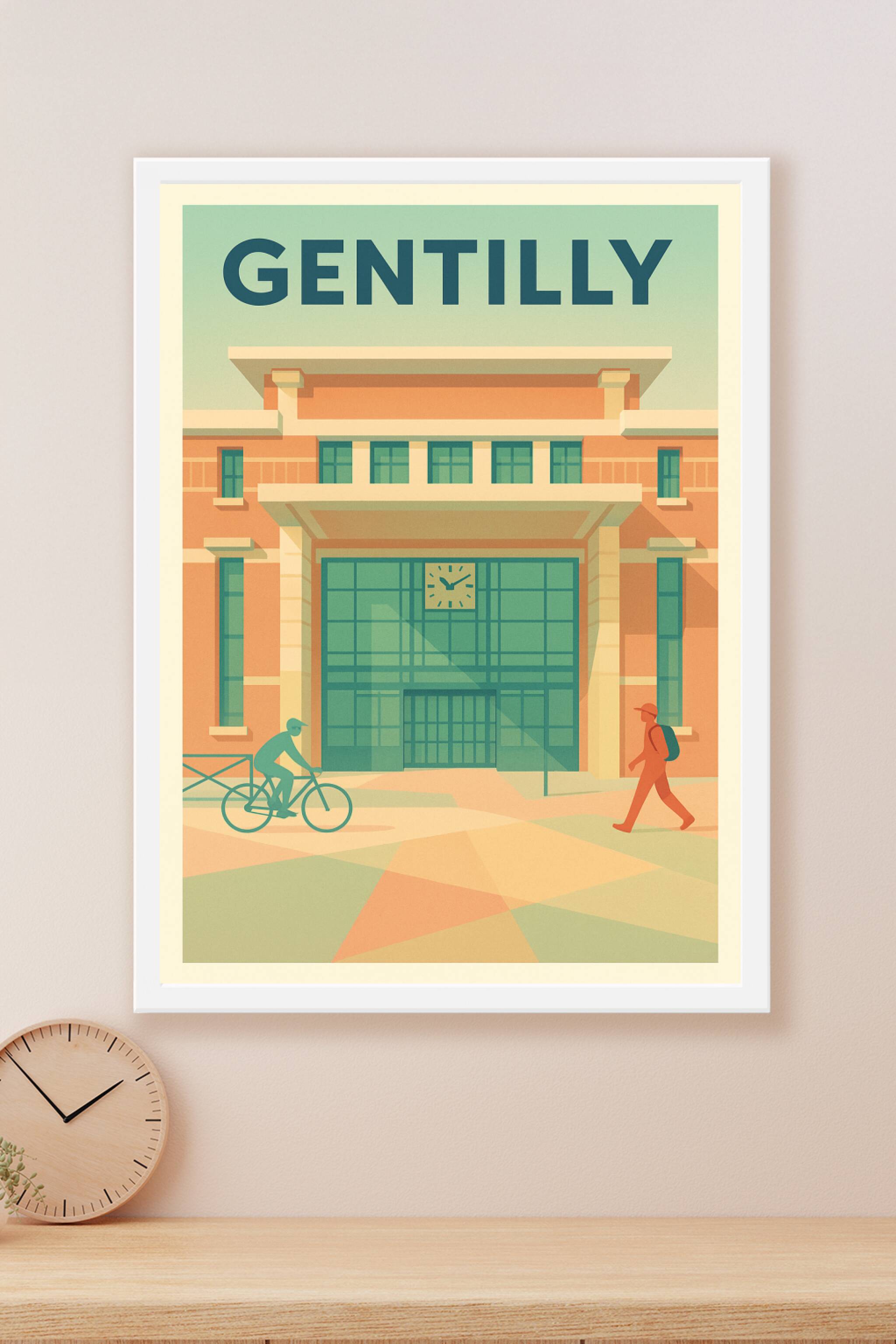 Découvrez cette affiche au style rétro illustrant un bâtiment emblématique de Gentilly, baigné d'une douce lumière matinale. Cette scène urbaine simple et apaisante, avec un cycliste et un piéton en mouvement, capte l'essence tranquille et dynamique à la fois de cette ville. Disponible en tirage "Fine Art" de haute qualité sur papier 305g coton, ce poster aux couleurs douces et harmonieuses fera un ajout parfait à votre décoration intérieure ou une idée cadeau unique. Choisissez votre format idéal parmi A1 à A4, avec ou sans cadre, pour sublimer vos murs avec une touche vintage et raffinée, 100% fabriquée en France.