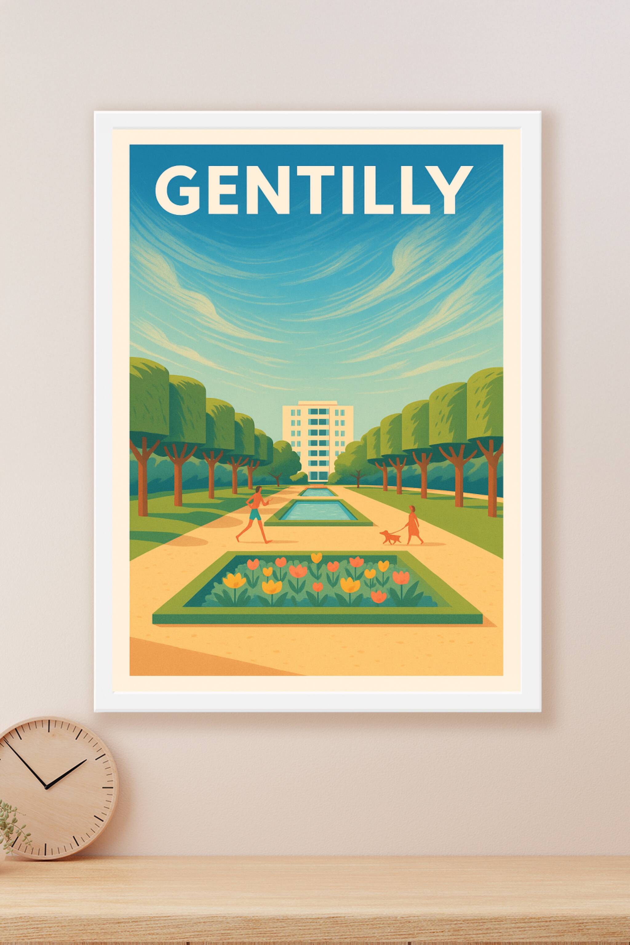 Découvrez la douceur de la vie urbaine avec ce poster illustré représentant une promenade paisible dans les jardins de Gentilly, bordés d'arbres ta...